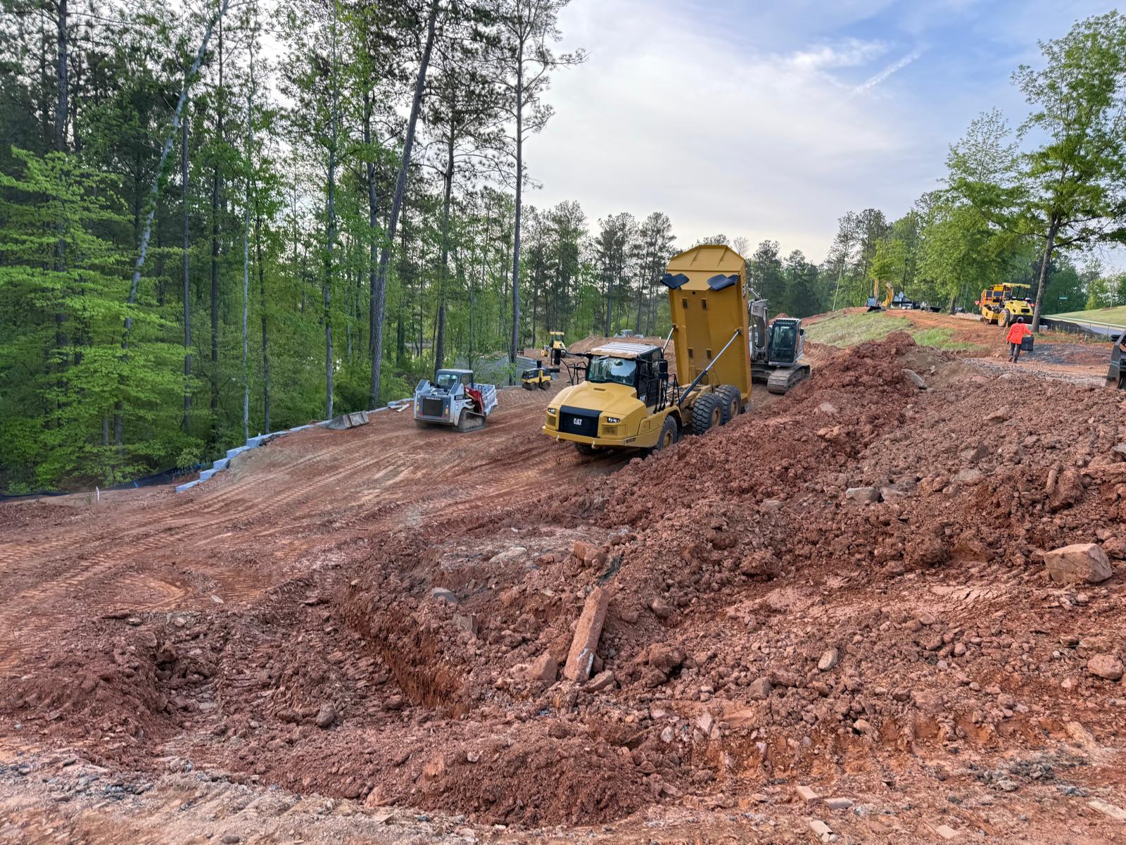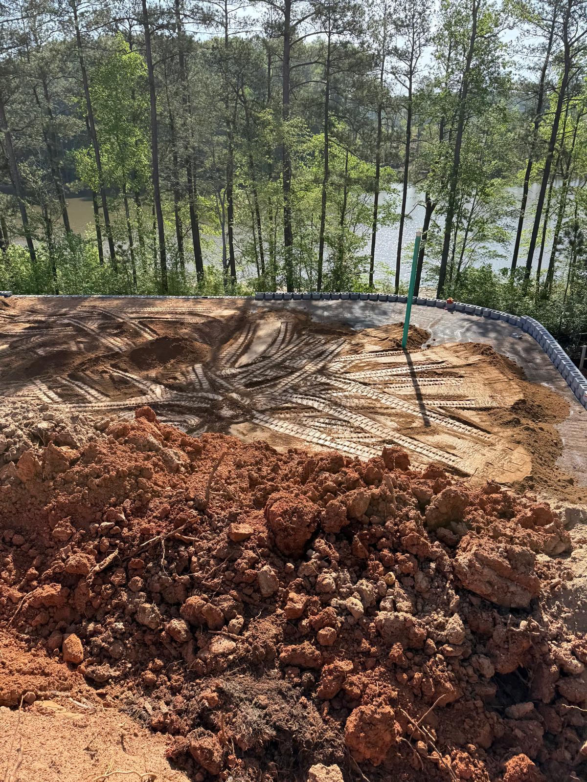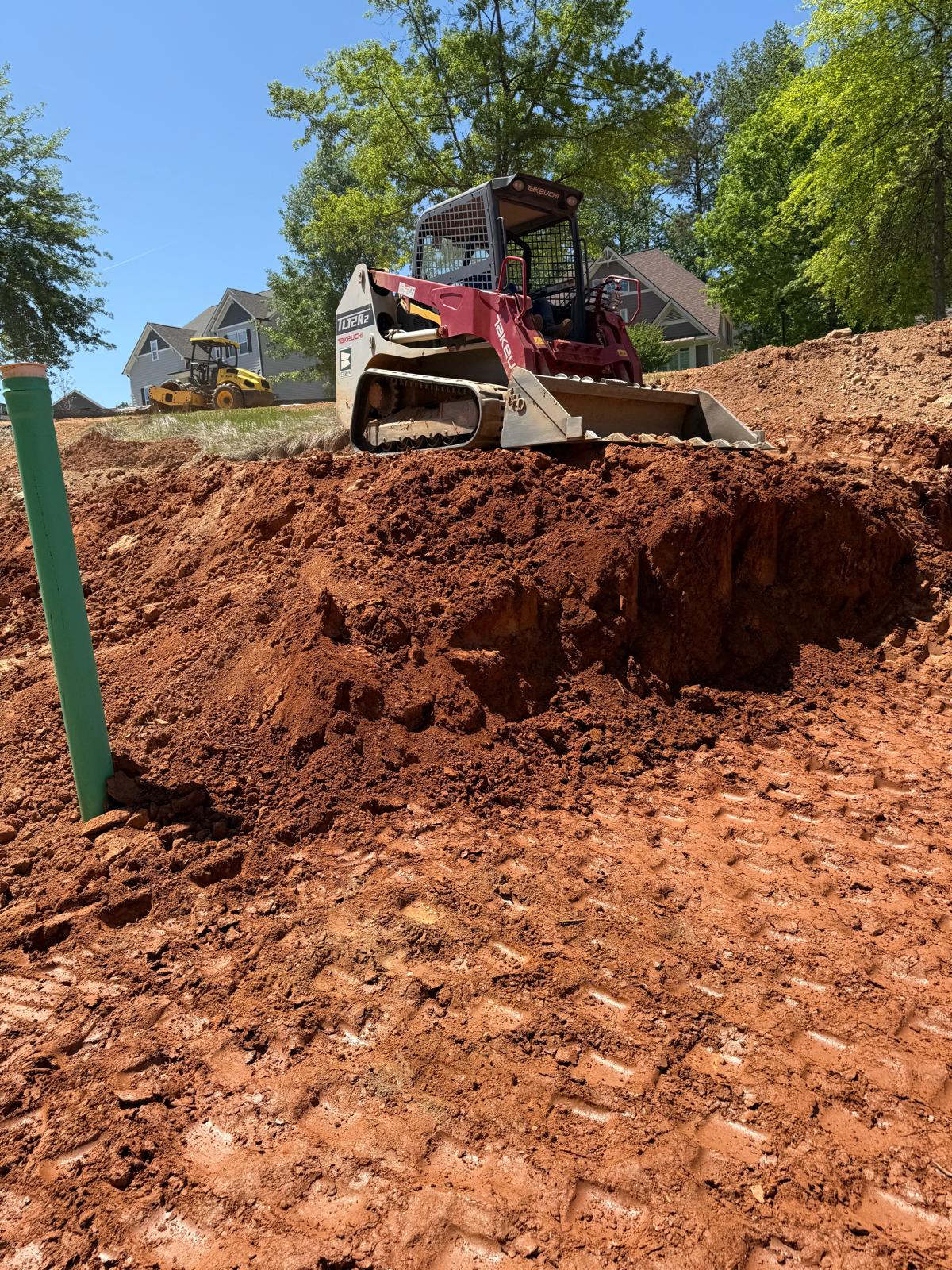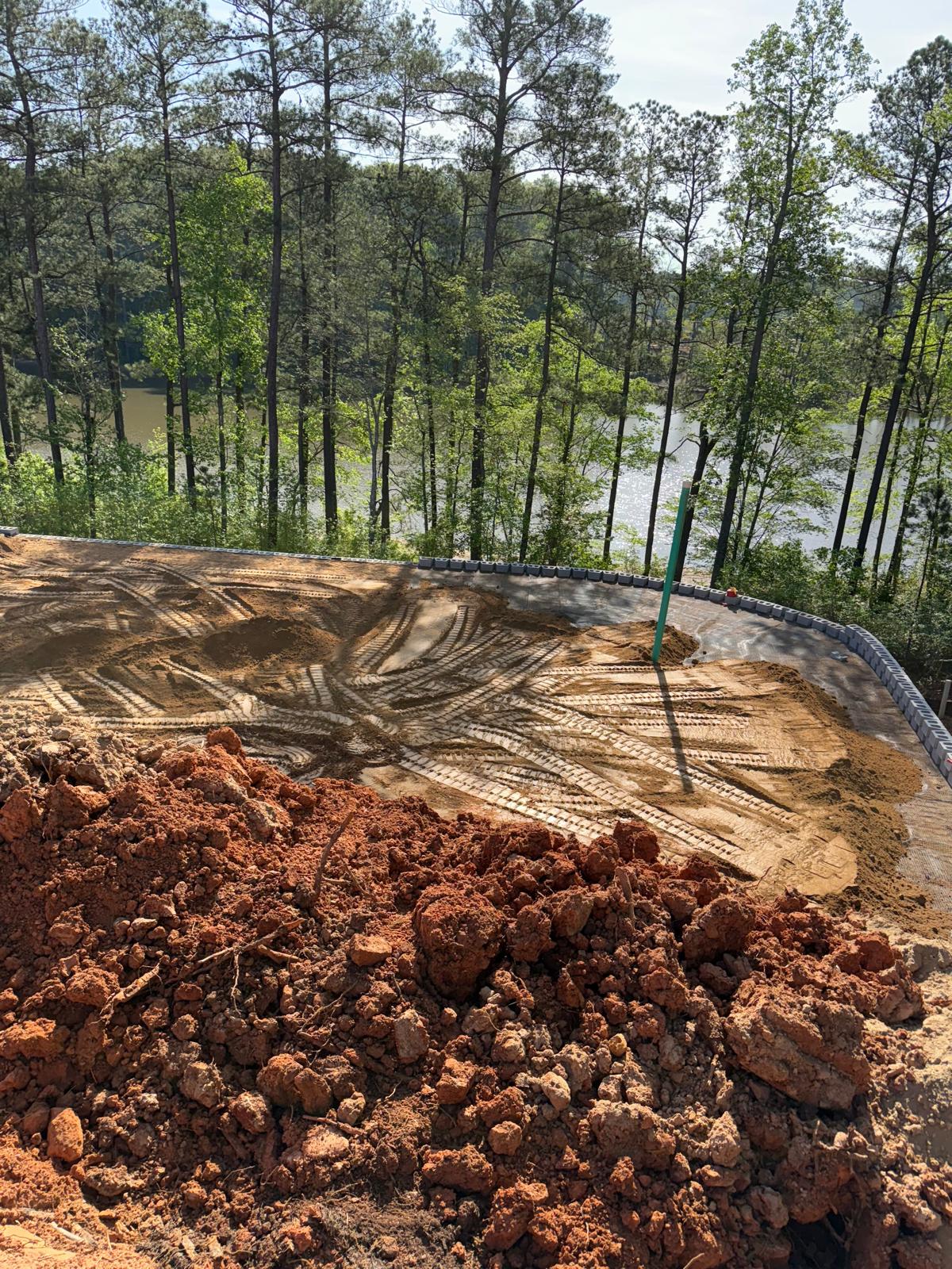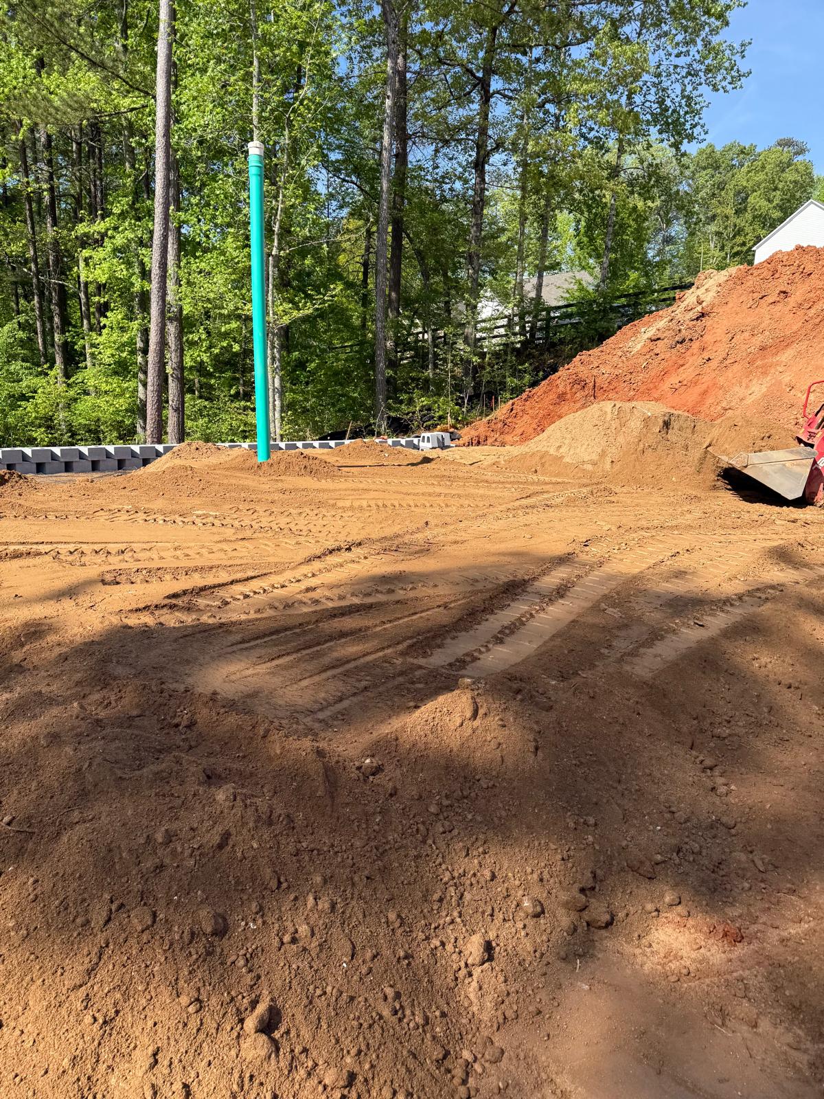 Focusing on backfilling and compaction operations behind the newly installing retaining wall structure along Lots #224–3229, Following the drainage installation, the next layer of backfill was placed over the previously installed geogrid reinforcement sheet, in preparation for subsequent compaction. Excavation and placement of fill material was conducted using a Kobelco 310LC excavator and transported on site with a CAT 750 dump truck. Subsequent to placement, two Takeuchi TL12R2 Bobcats were used to distribute the fill uniformly along Lots #224–3229. Once the fill was evenly spread, compaction was carried out using a Bomag BW211 sheep foot compactor roller.