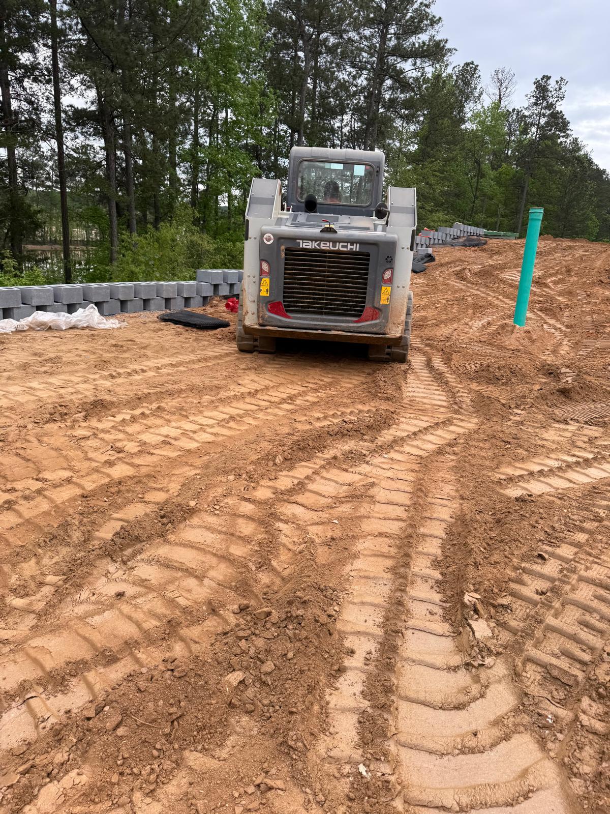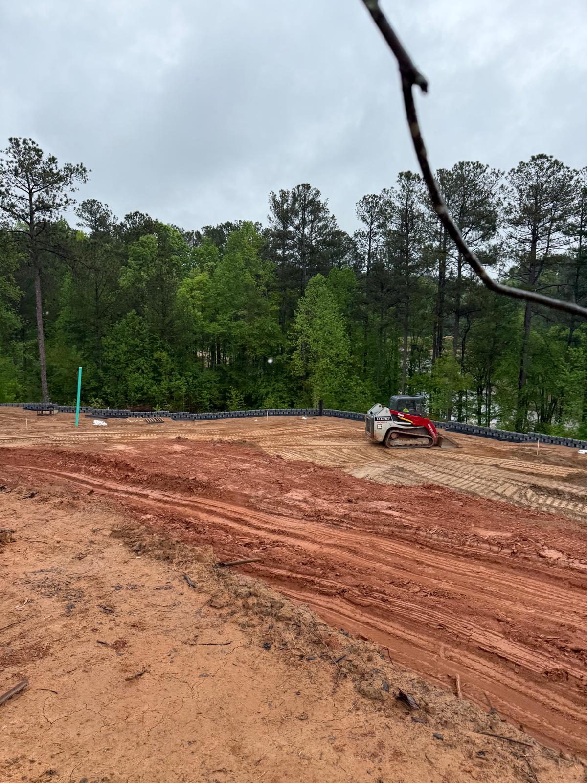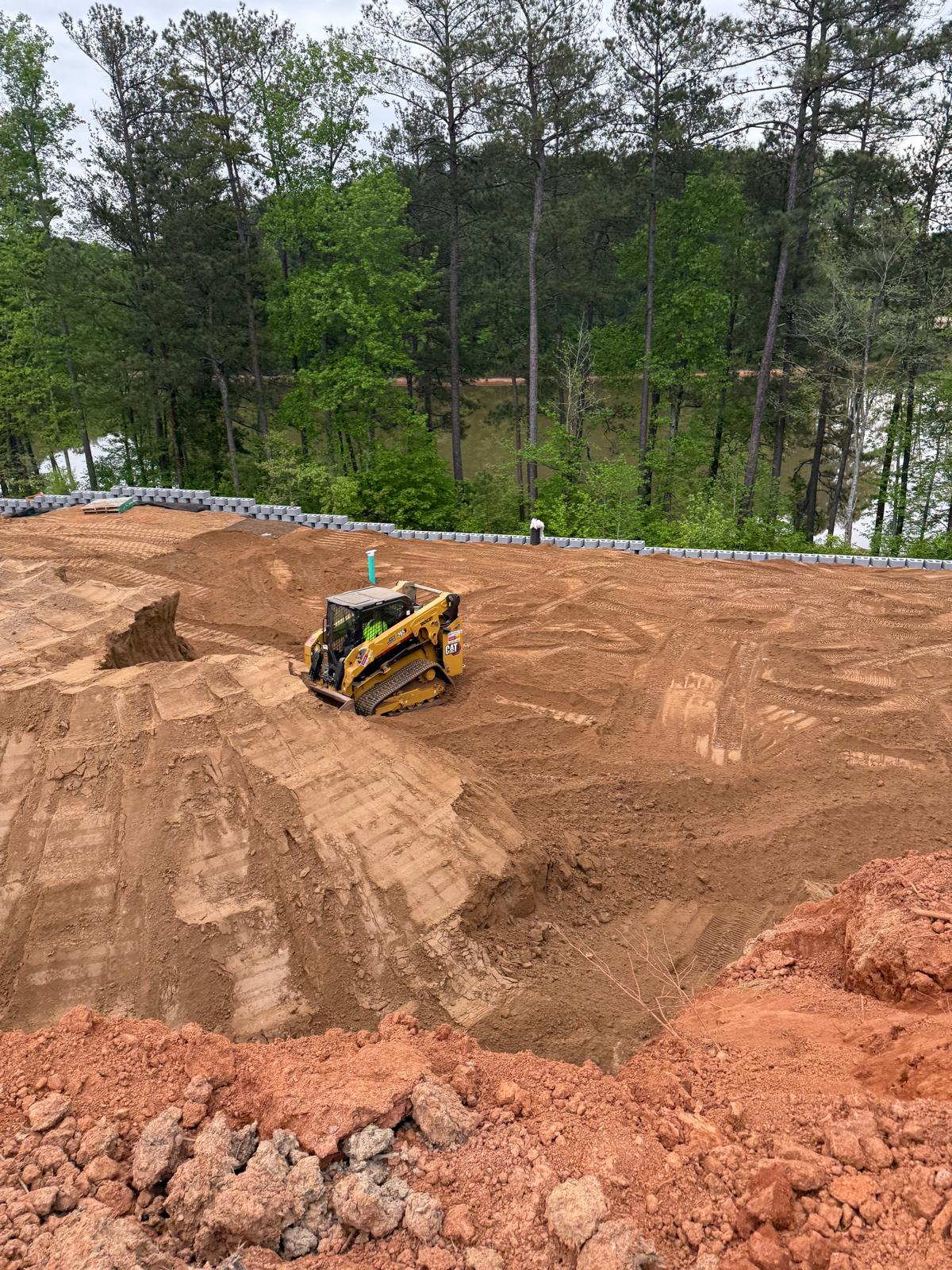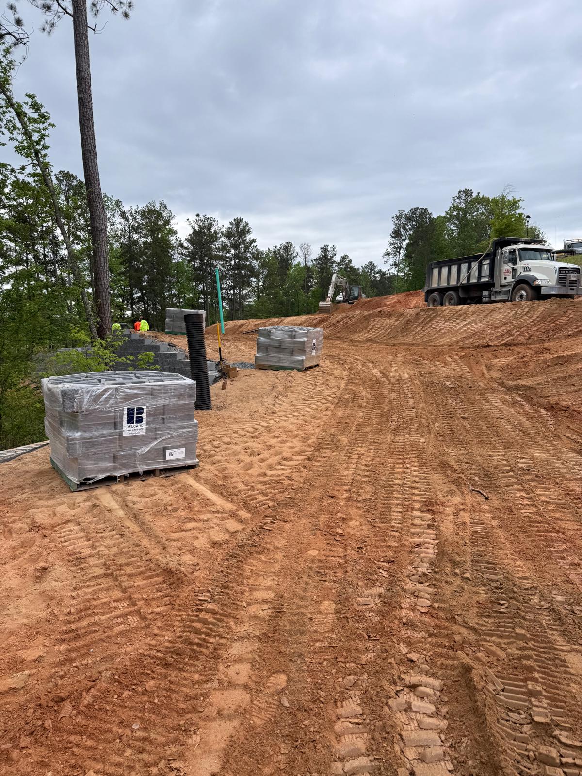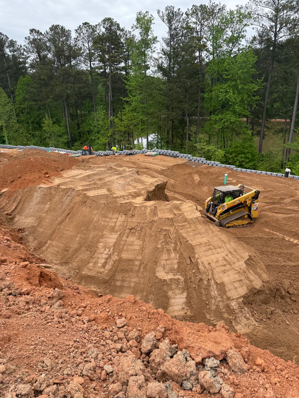 Focusing on backfilling and compaction operations behind the newly installing retaining wall sections along Lots #224–#229. Following the drainage installation, the next layer of backfill was placed over the previously installed geogrid reinforcement sheet, in preparation for subsequent compaction. Excavation and placement of fill material was conducted using a Kobelco 310LC excavator and transported on site with a CAT 750 dump truck. Subsequent to placement, two Takeuchi TL12R2 Bobcats were used to distribute the fill uniformly along Lots #224–#229. Once the fill was evenly spread, compaction was carried out using a Bomag BW211 sheep foot compactor in combination with a Bomag RR-106 roller. A new type of soil material was borrowed today, and a sample of this material was dropped by the ASEC laboratory for a Moisture-Density relationship (proctor).