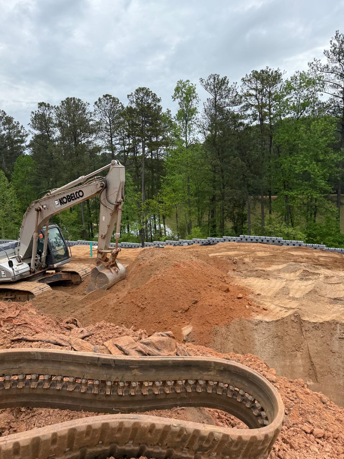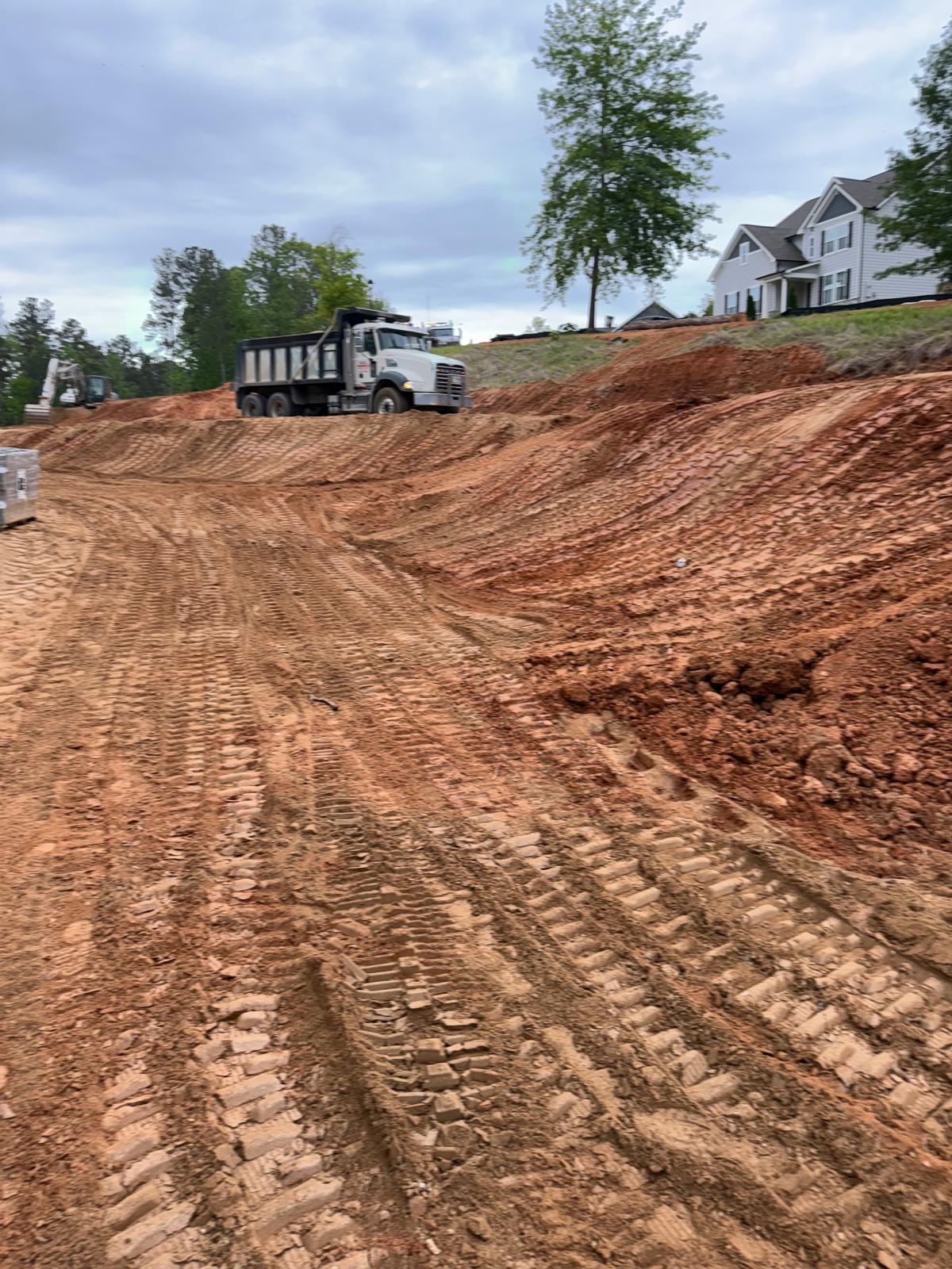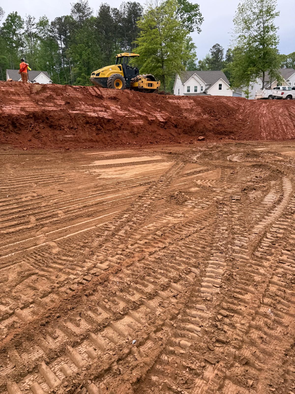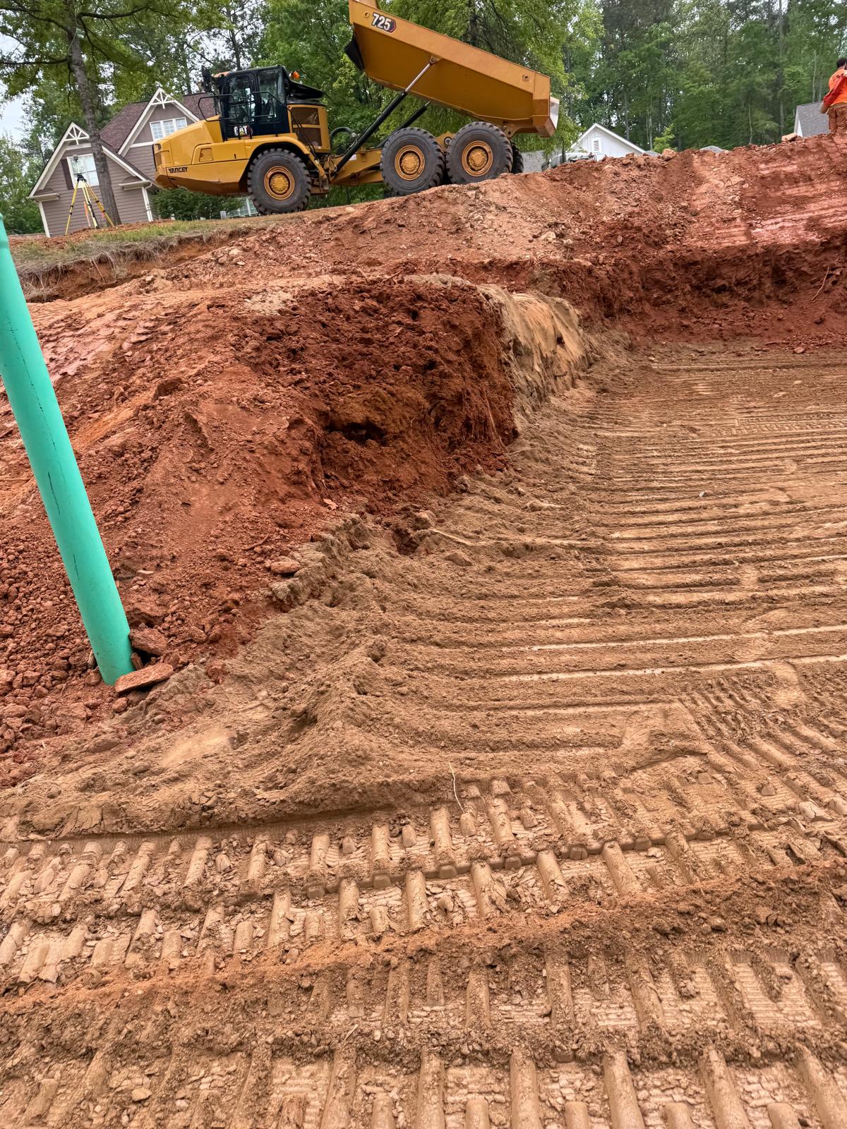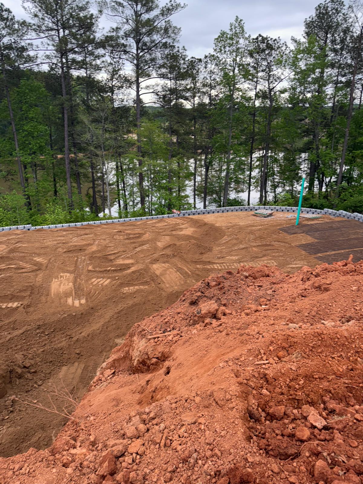 Focusing on backfilling and compaction operations behind the newly installing retaining wall sections along Lots #224–#229. Following the drainage installation, the next layer of backfill was placed over the previously installed geogrid reinforcement sheet, in preparation for subsequent compaction. Excavation and placement of fill material was conducted using a Kobelco 310LC excavator and transported on site with a CAT 750 dump truck. Subsequent to placement, two Takeuchi TL12R2 Bobcats were used to distribute the fill uniformly along Lots #224–#229. Once the fill was evenly spread, compaction was carried out using a Bomag BW211 sheep foot compactor in combination with a Bomag RR-106 roller. A new type of soil material was borrowed today, and a sample of this material was dropped by the ASEC laboratory for a Moisture-Density relationship (proctor).