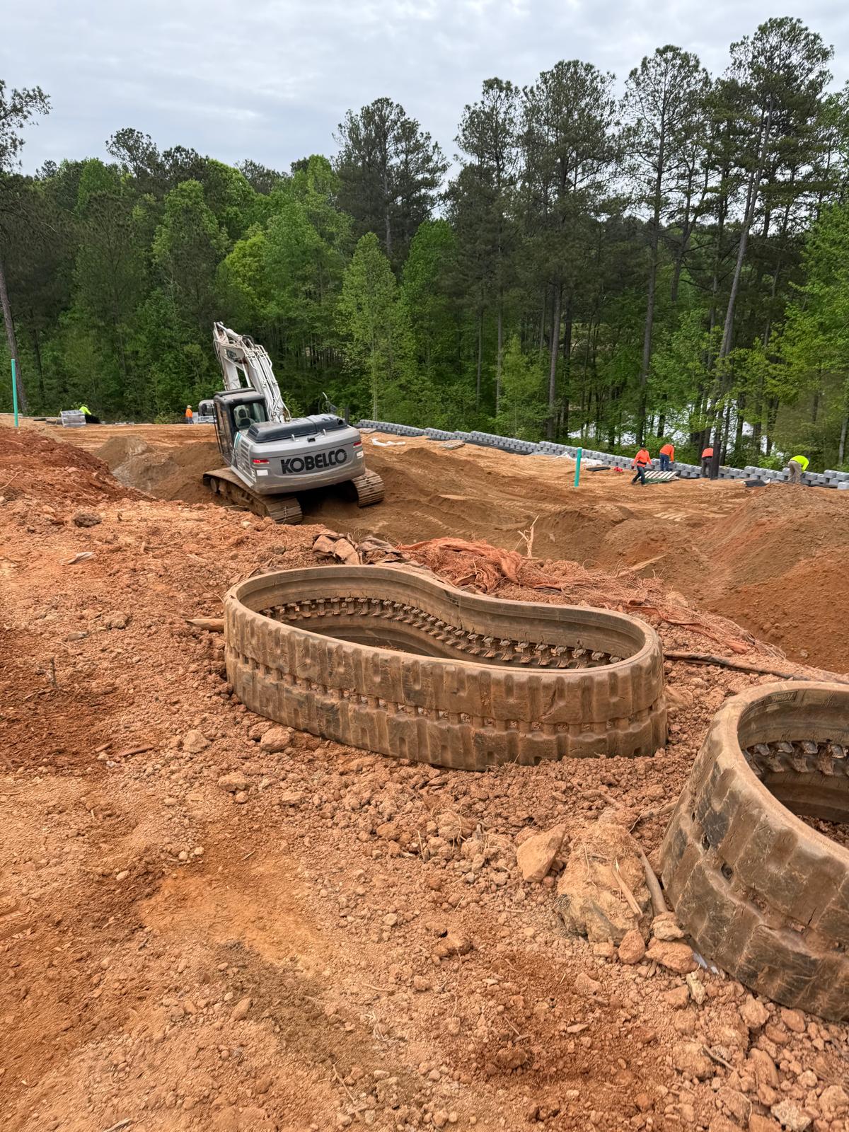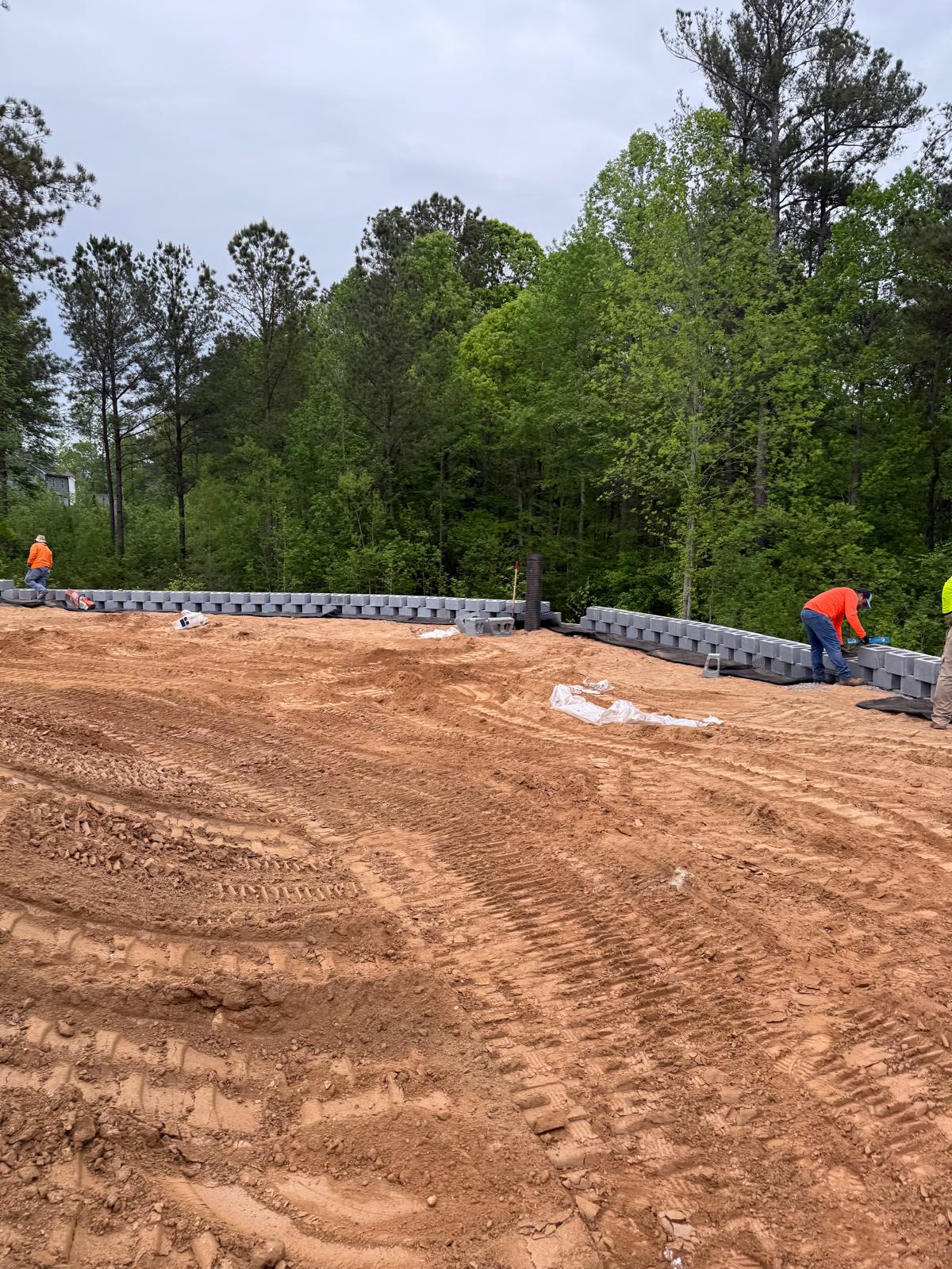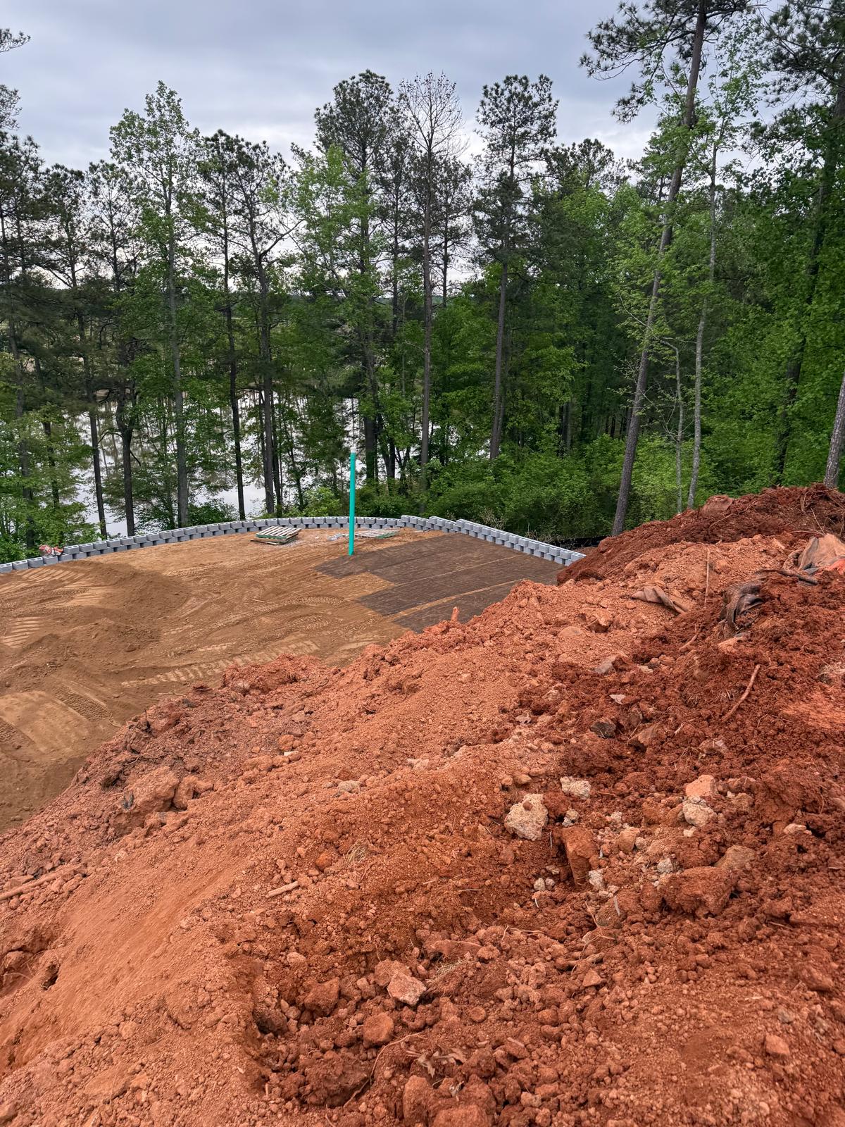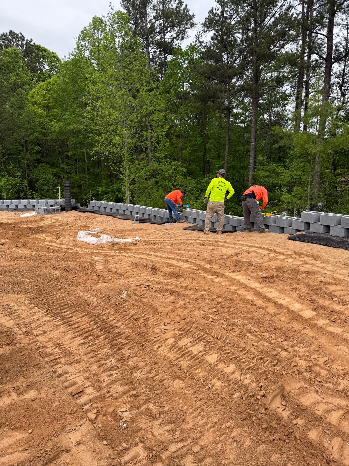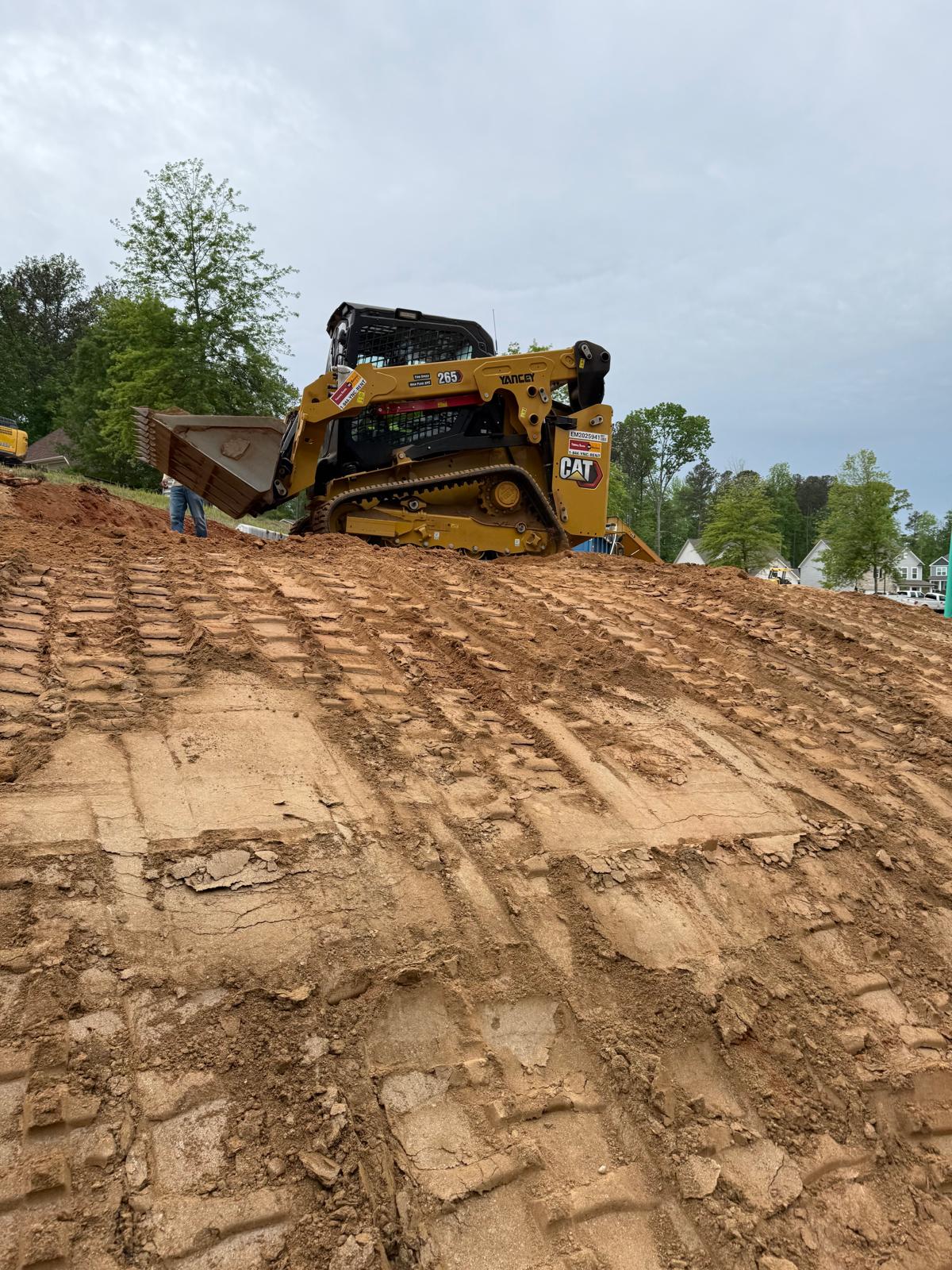 Focusing on backfilling and compaction operations behind the newly installing retaining wall sections along Lots #224–#229. Following the drainage installation, the next layer of backfill was placed over the previously installed geogrid reinforcement sheet, in preparation for subsequent compaction. Excavation and placement of fill material was conducted using a Kobelco 310LC excavator and transported on site with a CAT 750 dump truck. Subsequent to placement, two Takeuchi TL12R2 Bobcats were used to distribute the fill uniformly along Lots #224–#229. Once the fill was evenly spread, compaction was carried out using a Bomag BW211 sheep foot compactor in combination with a Bomag RR-106 roller. A new type of soil material was borrowed today, and a sample of this material was dropped by the ASEC laboratory for a Moisture-Density relationship (proctor).