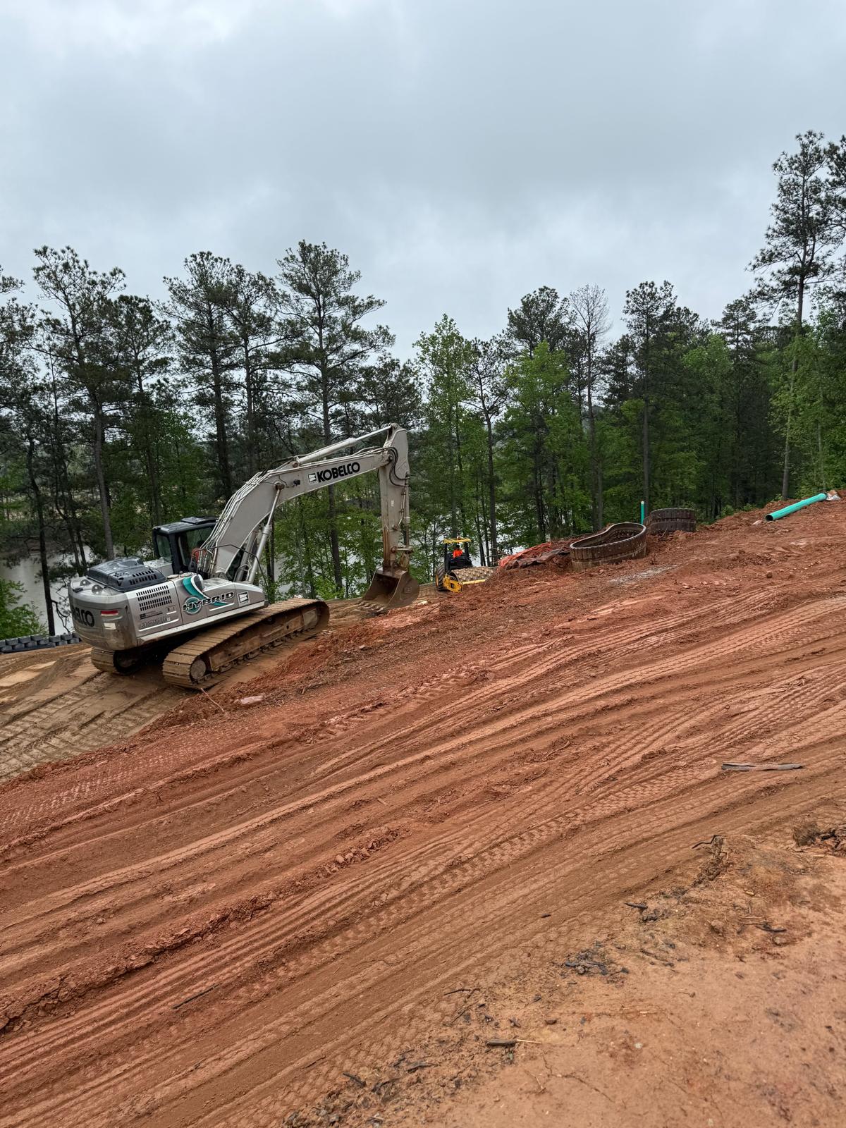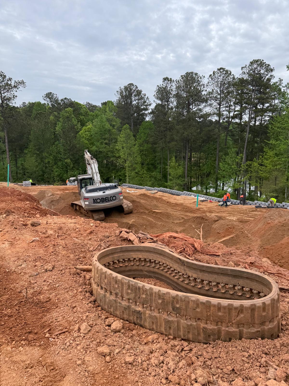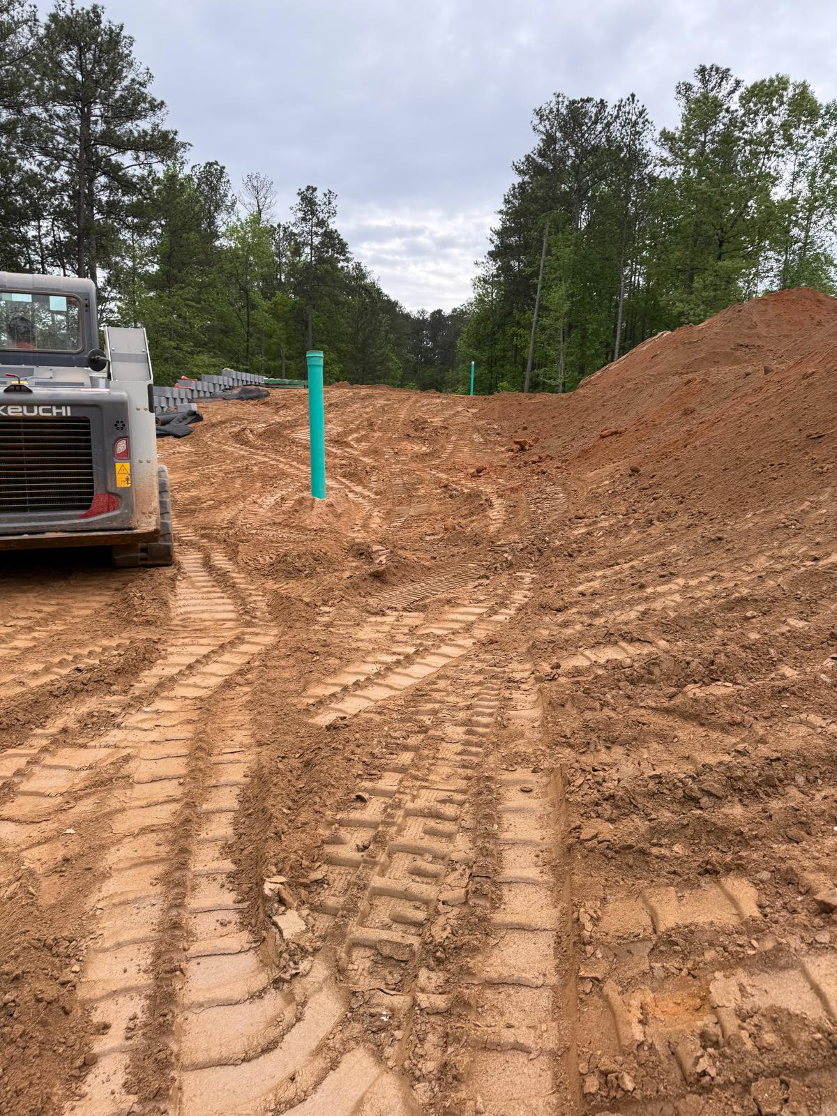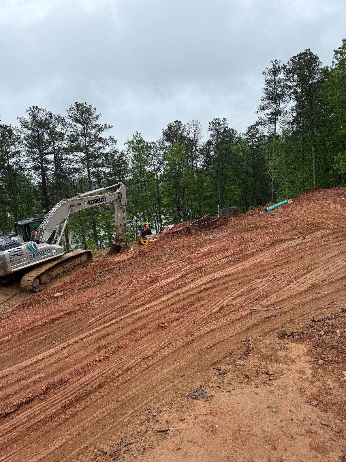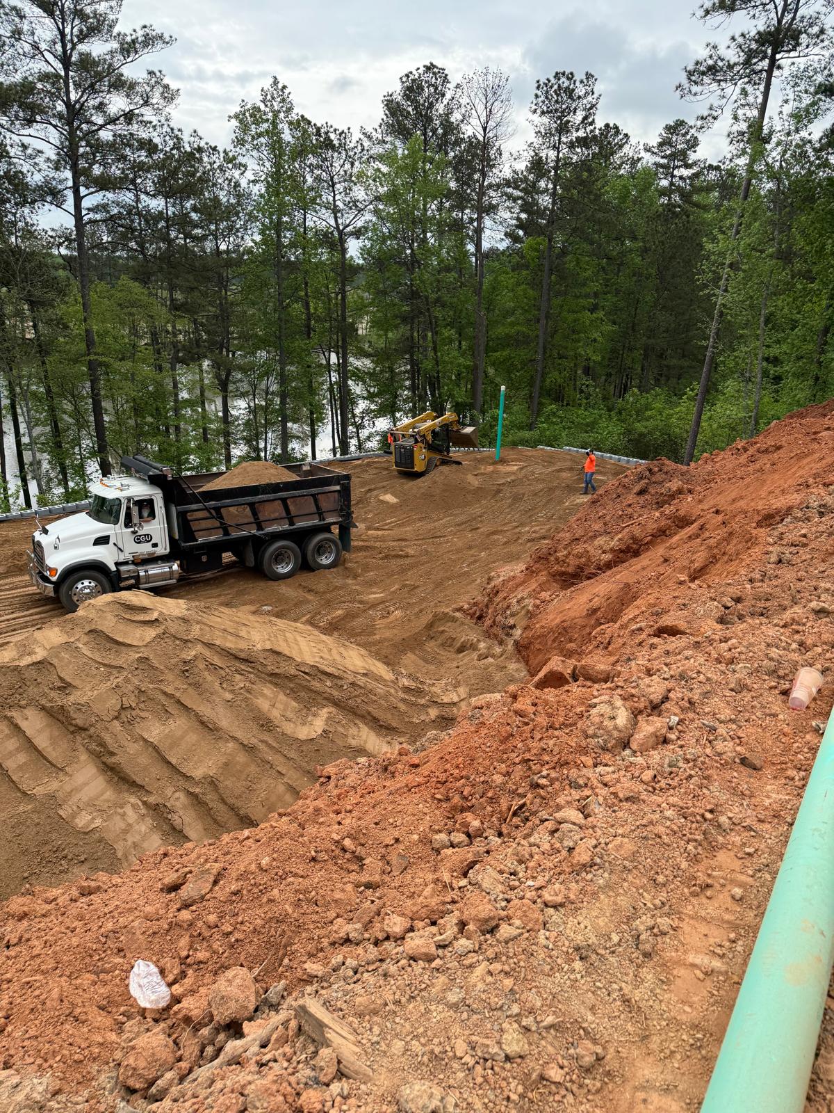 Focusing on backfilling and compaction operations behind the newly installing retaining wall sections along Lots #224–#229. Following the drainage installation, the next layer of backfill was placed over the previously installed geogrid reinforcement sheet, in preparation for subsequent compaction. Excavation and placement of fill material was conducted using a Kobelco 310LC excavator and transported on site with a CAT 750 dump truck. Subsequent to placement, two Takeuchi TL12R2 Bobcats were used to distribute the fill uniformly along Lots #224–#229. Once the fill was evenly spread, compaction was carried out using a Bomag BW211 sheep foot compactor in combination with a Bomag RR-106 roller. A new type of soil material was borrowed today, and a sample of this material was dropped by the ASEC laboratory for a Moisture-Density relationship (proctor).