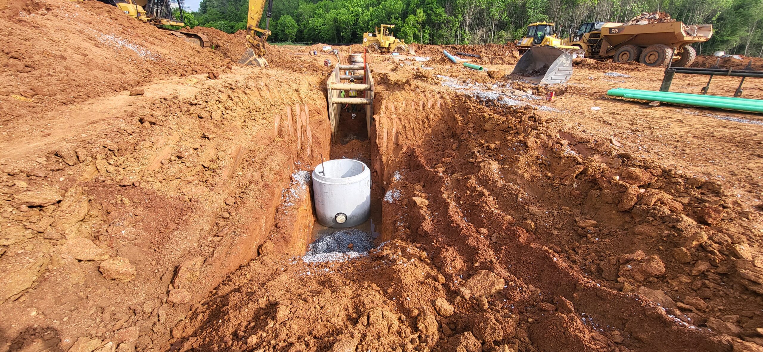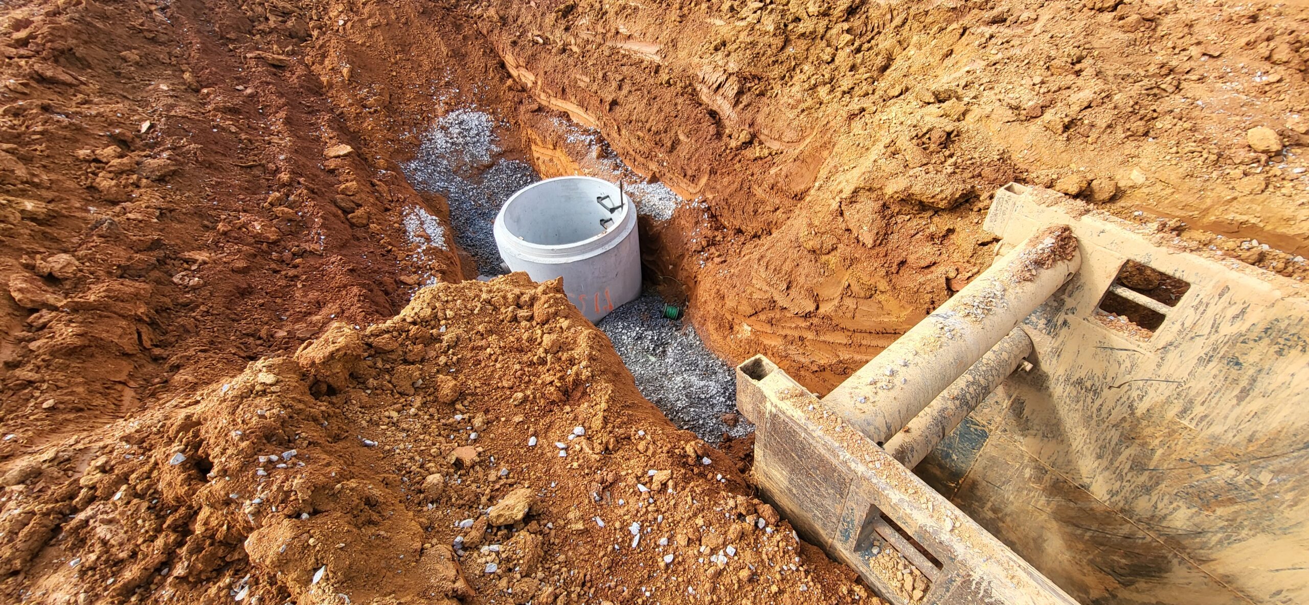 The technician also observed the installation of SSMH1.1 with approximately 1 foot of No. 57 stone bedding to elevation. In the center of the pipeline that runs from SSMH1.1 and SSMH1.0B, there was an approximately 5 feet of undercut spanning approximately 10 feet in length, that was replaced with approximately 4 feet of clean (trucked in) riprap and capped with approximately 1 foot of No. 57 stone to elevation. This is in addition to the same size undercut from SSMH1.0B as mentioned in the previous day’s report.