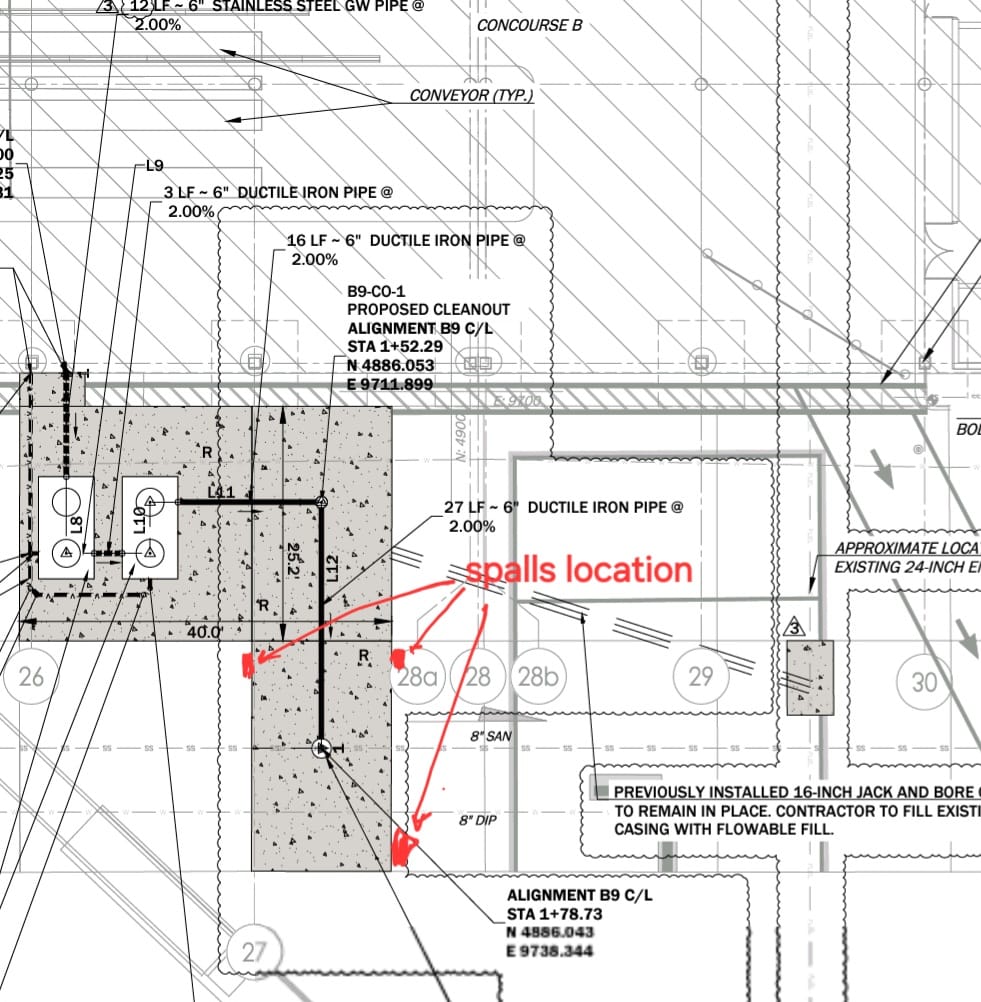 Spall Preparation: The contractor removed loose rock, debris, and standing water from the base of three spalls to prepare for repairs.