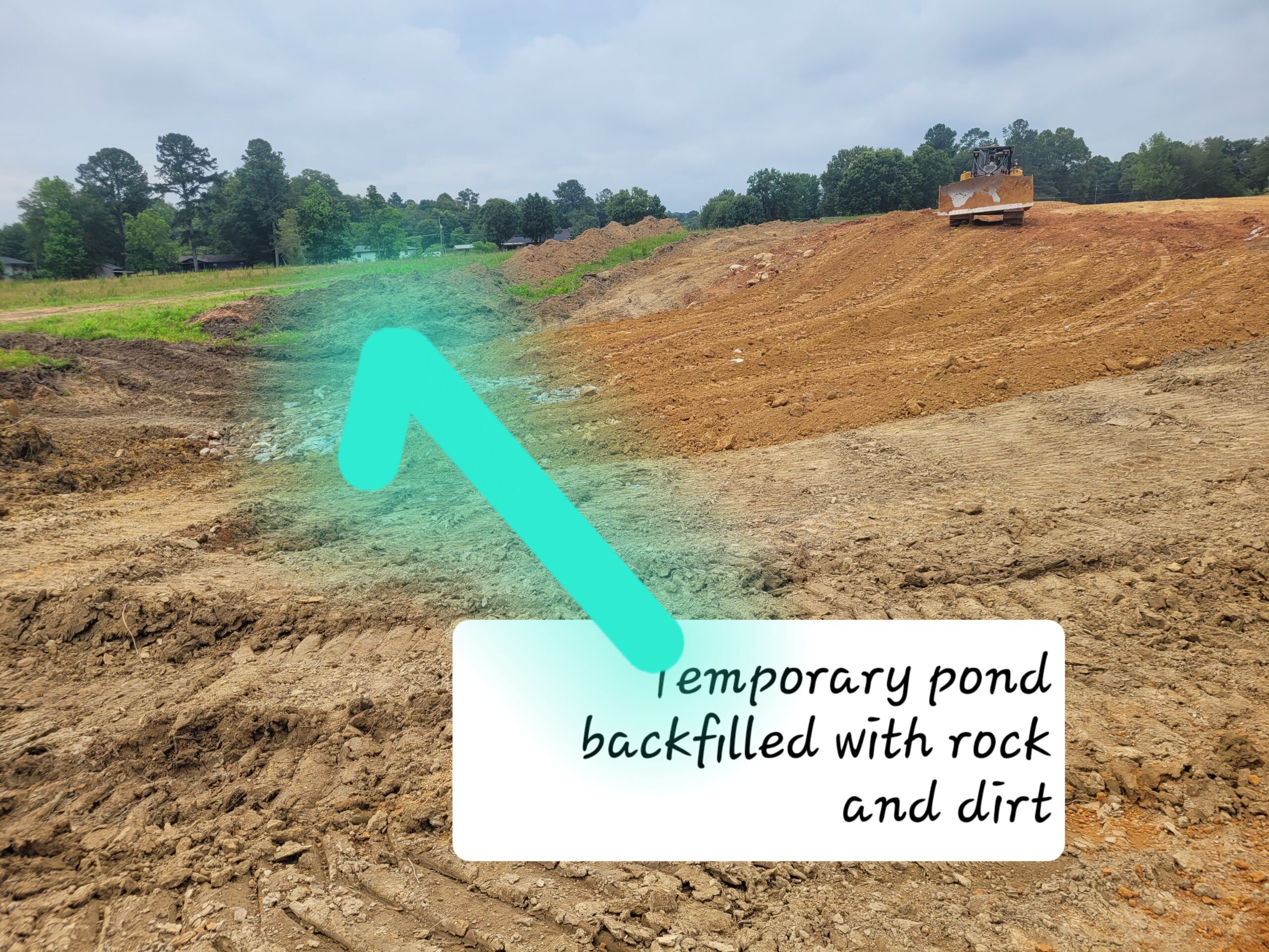 Picture depicting backfilling and reinforcing of old pond with rocks and dirt