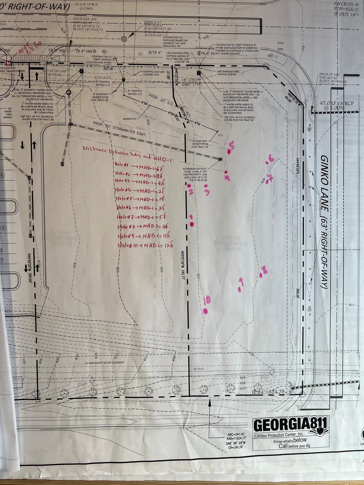 During this visit, the contractor had excavated ten (10) trial test pits in proximity to the marker MHD-1 to determine the depth of the rock table and to assess the need for possible blasting operations. Measurements were taken to determine the horizontal distance between each of the ten excavated holes and the reference point MHD-1. These distances will be used to confirm spacing adequacy, alignment and correlation with anticipated subsurface profiles. and all information was given to the contractor.