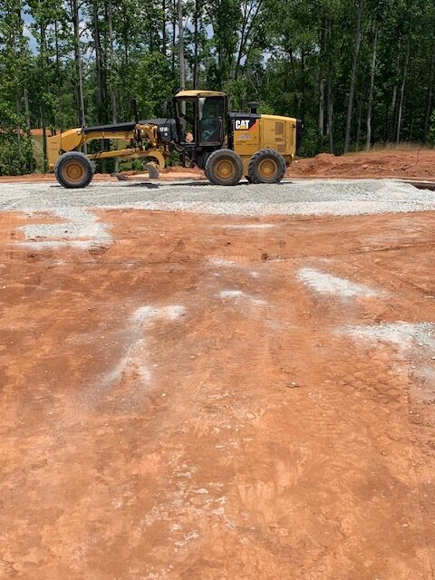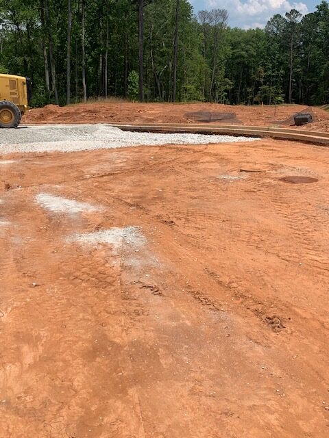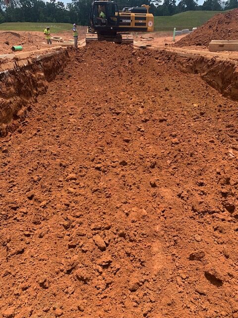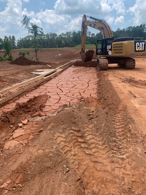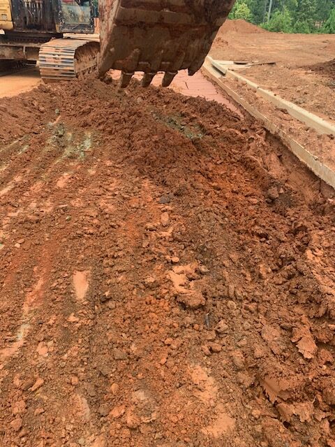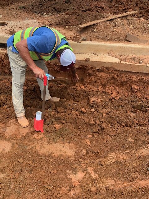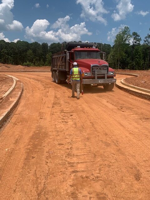 Our ASEC representative was on site as requested to observe proof-rolling of roadway subgrades using a loaded tandem dump truck with 18 t0ns of stone making two passes over all areas.  The subgrade soils at roadway C appeared stable under traffic except isolated areas noted below.  The deficient areas were recommended for repair by undercutting and replacing with additional base stone. The first recommendation was to replace with dry compacted soils, however, the contractor stated there was no available dry soils on site. Deficient areas noted were: (1.30′ x 5′ x 6″), (2.30′ x 4′ x 6″), (3.20′ x 10′ x 6″), (4.12′ x 4′ x 6″), (5.95′ x 20′ x 3′) (repair starts at 4″water line repair) and (6.108′ x 15′ x 2.5′).  Stabilization fabric and baby surge stone will be used in the deeper areas. The writer also observed repairs performed at the roadway D cul-de-sac with an average depth of (36″ x 90′ x 25′).