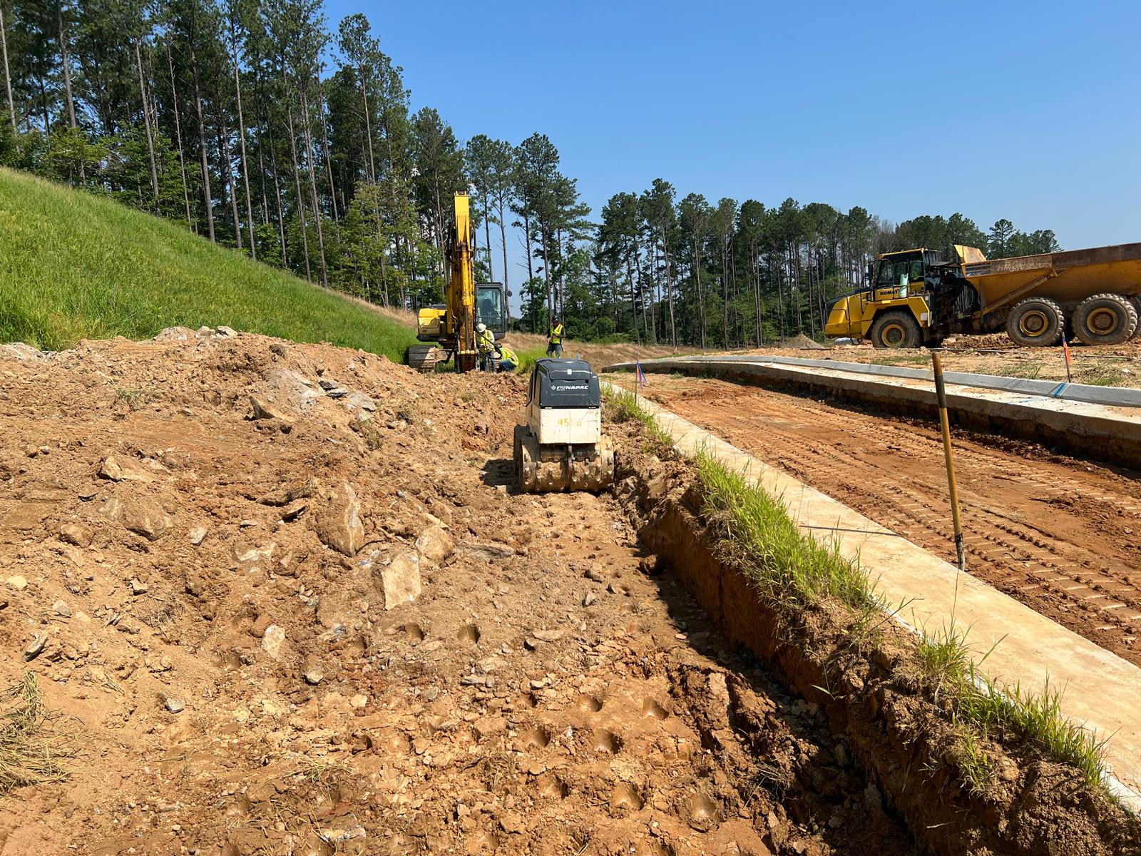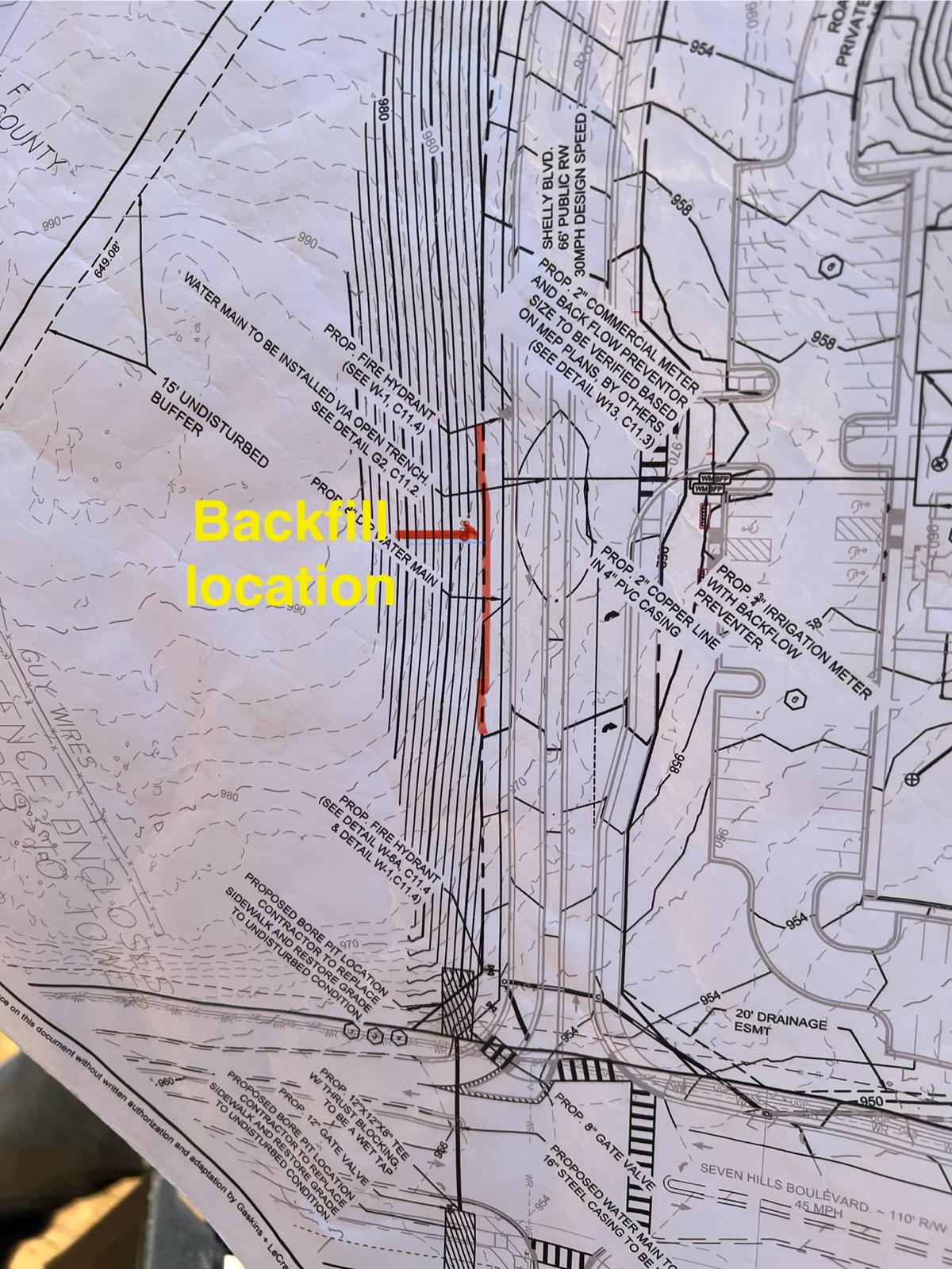 - The placement and compaction of fill soils for the water line (location is shown in pictures) continued this day.