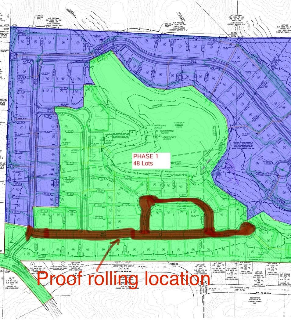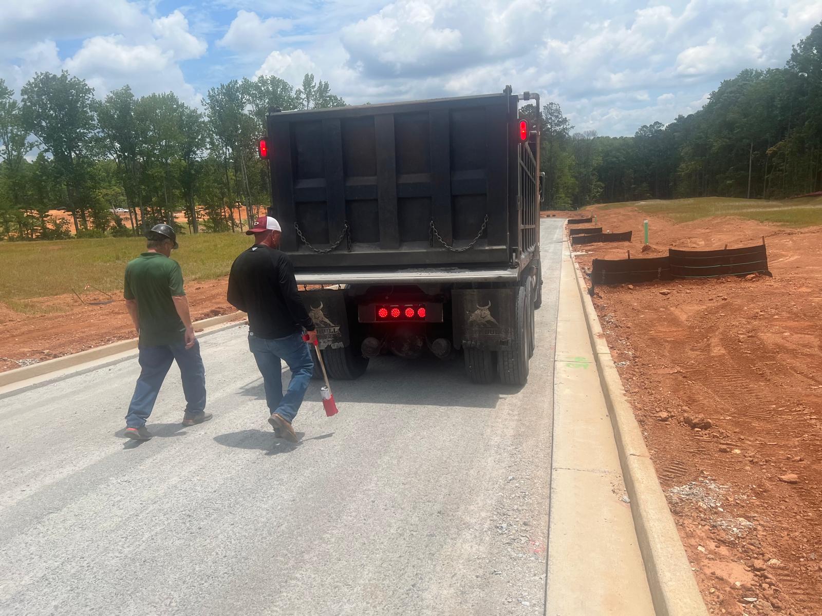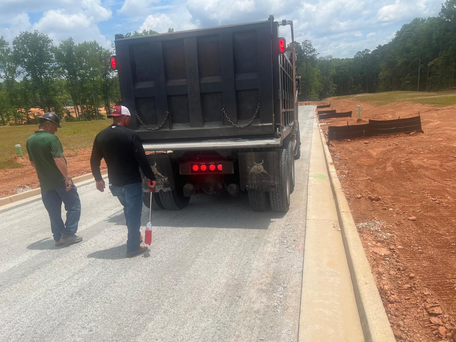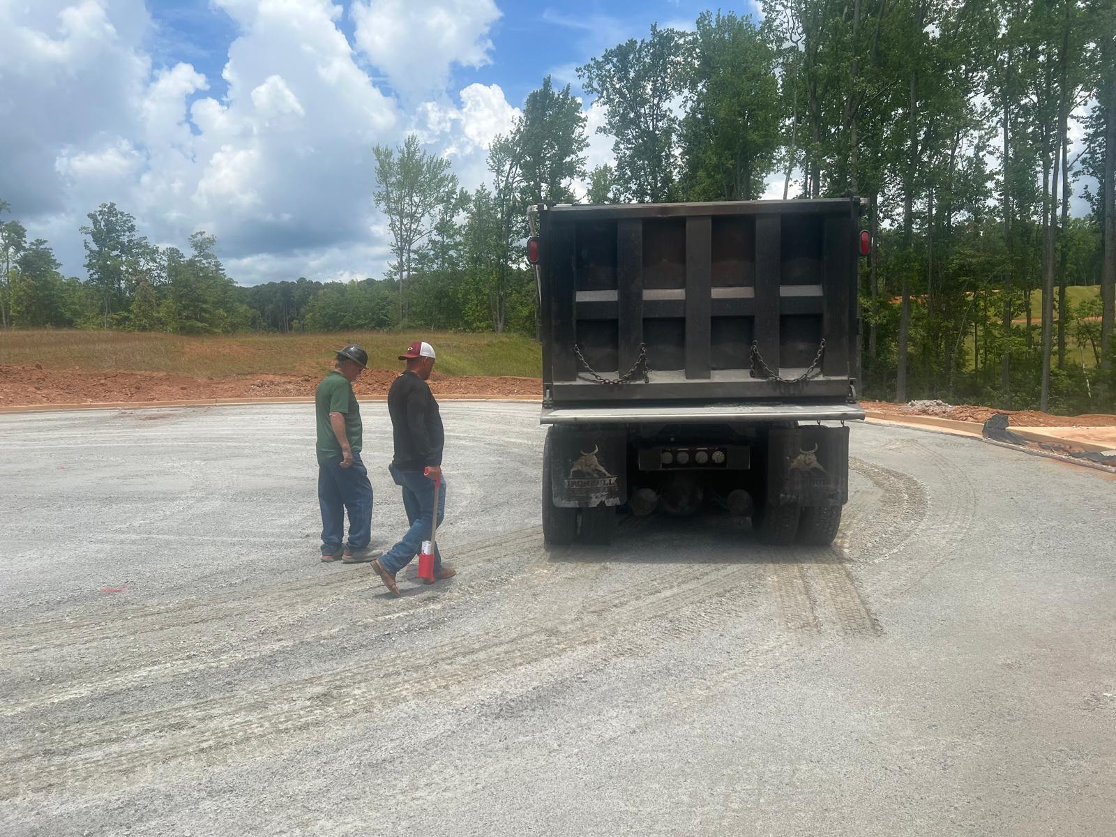 A proof-roll was performed on the road (location is shown in pictures) using a fully loaded tandem-axle dump truck. Multiple passes were made across the area. No significant yielding or deflection was observed during the proof-roll.