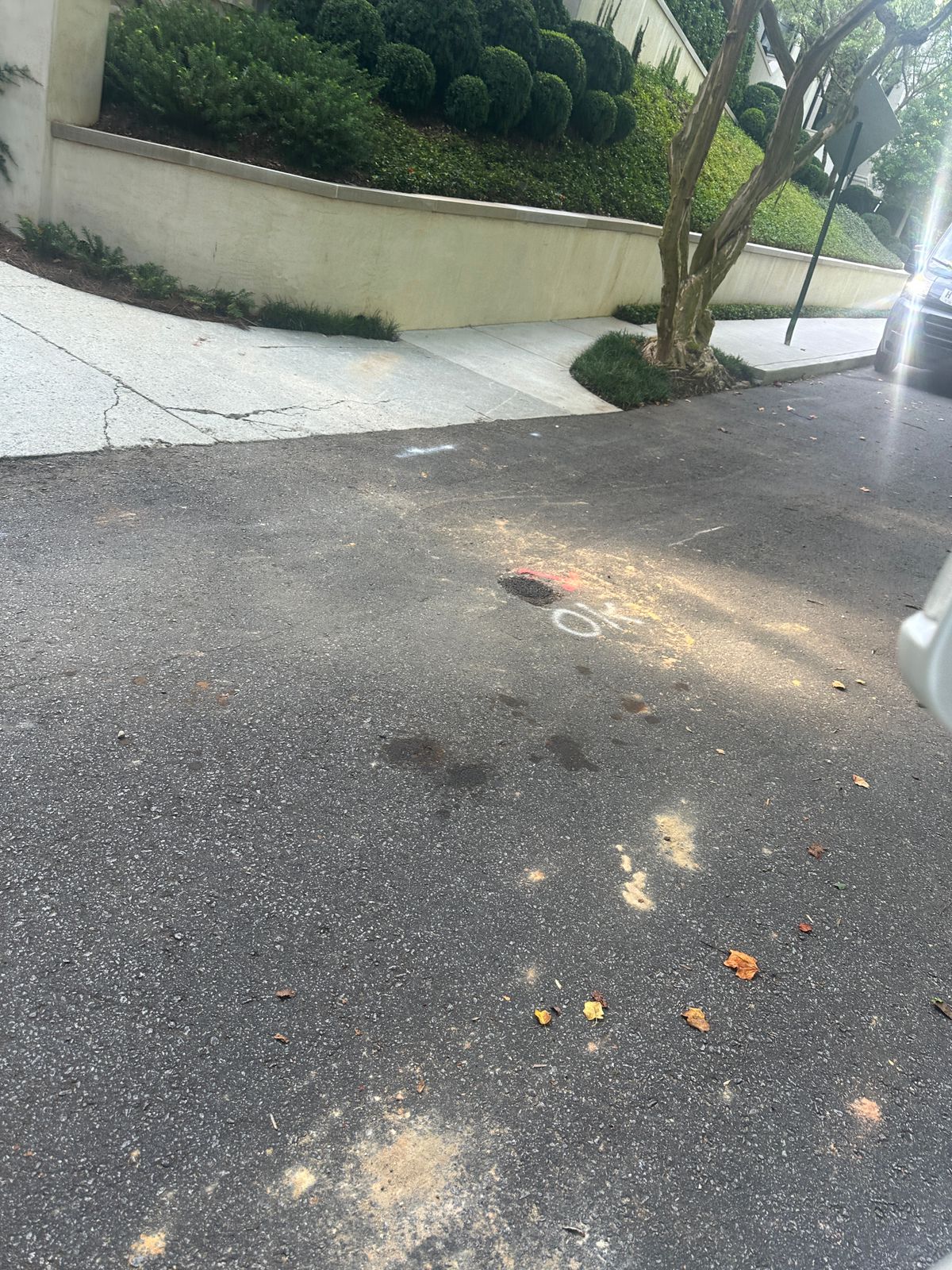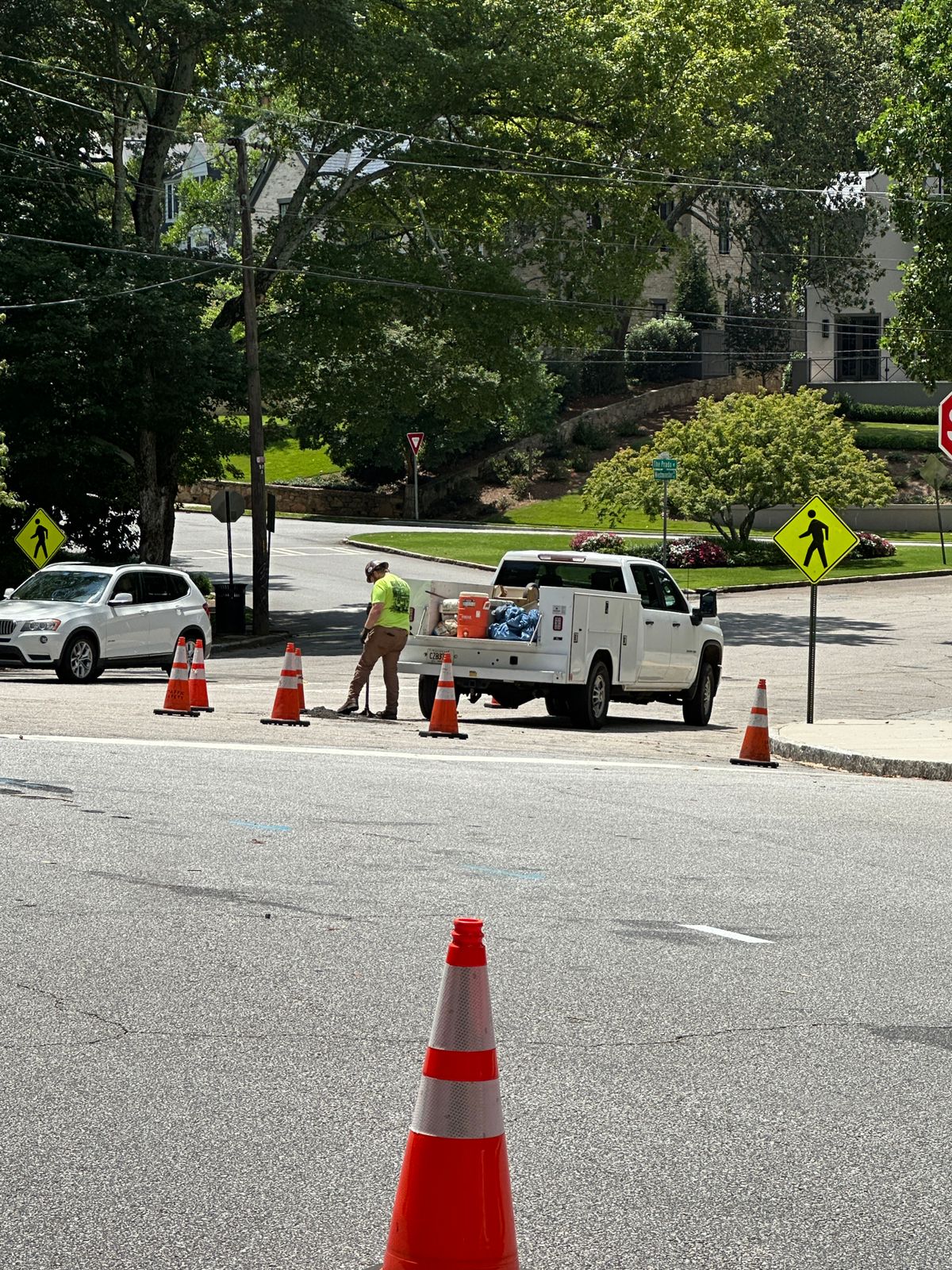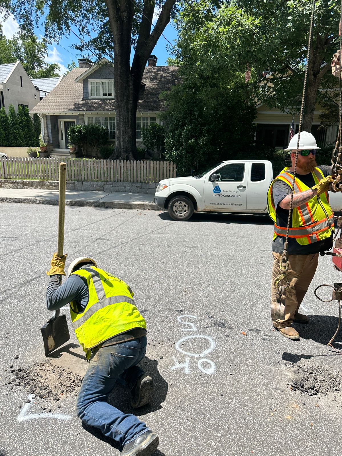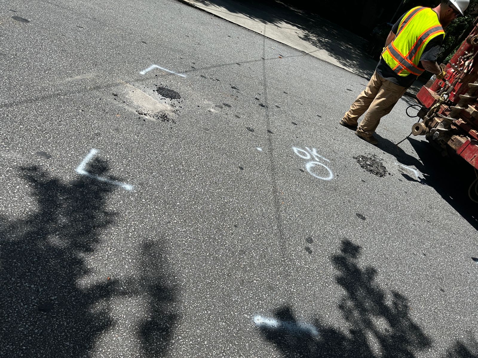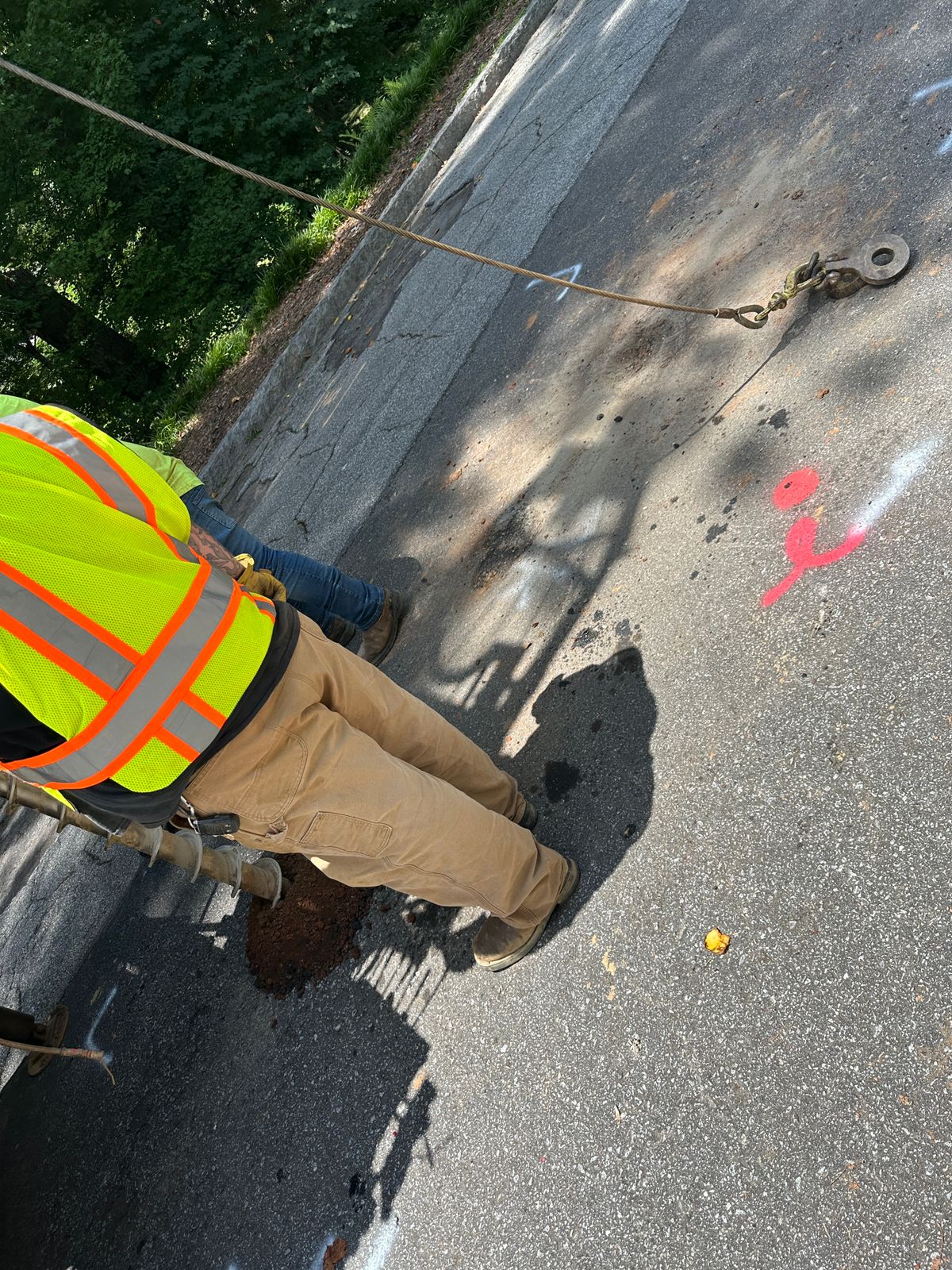 At boring 4, drilling was immediately stopped upon striking a hard concrete layer at a depth of just 1 foot. We then waited for the sanitary locator, who arrived around 1:00 PM. He marked offset zones and established 10-foot clearance boxes around borings 2, 3, 4, 5, and 6 to allow safe alternate drilling points. Boring 3 was also adjusted slightly downward toward the stop sign to avoid power line interference.