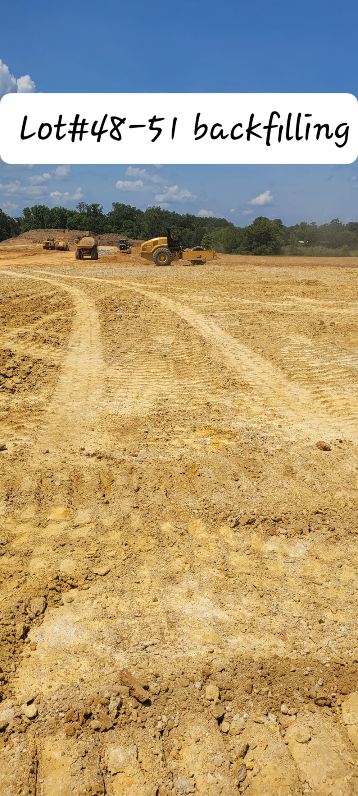 Cutting and backfilling activities were continued this day. Hauling from within the cut area was carried out by the 845C dump trucks. Spreading was performed using a 61Pxi Komatsu dozer whereas cutting was performed by a 349E CAT excavator. Fill placement continued on Lots #48 through #51 and is a foot from finished grade.