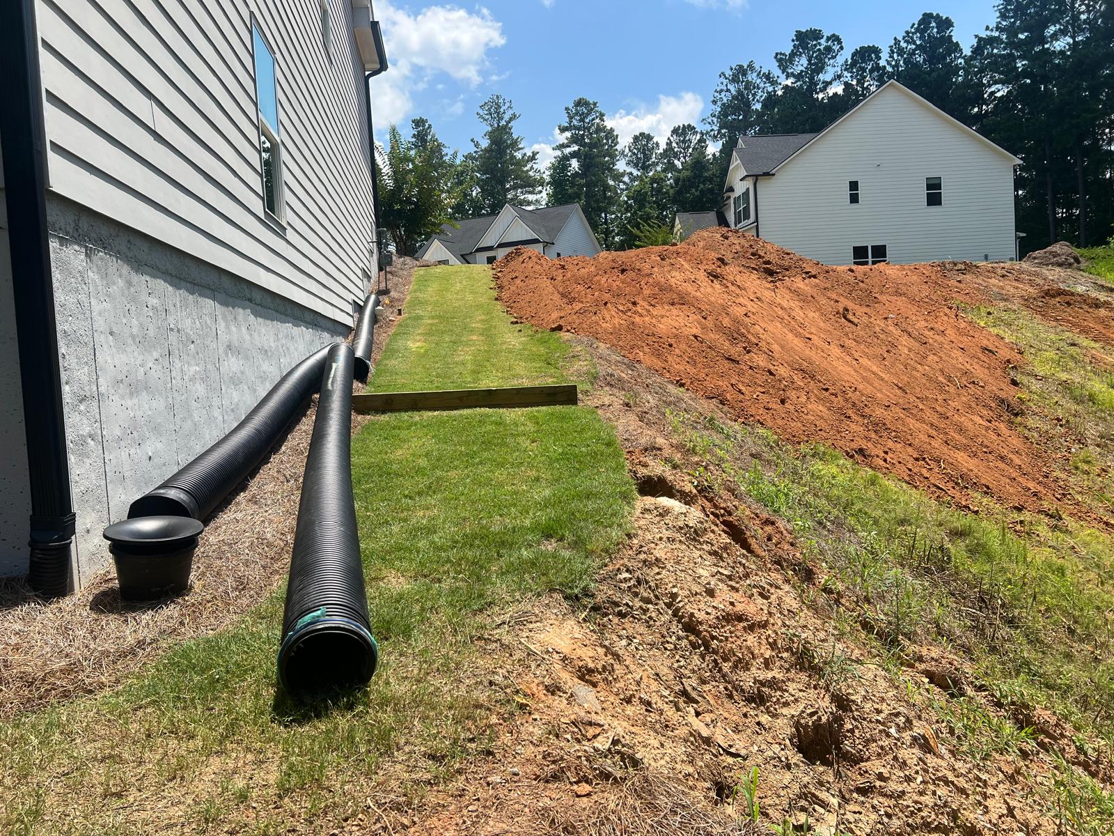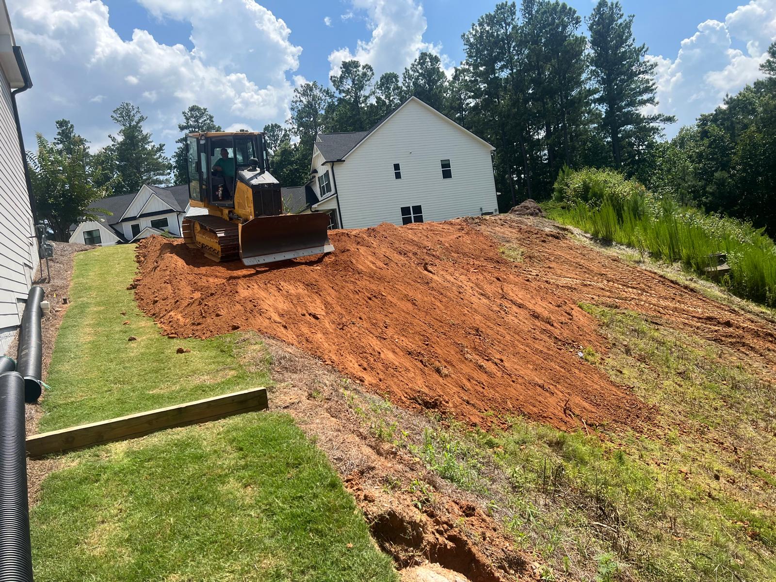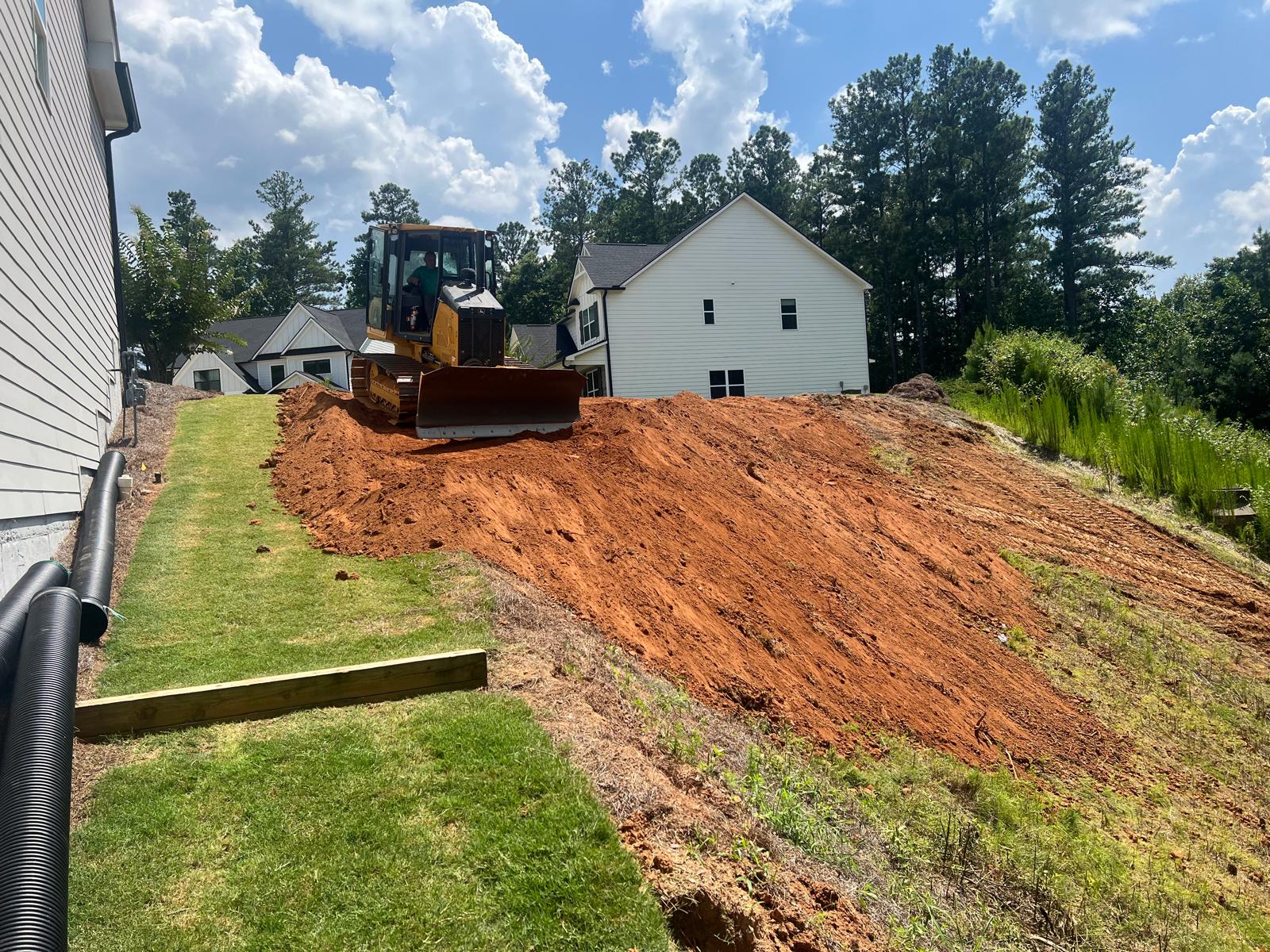 The contractor prepared the slope area located to the east of Lot #92 by removing all grass, organic material, and roots to prepare a stable surface for fill placement. Following this, soils imported from an external source was delivered to the site and spread evenly across the prepared area using a dozer. In addition to the earthwork, the contractor cleaned the space between the water storage manholes using a hose to remove any accumulated debris. As part of the ongoing drainage works, the contractor also brought 8-inch corrugated HDPE “E” pipe to the site, which are intended to be used for tying in with the in the gutter downspouts to the drainage system.