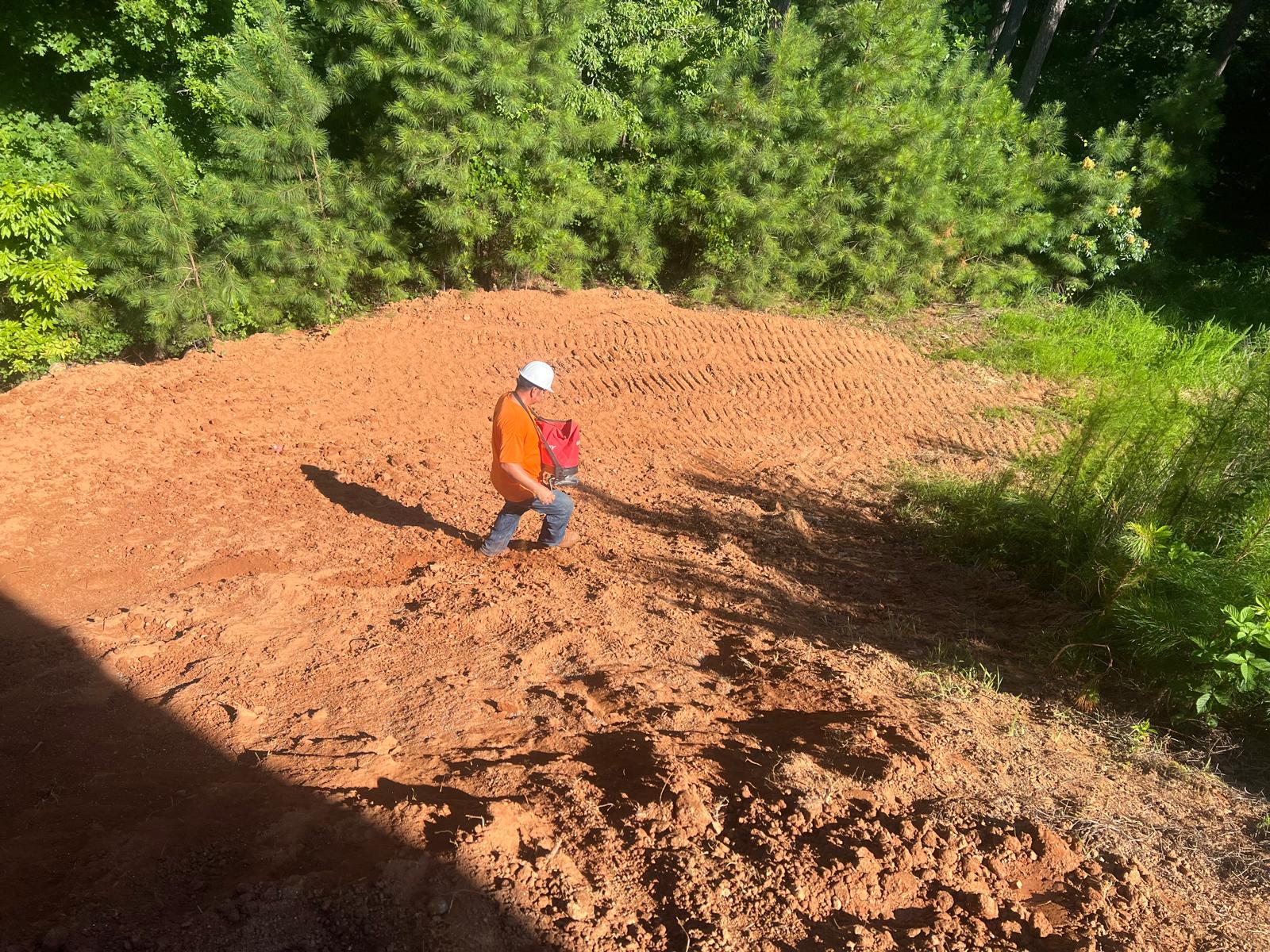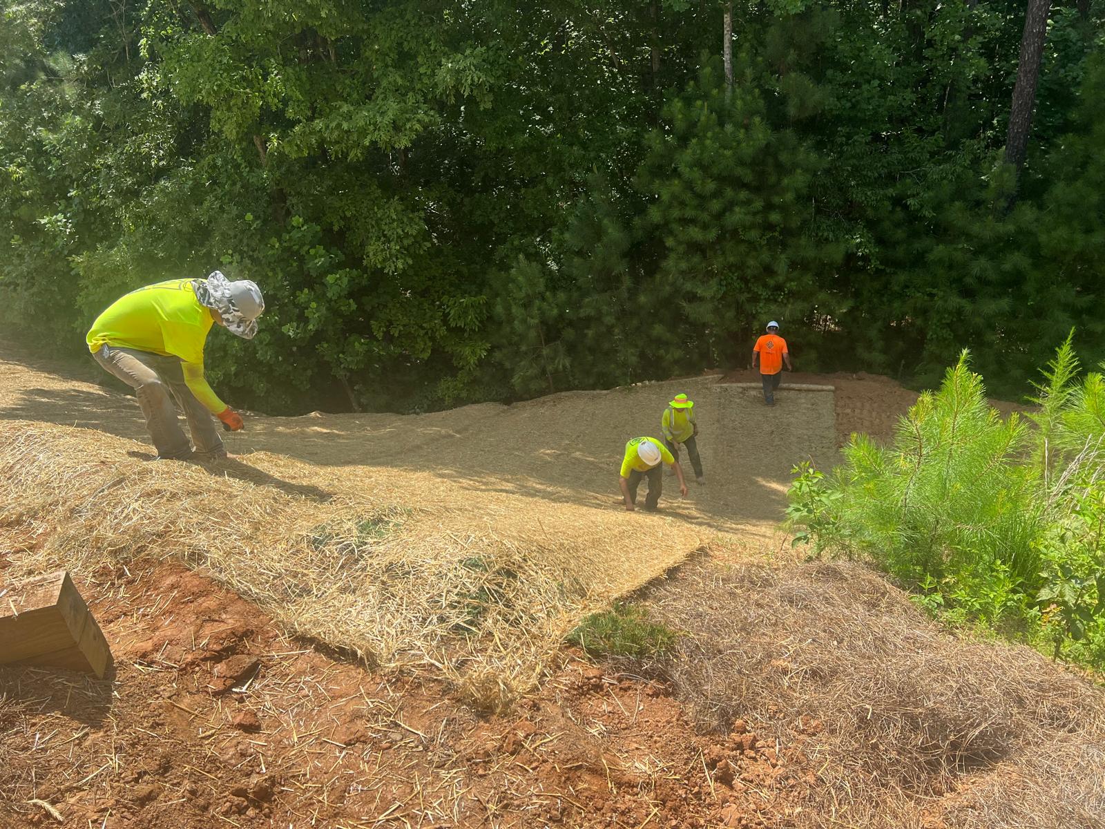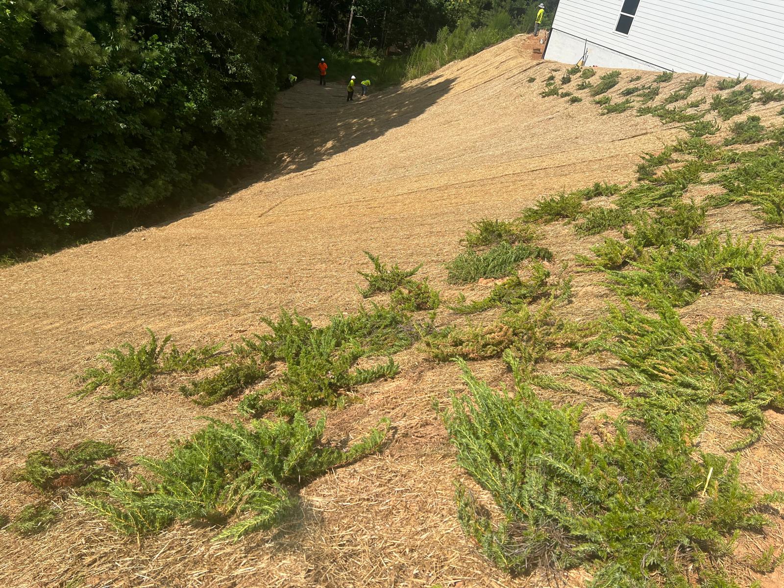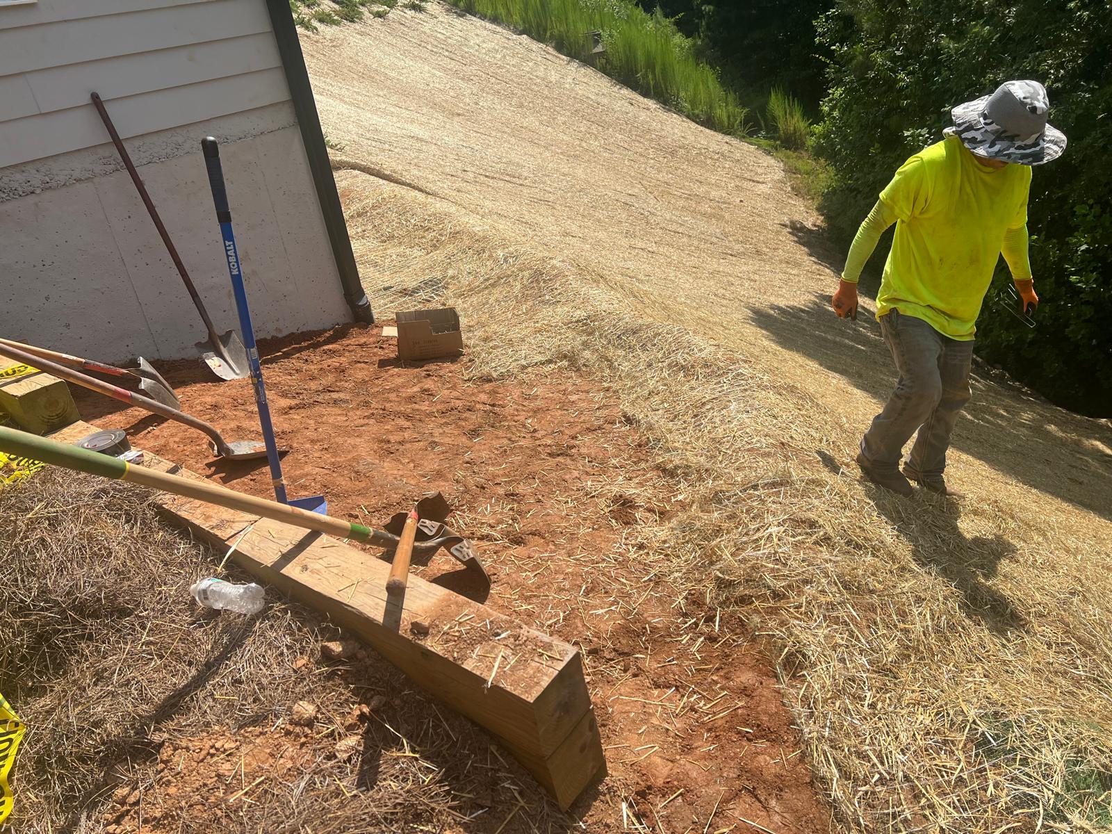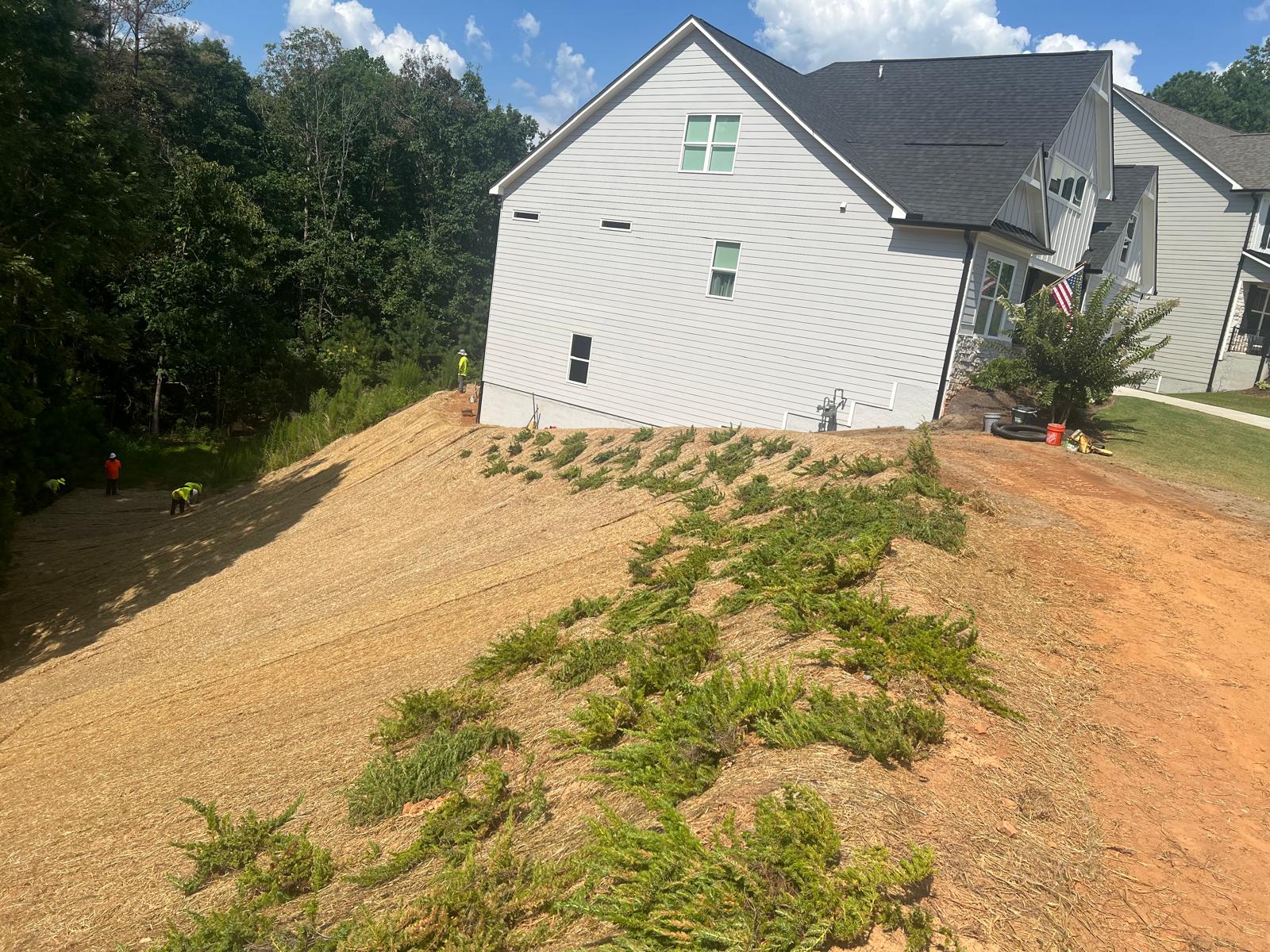 The contractor had prepared the slope area located east of Lot #92. Imported soil was evenly spread across the area and compacted using a dozer. For erosion control and stabilization, pine straw was placed on the slope, and sod along with Bermuda grass was installed around House #92. Additionally, the contractor installed single-sided erosion control matting to further stabilize the area. The originally installed 8-inch pipe and 24-by-24-inch drainage box were removed and relocated to a new position at the request of the owner, who was dissatisfied with their initial placement. The existing Bermuda grass around the house was removed due to its deteriorated condition, and new Bermuda sod is scheduled to be installed the following day. Furthermore, hydroseeding was performed using a mix of lovegrass, clover, and fescue to enhance ground cover and promote long-term stabilization.