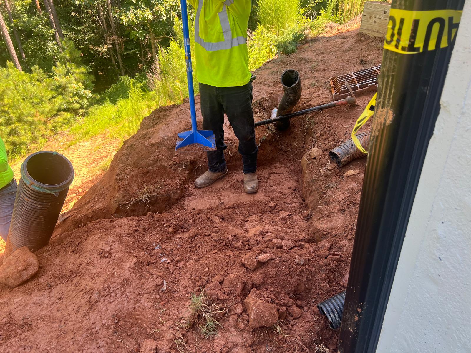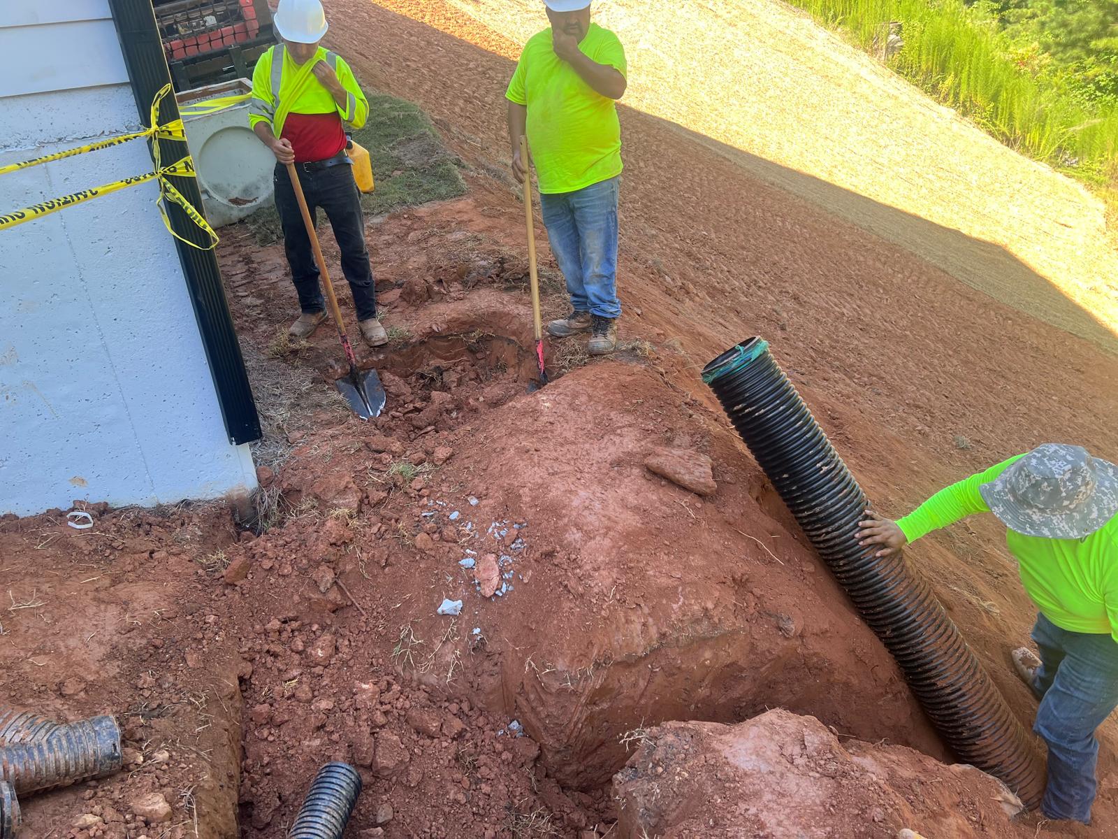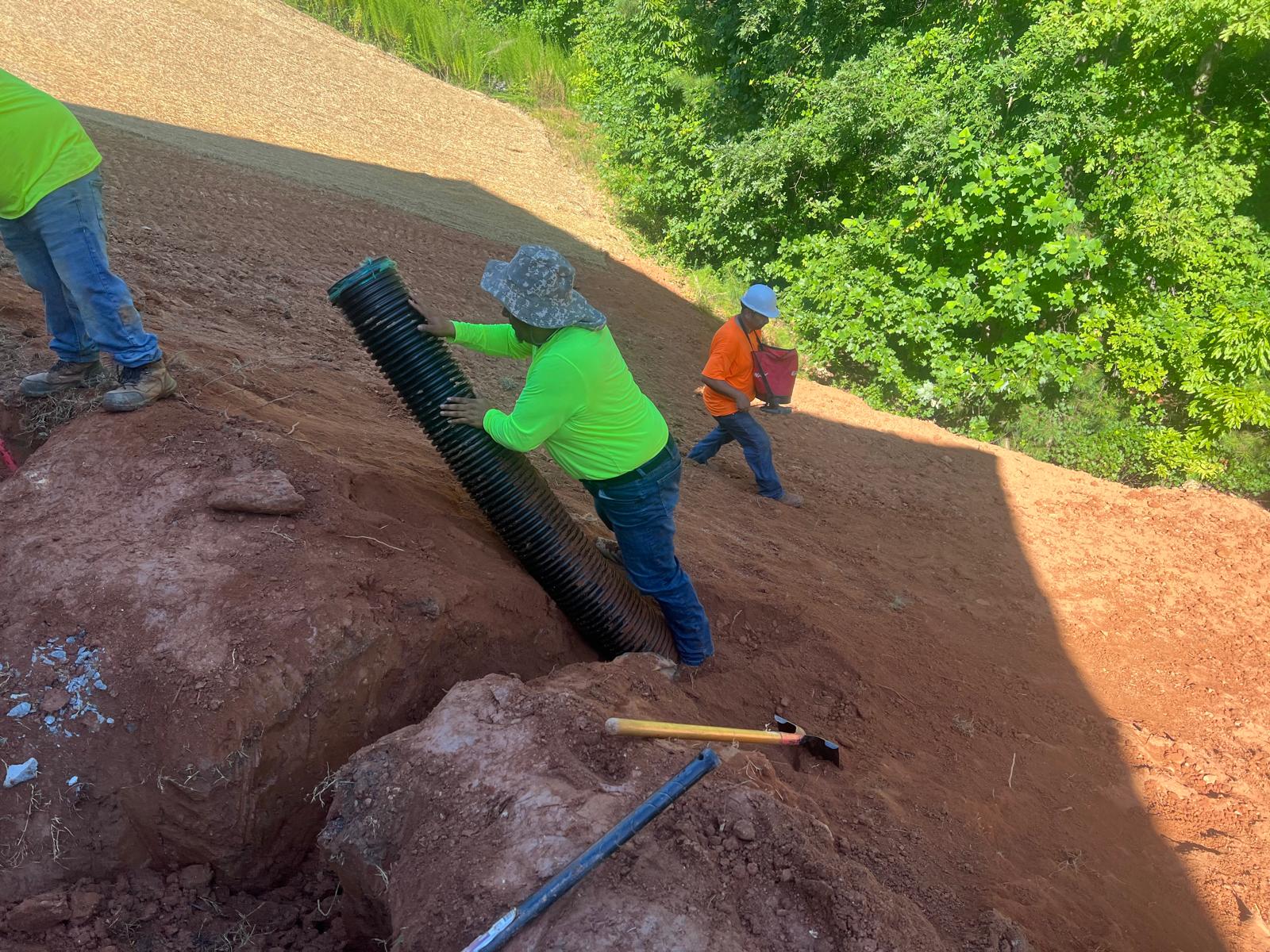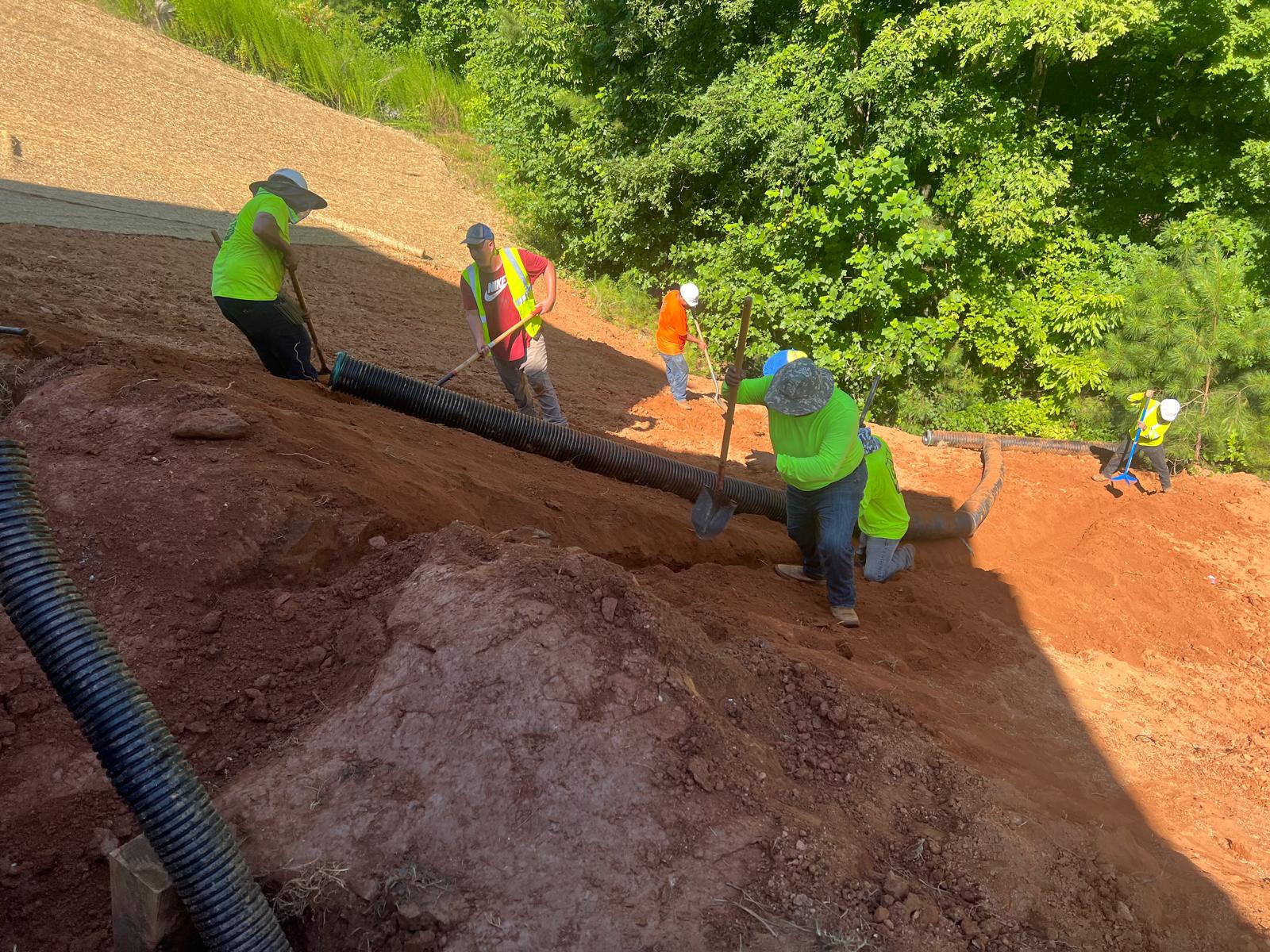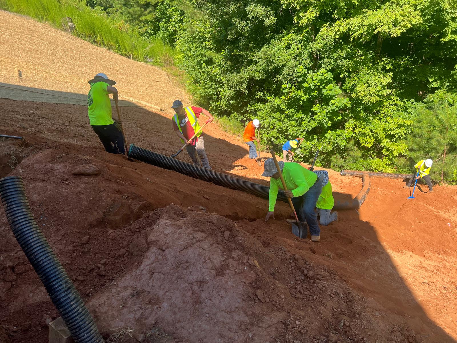 The contractor had prepared the slope area located east of Lot #92. Imported soil was evenly spread across the area and compacted using a dozer. For erosion control and stabilization, pine straw was placed on the slope, and sod along with Bermuda grass was installed around House #92. Additionally, the contractor installed single-sided erosion control matting to further stabilize the area. The originally installed 8-inch pipe and 24-by-24-inch drainage box were removed and relocated to a new position at the request of the owner, who was dissatisfied with their initial placement. The existing Bermuda grass around the house was removed due to its deteriorated condition, and new Bermuda sod is scheduled to be installed the following day. Furthermore, hydroseeding was performed using a mix of lovegrass, clover, and fescue to enhance ground cover and promote long-term stabilization.