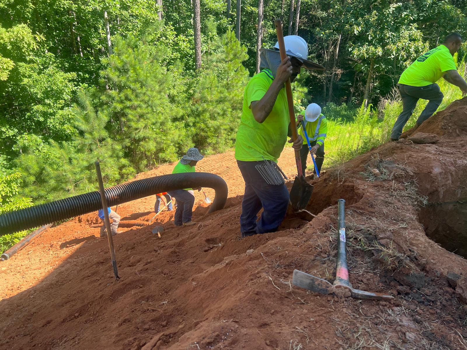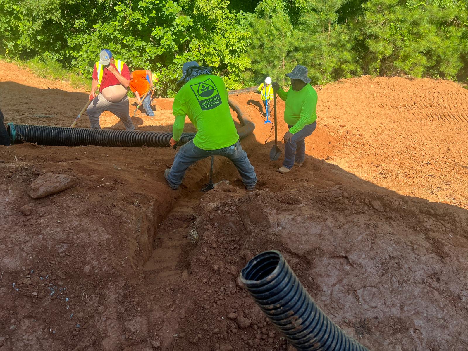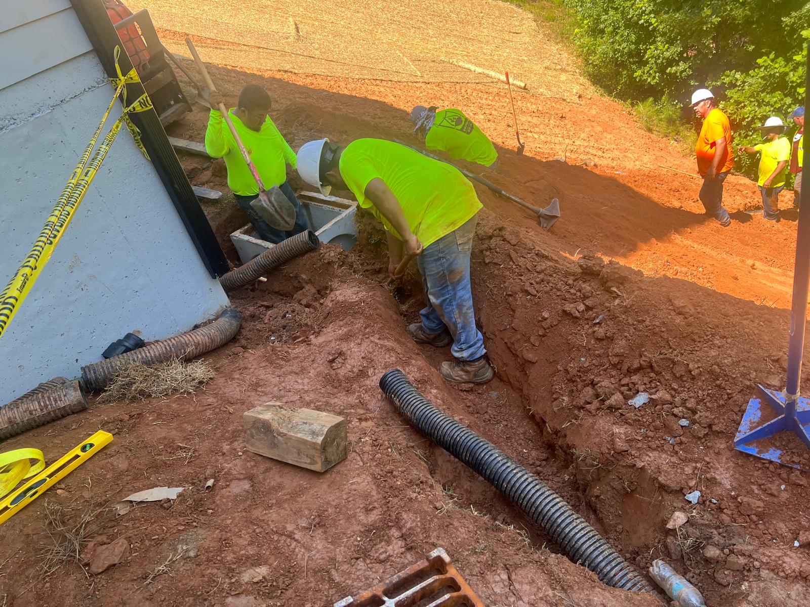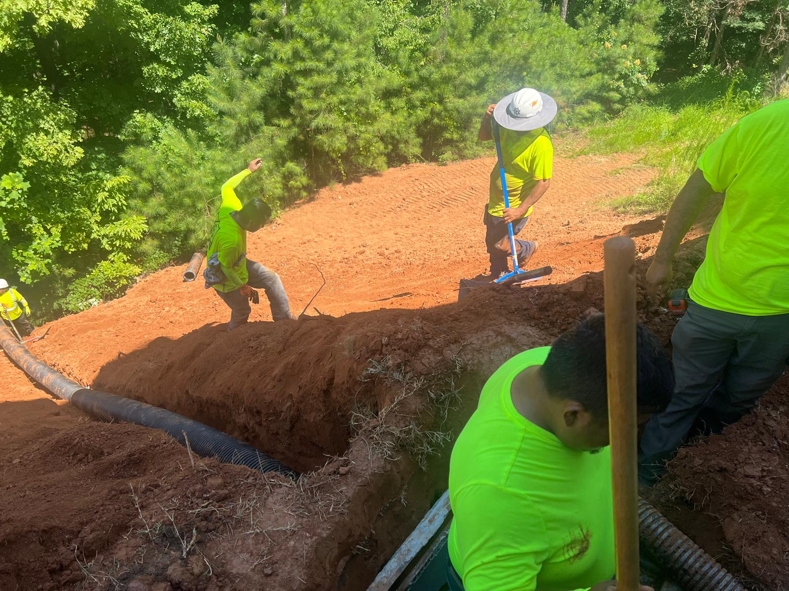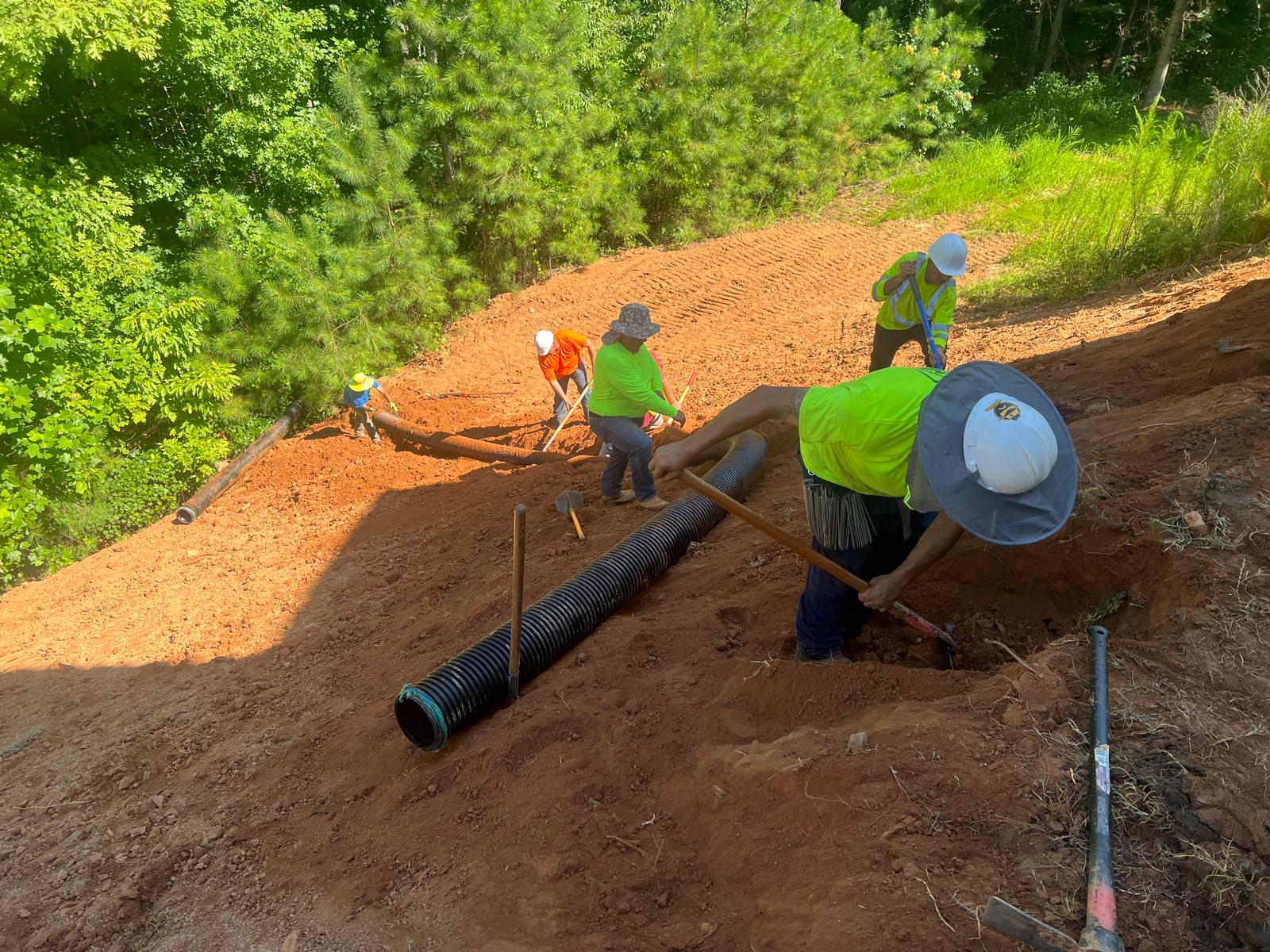 The contractor had prepared the slope area located east of Lot #92. Imported soil was evenly spread across the area and compacted using a dozer. For erosion control and stabilization, pine straw was placed on the slope, and sod along with Bermuda grass was installed around House #92. Additionally, the contractor installed single-sided erosion control matting to further stabilize the area. The originally installed 8-inch pipe and 24-by-24-inch drainage box were removed and relocated to a new position at the request of the owner, who was dissatisfied with their initial placement. The existing Bermuda grass around the house was removed due to its deteriorated condition, and new Bermuda sod is scheduled to be installed the following day. Furthermore, hydroseeding was performed using a mix of lovegrass, clover, and fescue to enhance ground cover and promote long-term stabilization.