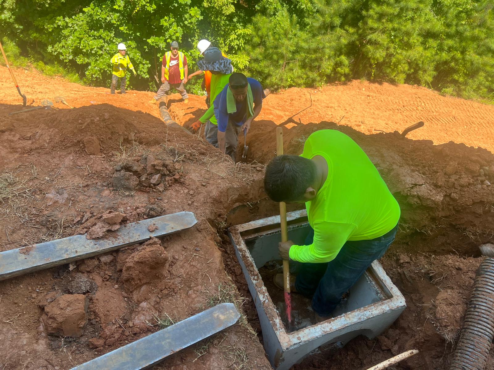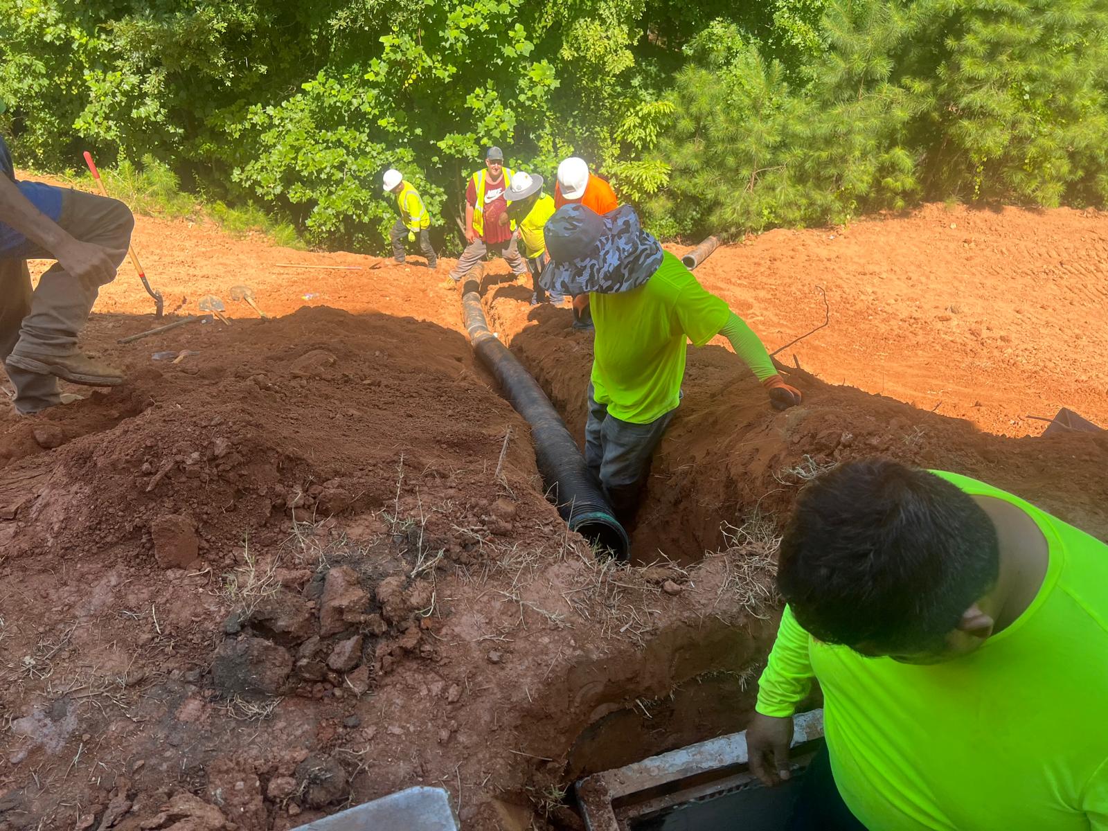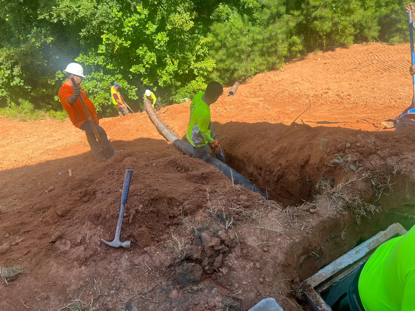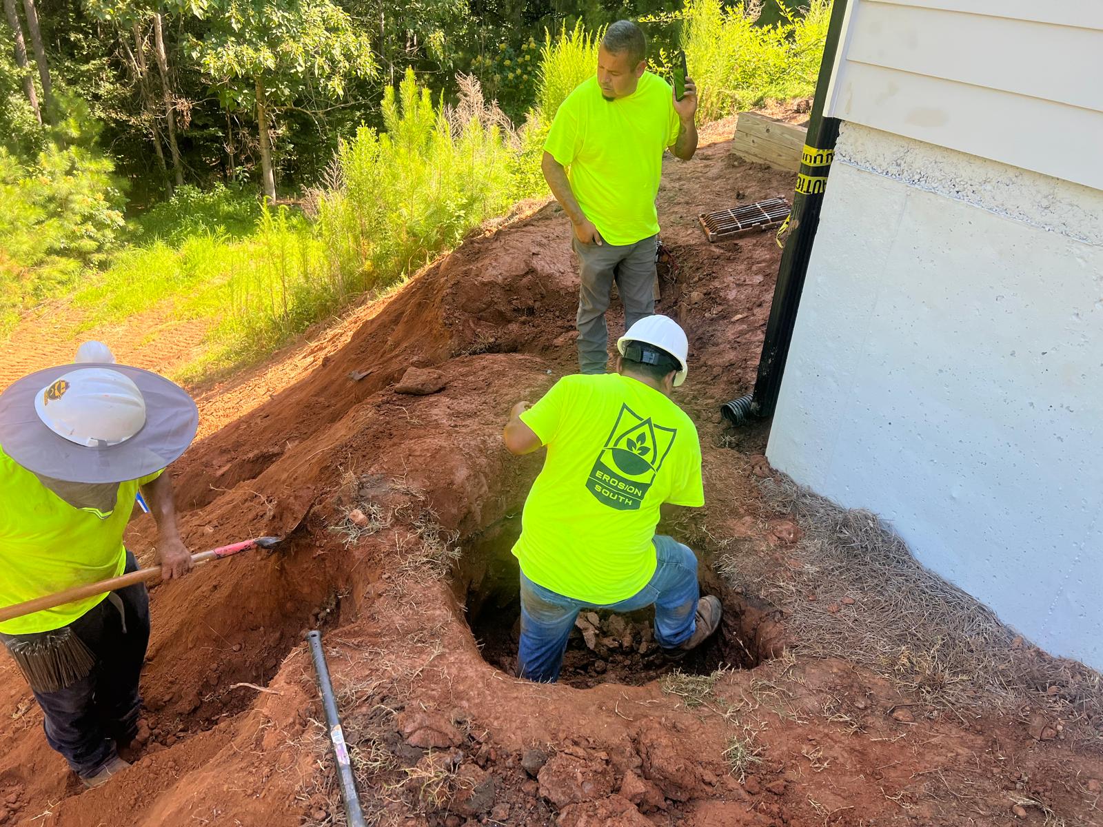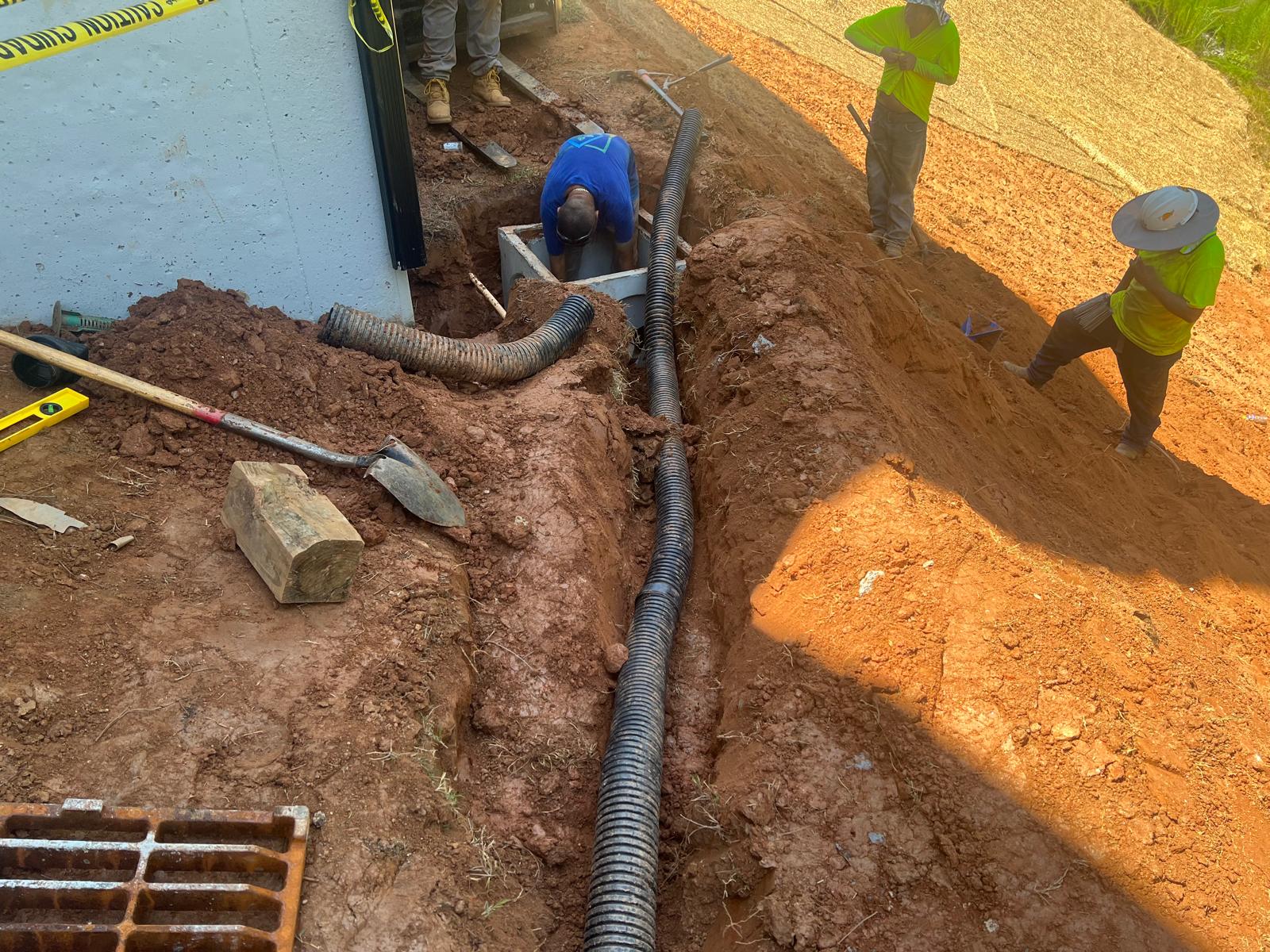 The contractor had prepared the slope area located east of Lot #92. Imported soil was evenly spread across the area and compacted using a dozer. For erosion control and stabilization, pine straw was placed on the slope, and sod along with Bermuda grass was installed around House #92. Additionally, the contractor installed single-sided erosion control matting to further stabilize the area. The originally installed 8-inch pipe and 24-by-24-inch drainage box were removed and relocated to a new position at the request of the owner, who was dissatisfied with their initial placement. The existing Bermuda grass around the house was removed due to its deteriorated condition, and new Bermuda sod is scheduled to be installed the following day. Furthermore, hydroseeding was performed using a mix of lovegrass, clover, and fescue to enhance ground cover and promote long-term stabilization.