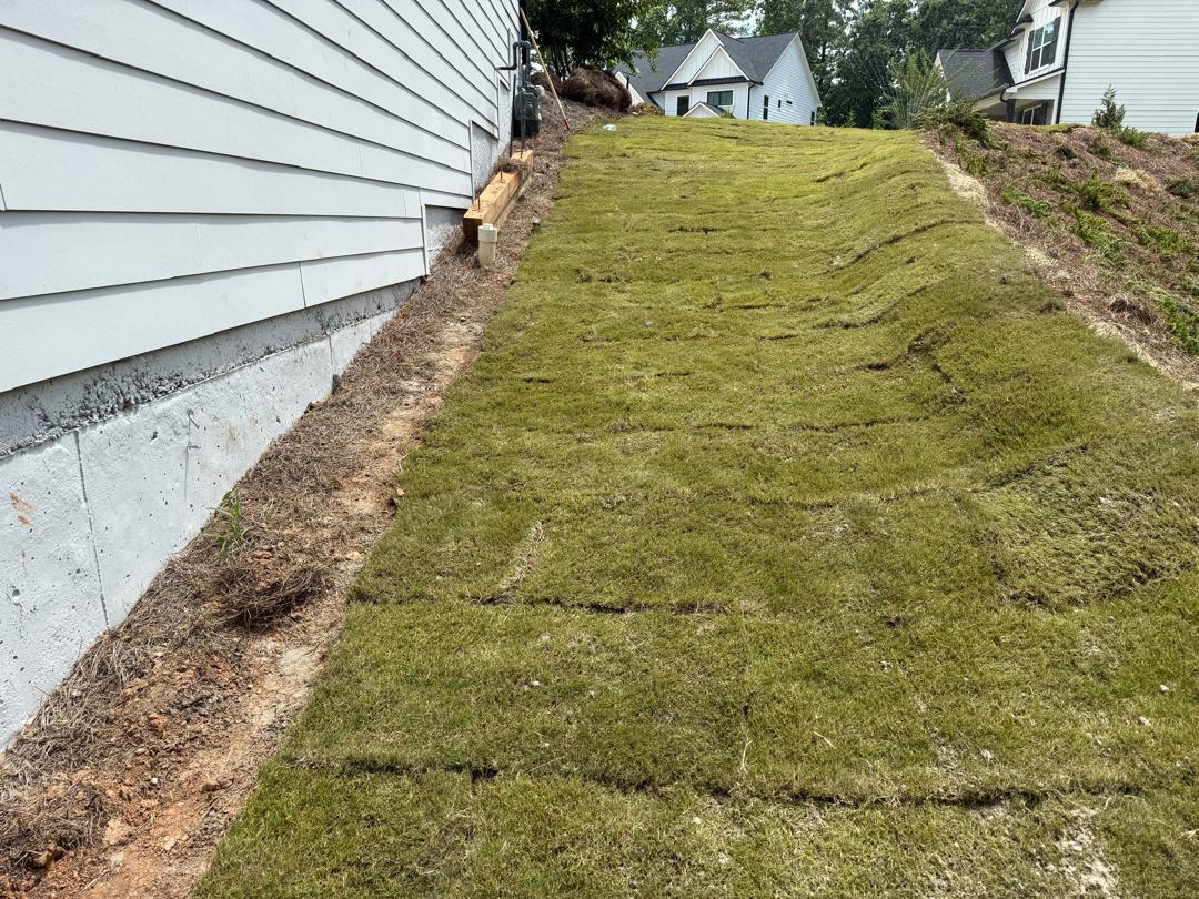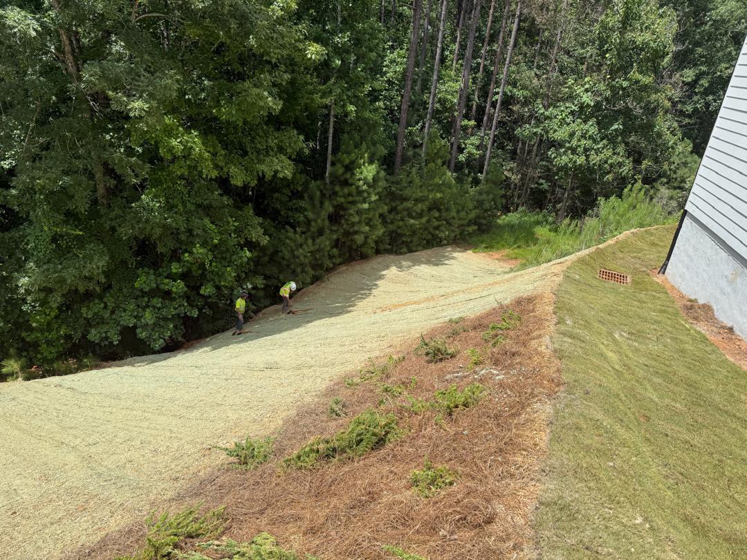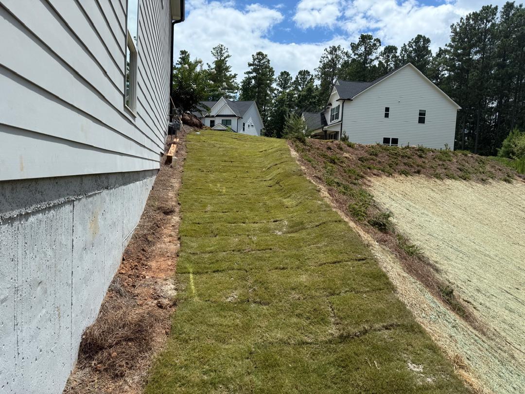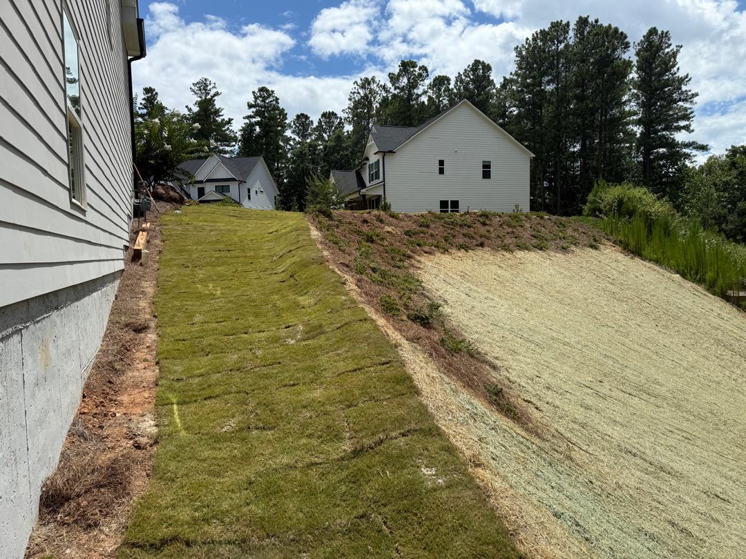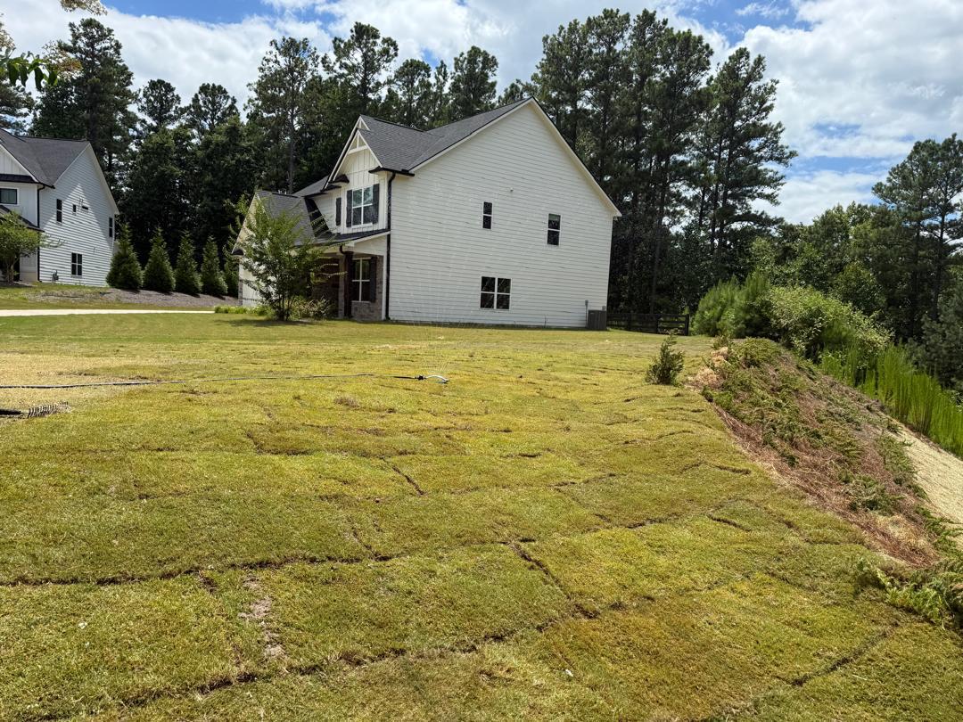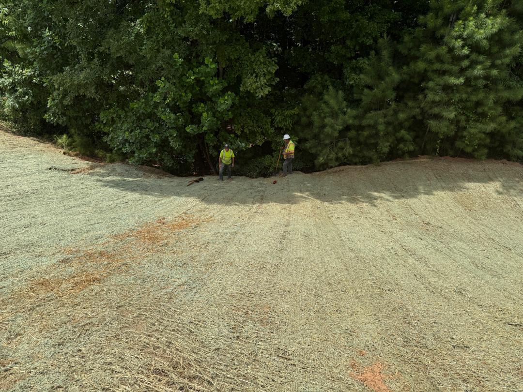 During the site visit, new Bermuda grass was installed around the house as well as in areas where machinery had been operating to restore disturbed ground. Additionally, hydroseeding was performed using a mix of lovegrass, clover, and fescue to promote vegetation growth and long-term site stabilization.