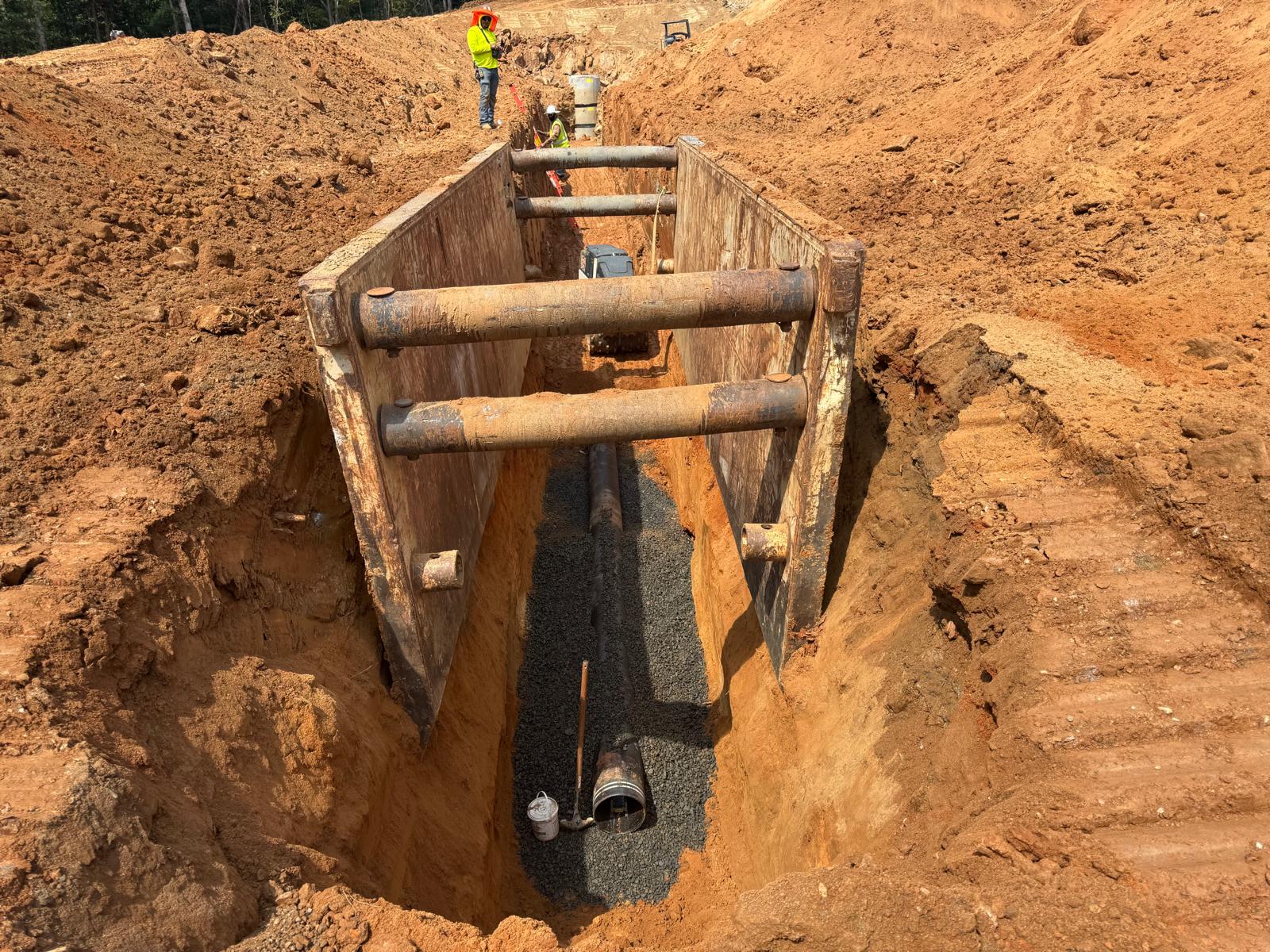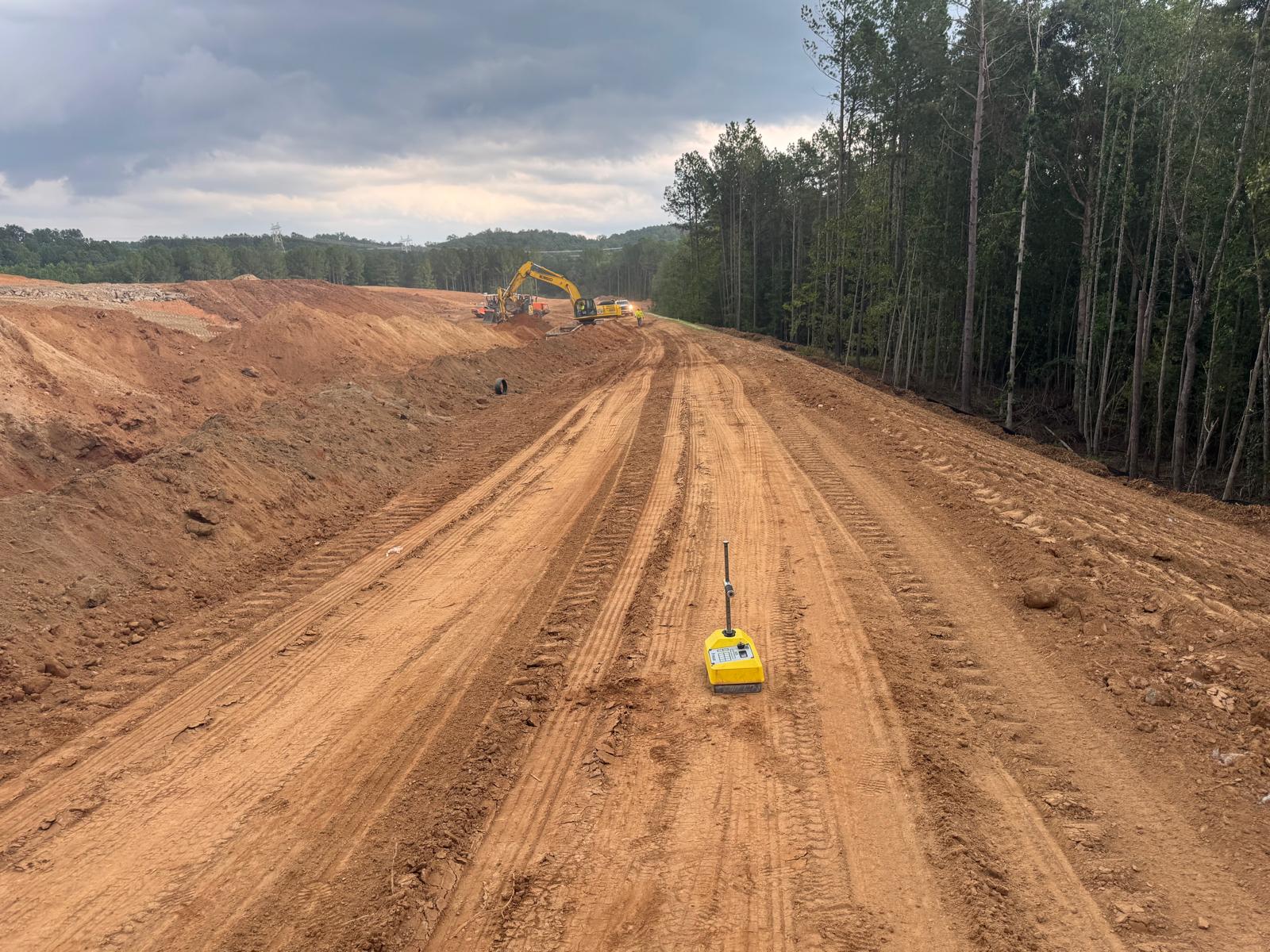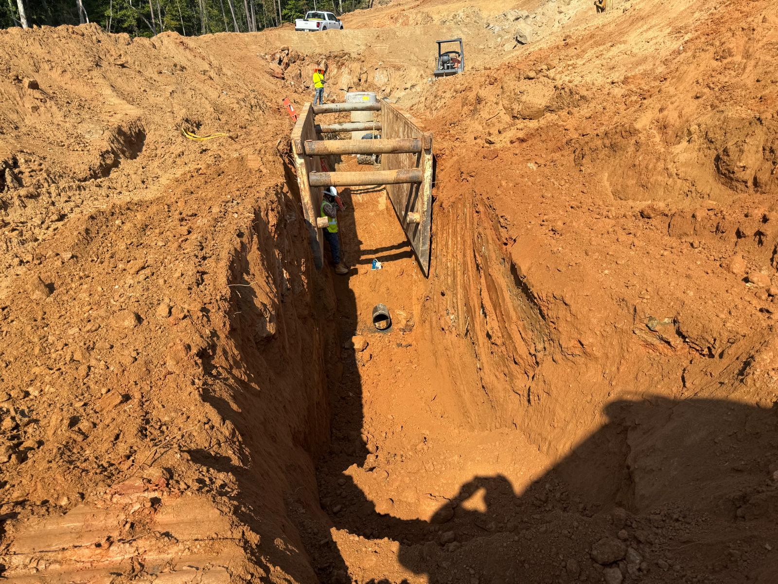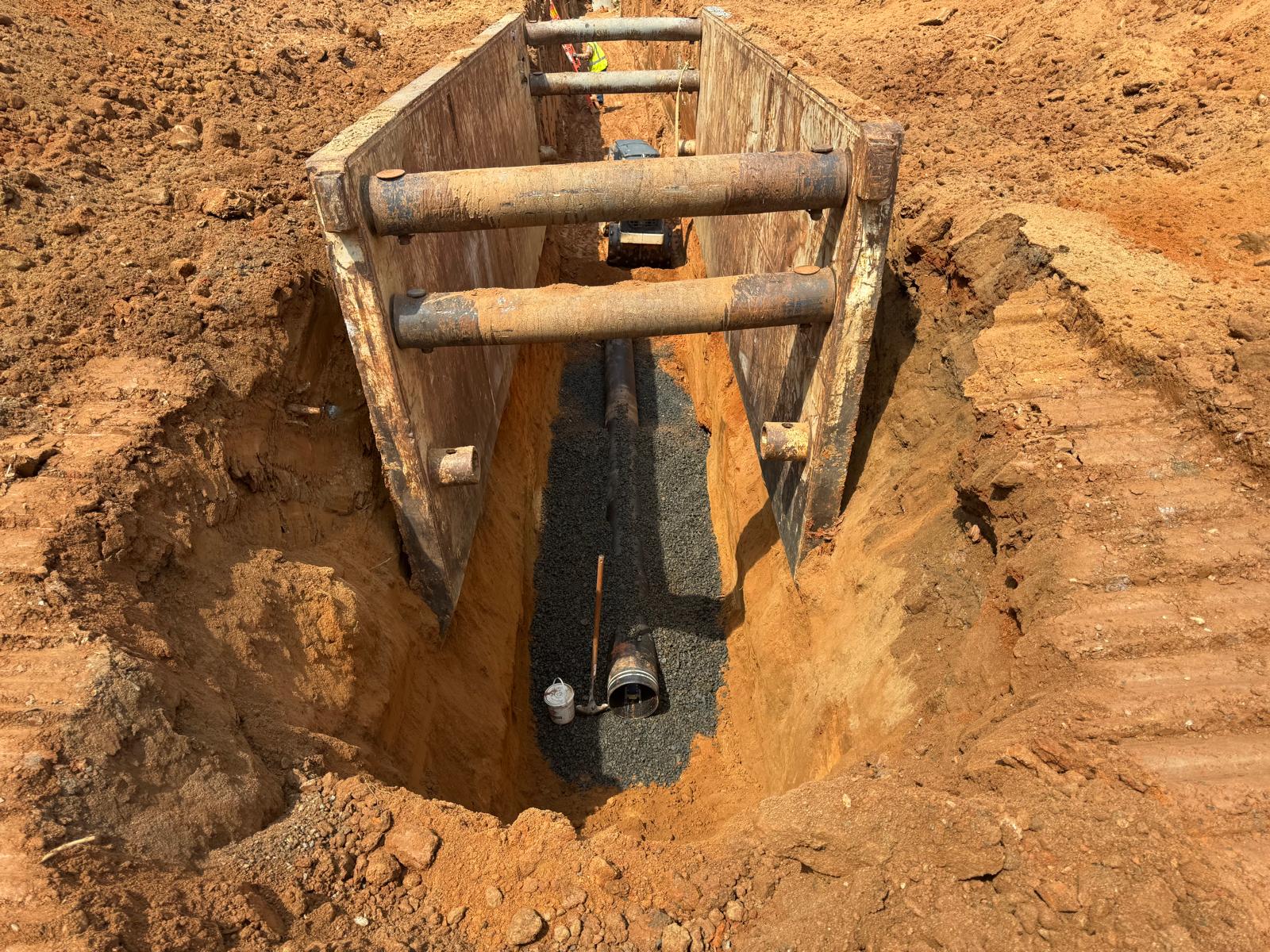 The placement and compaction of fill for the sewer trench between MHB9 to MH9 and MH8, continued on this day. Upon arrival, the ASEC representative observed active work in progress, with fill being placed in 1-foot lifts. Compaction was carried out using a sheeps-foot roller (14-ton) along with a trench compactor for the sewer trench. Compaction testing was performed using a Troxler nuclear density gauge, supplemented by general probing with a 3/8″ diameter probe rod. The density test results indicated that most of the compacted materials met the project requirement of achieving at least 95% of the maximum dry density, in accordance with ASTM D698 (Standard Proctor).