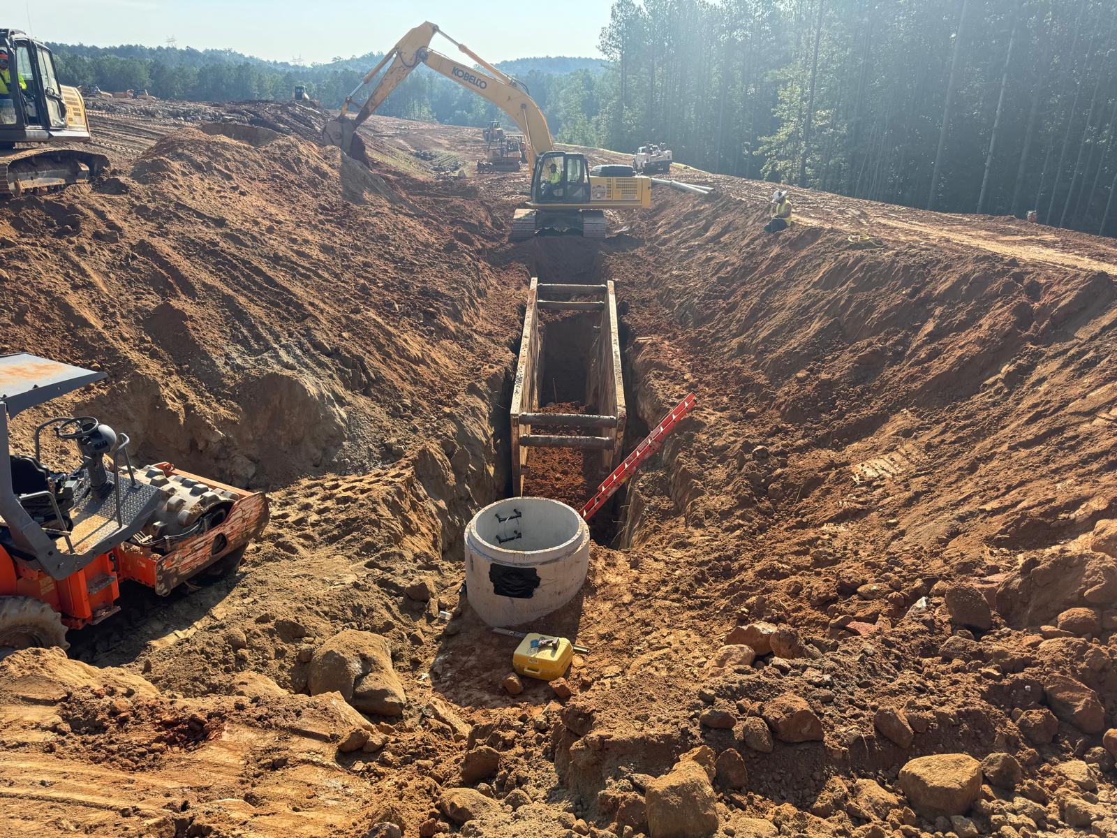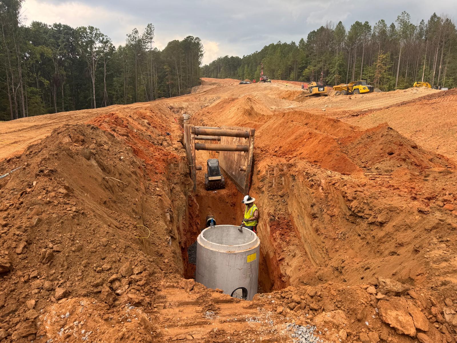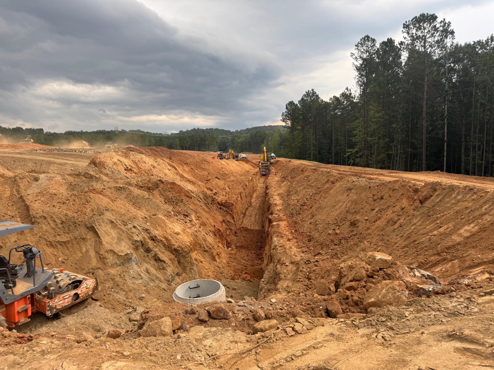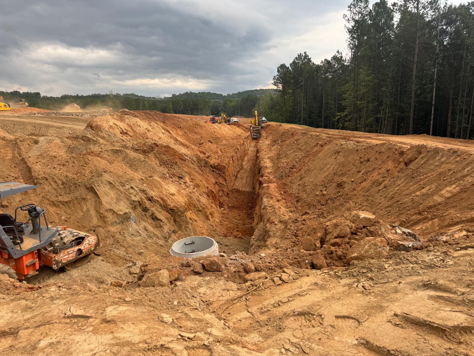 The placement and compaction of fill for the sewer trench between MHB9 to MH9 and MH8, continued on this day. Upon arrival, the ASEC representative observed active work in progress, with fill being placed in 1-foot lifts. Compaction was carried out using a sheeps-foot roller (14-ton) along with a trench compactor for the sewer trench. Compaction testing was performed using a Troxler nuclear density gauge, supplemented by general probing with a 3/8″ diameter probe rod. The density test results indicated that most of the compacted materials met the project requirement of achieving at least 95% of the maximum dry density, in accordance with ASTM D698 (Standard Proctor).