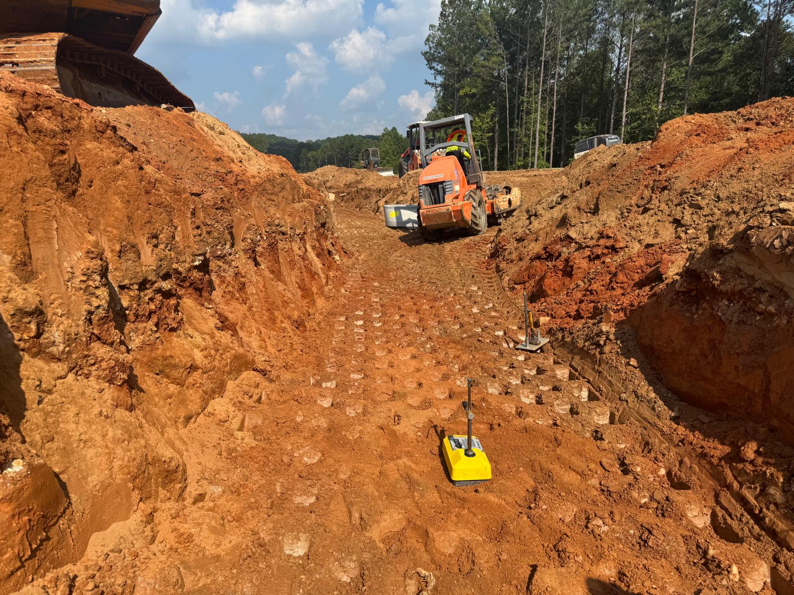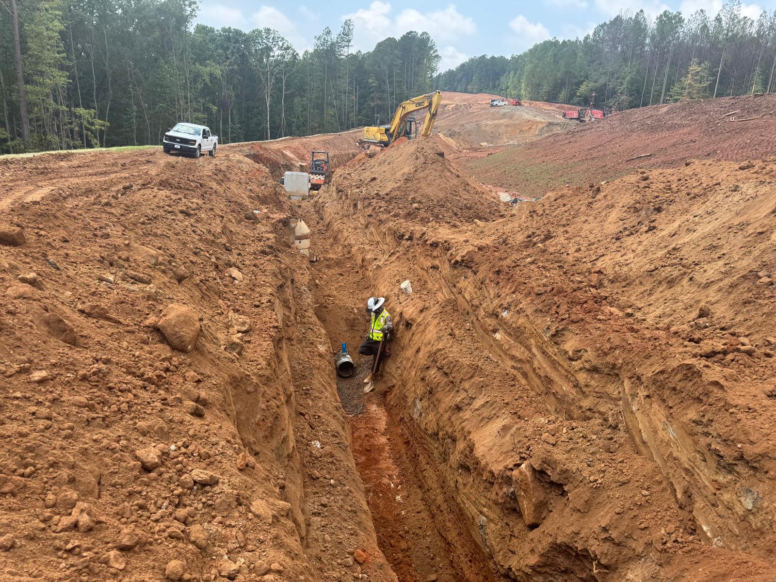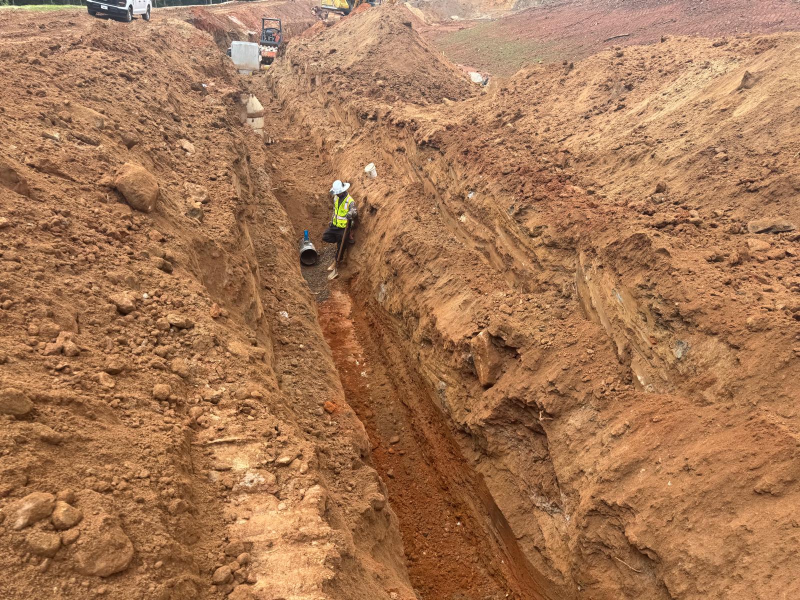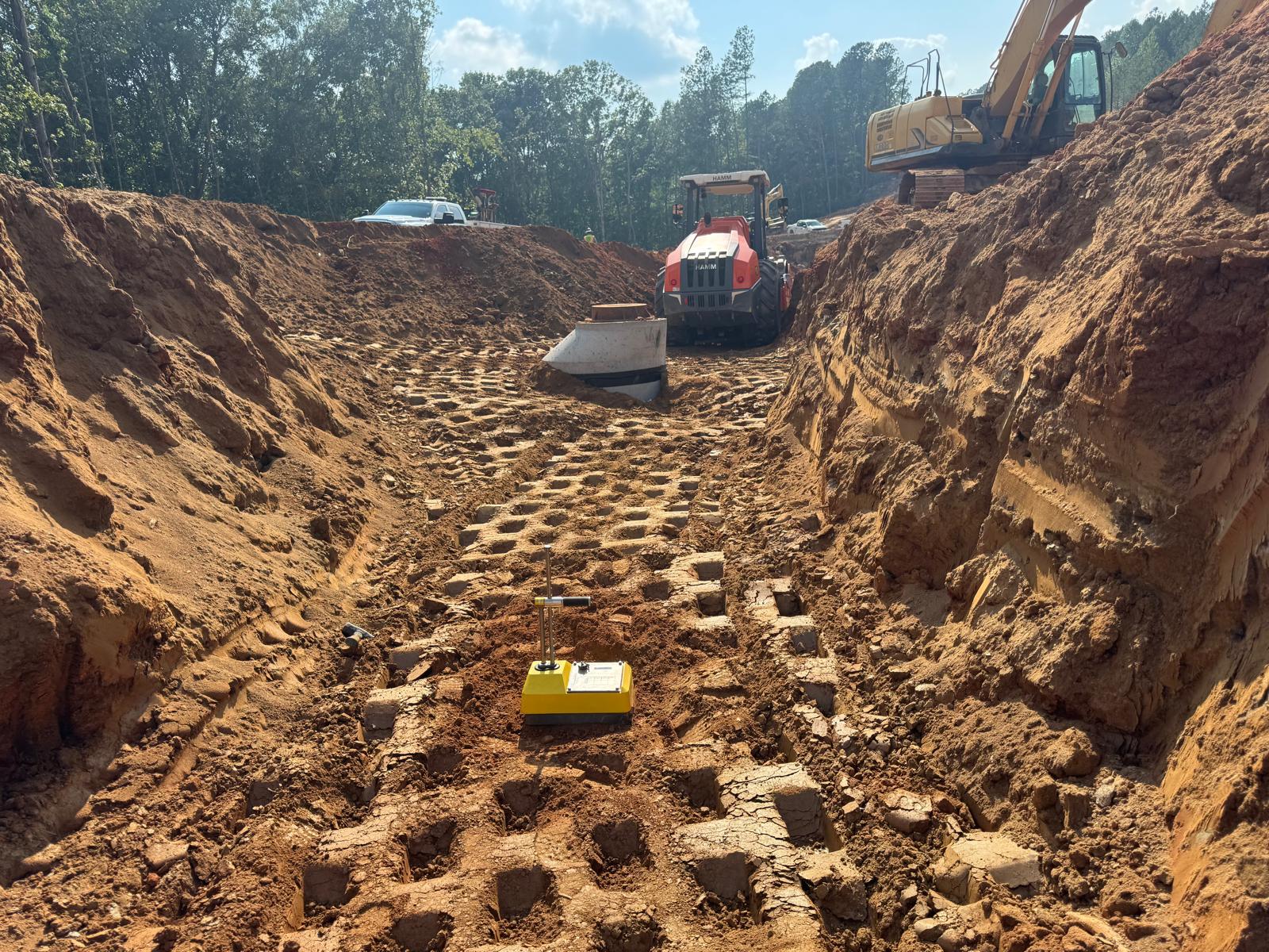 The placement and compaction of fill for the sewer trench between MH9 to MH8 and MH6, continued on this day. Upon arrival, the ASEC representative observed active work in progress, with fill being placed in 1-foot lifts. Compaction was carried out using a sheeps-foot roller (14-ton) along with a trench compactor for the sewer trench. Compaction testing was performed using a Troxler nuclear density gauge, supplemented by general probing with a 3/8″ diameter probe rod. The density test results indicated that most of the compacted materials met the project requirement of achieving at least 95% of the maximum dry density, in accordance with ASTM D698 (Standard Proctor).