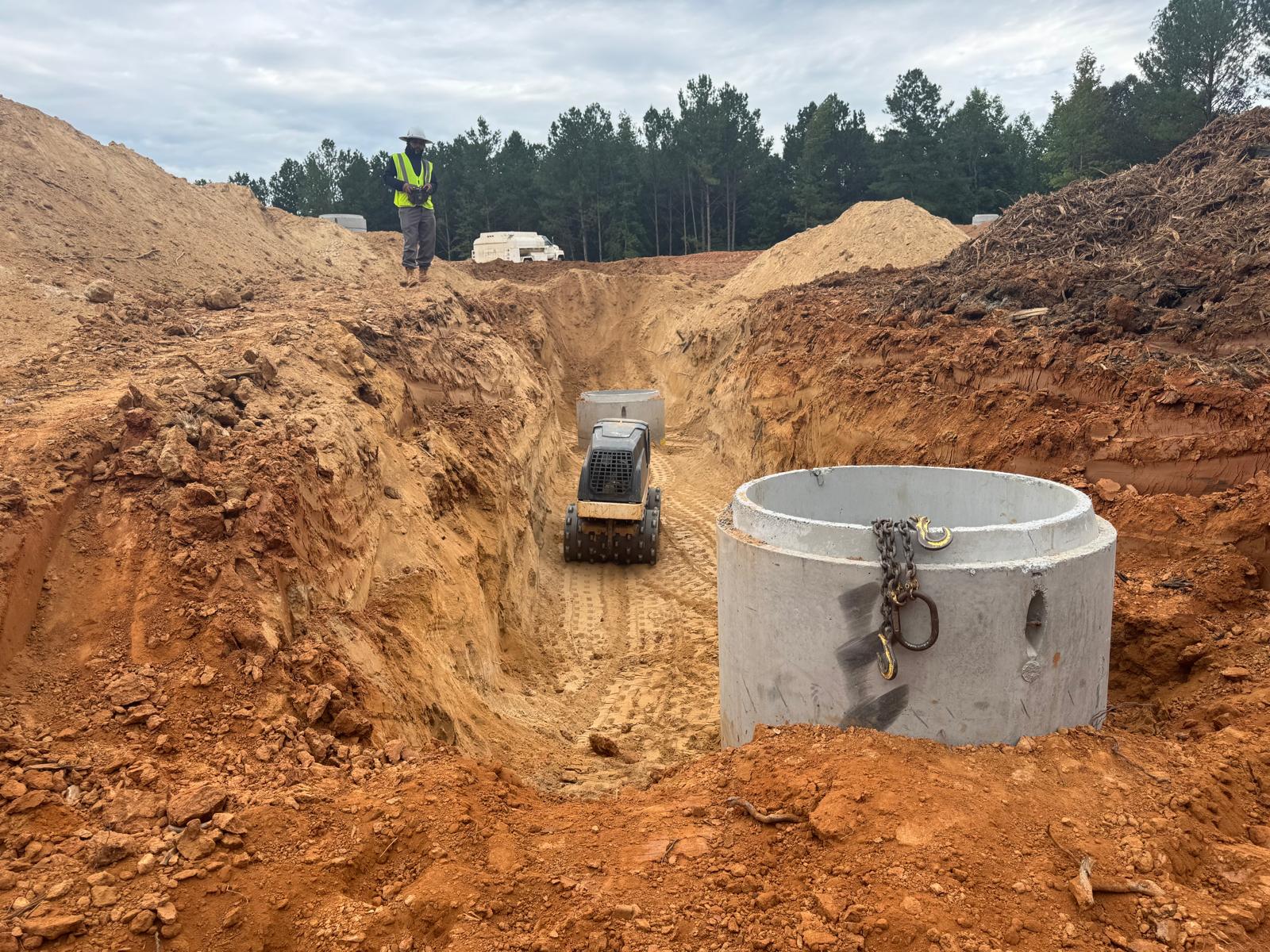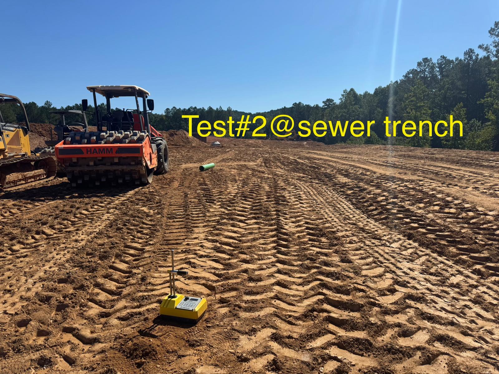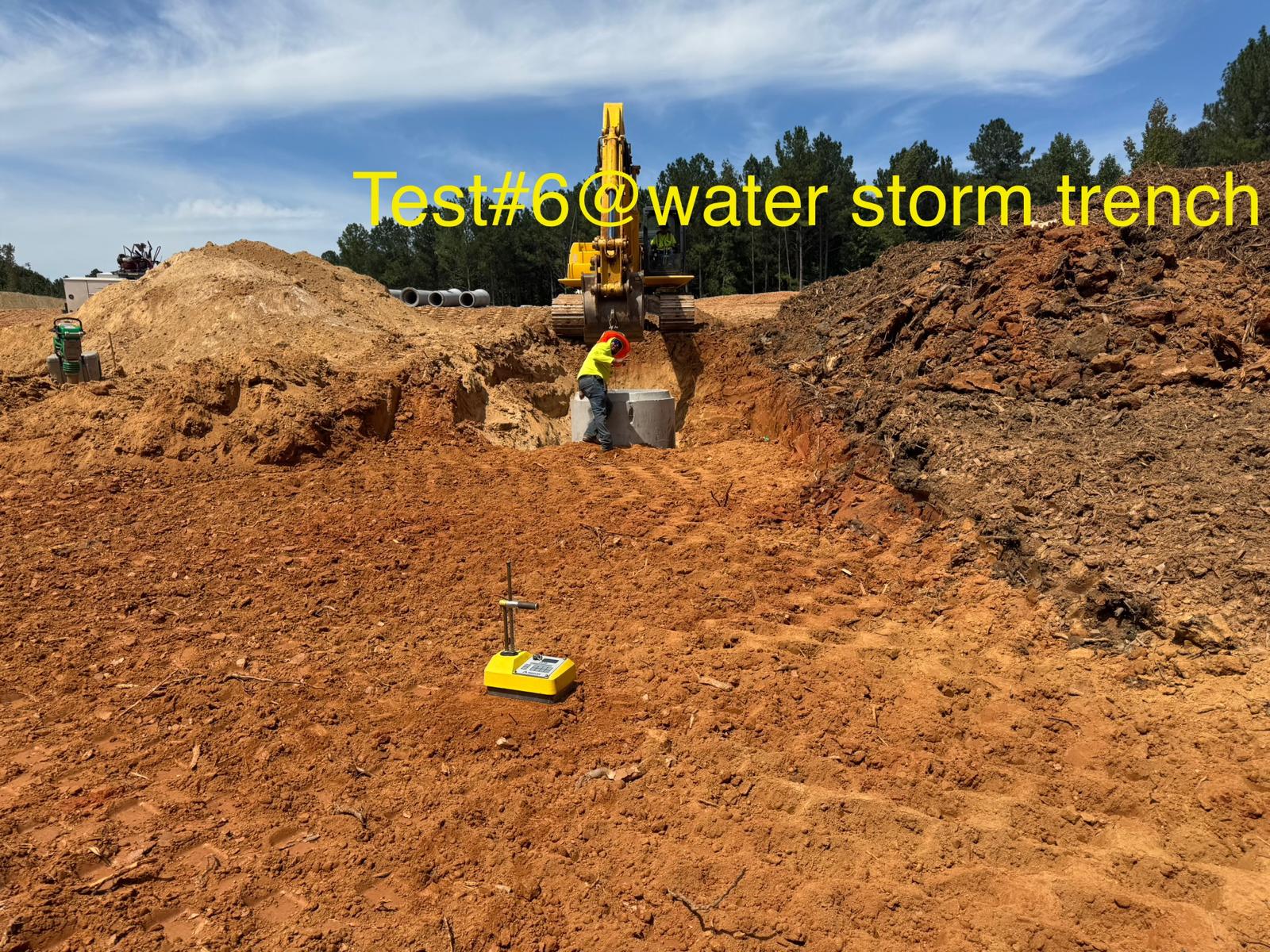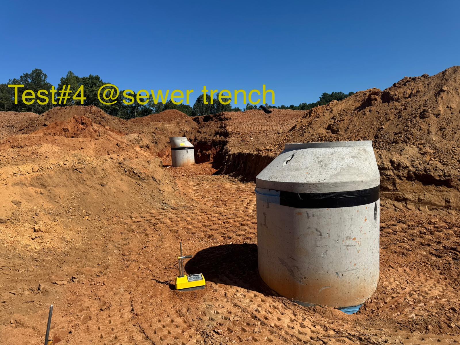 The placement and compaction of backfill for the sewer trenches between MH8, MH6, and MH6A and the storm water trench from Headwall C1 to MHC2 and MHC3 continued on this day. Upon arrival, the ASEC representative observed active work in progress, with fill being placed in 1-foot lifts. Compaction was carried out using a sheeps-foot roller (14-ton) along with a trench compactor for the sewer trench. Compaction testing was performed using a Troxler nuclear density gauge, supplemented by general probing with a 3/8″ diameter probe rod. The density test results indicated that most of the compacted materials met the project requirement of achieving at least 95% of the maximum dry density, in accordance with ASTM D698 (Standard Proctor).