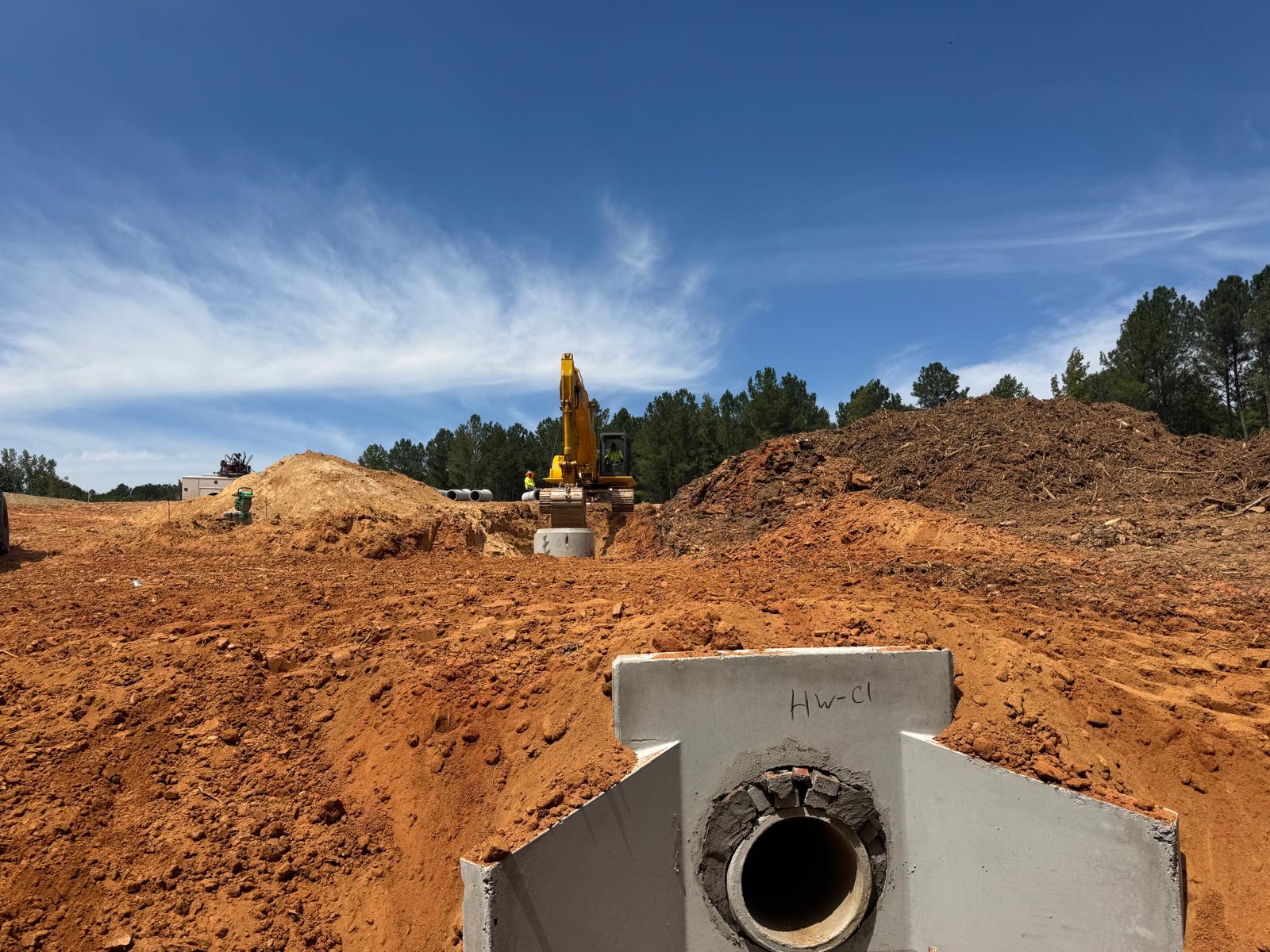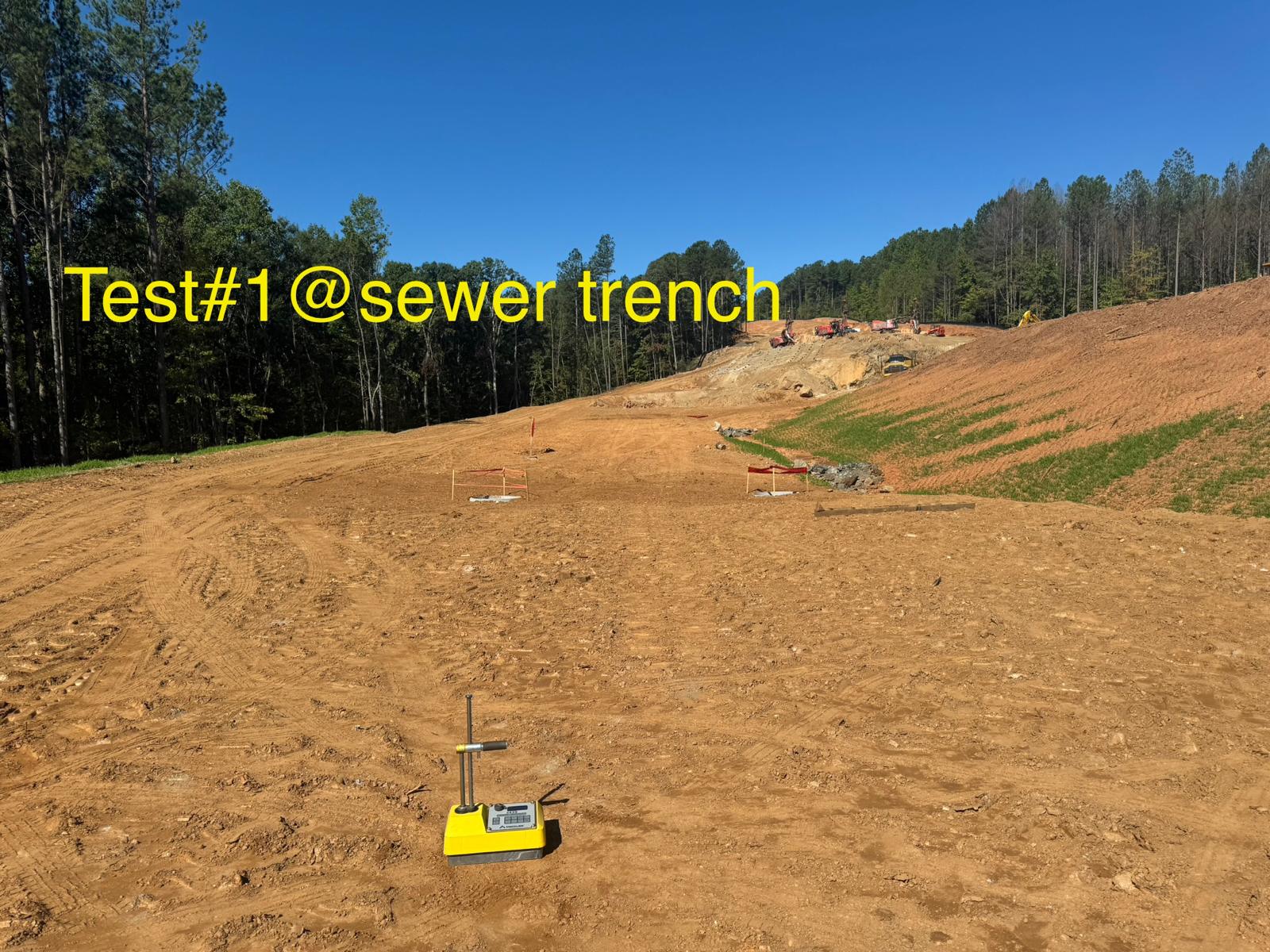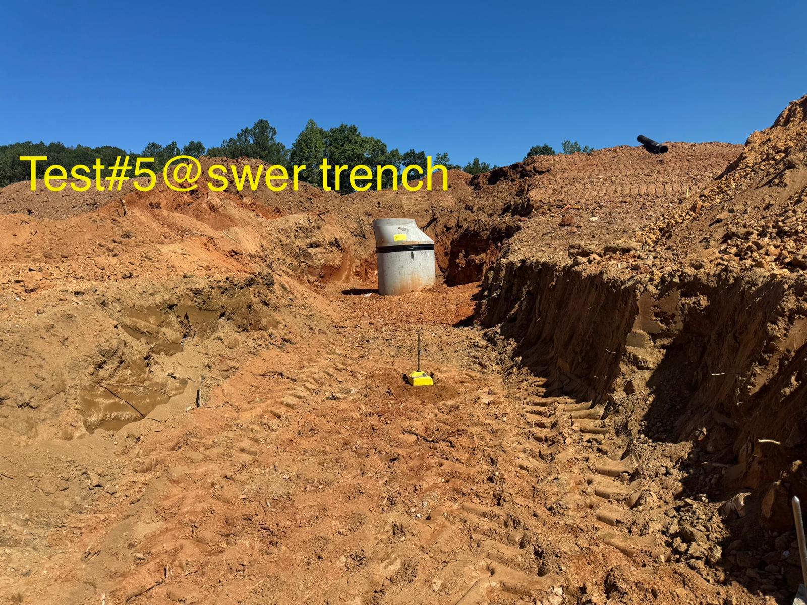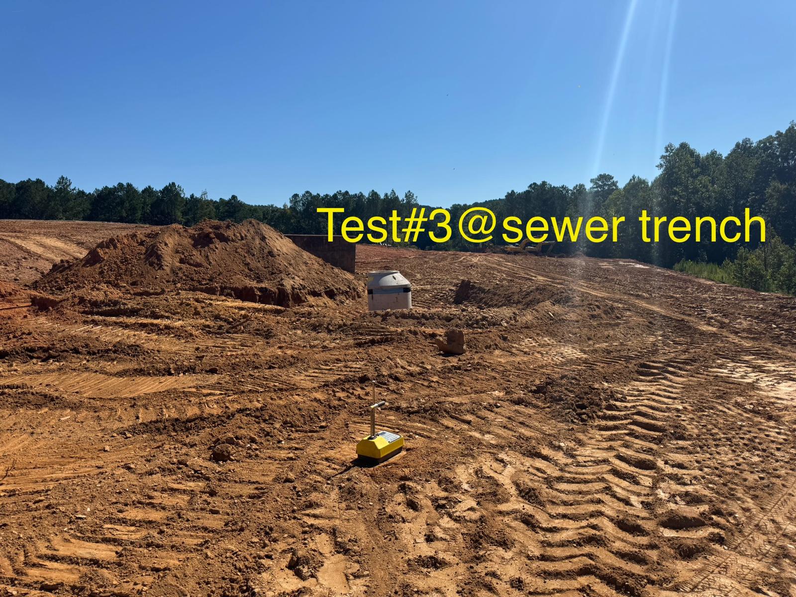 The placement and compaction of backfill for the sewer trenches between MH8, MH6, and MH6A and the storm water trench from Headwall C1 to MHC2 and MHC3 continued on this day. Upon arrival, the ASEC representative observed active work in progress, with fill being placed in 1-foot lifts. Compaction was carried out using a sheeps-foot roller (14-ton) along with a trench compactor for the sewer trench. Compaction testing was performed using a Troxler nuclear density gauge, supplemented by general probing with a 3/8″ diameter probe rod. The density test results indicated that most of the compacted materials met the project requirement of achieving at least 95% of the maximum dry density, in accordance with ASTM D698 (Standard Proctor).