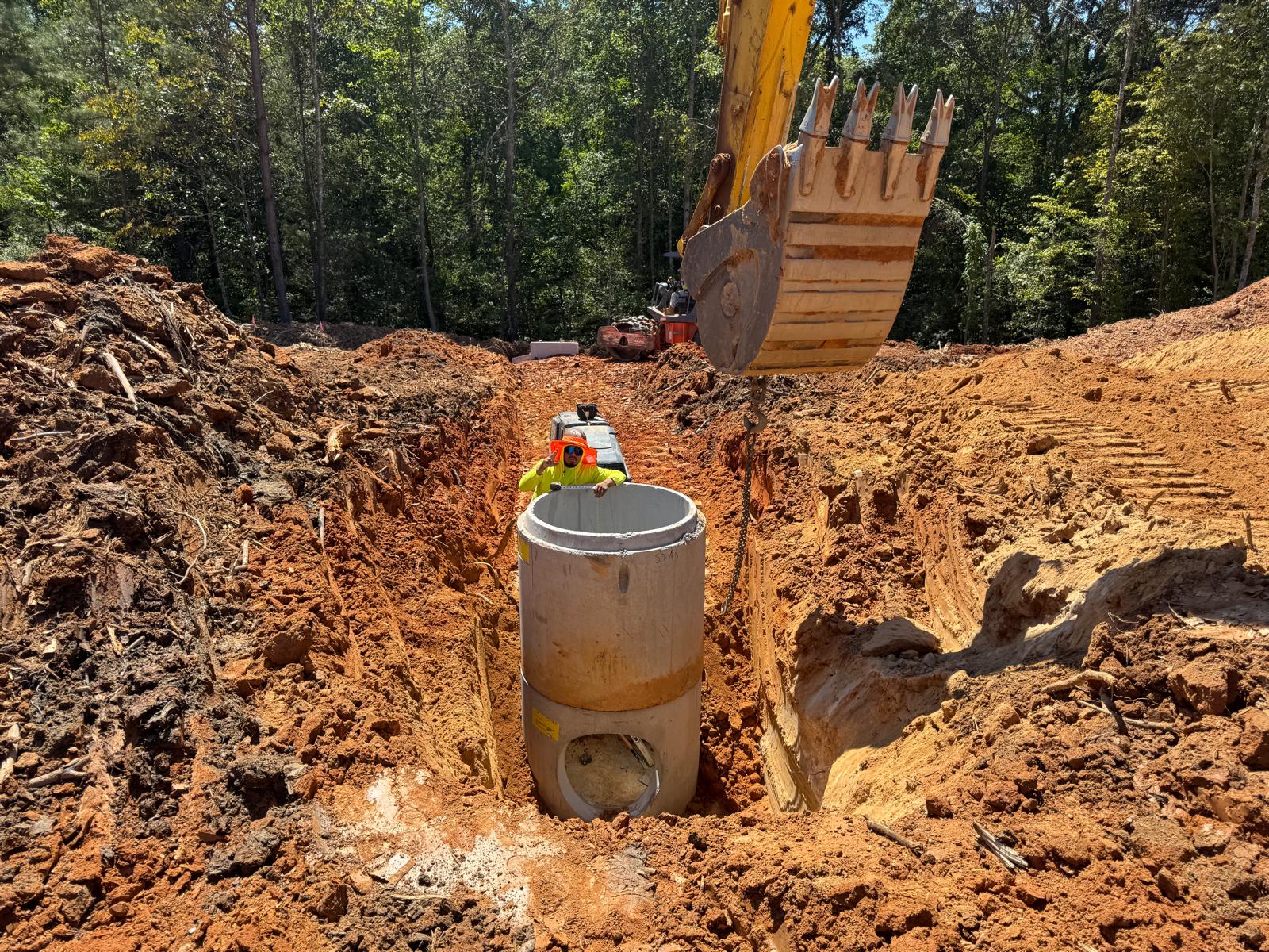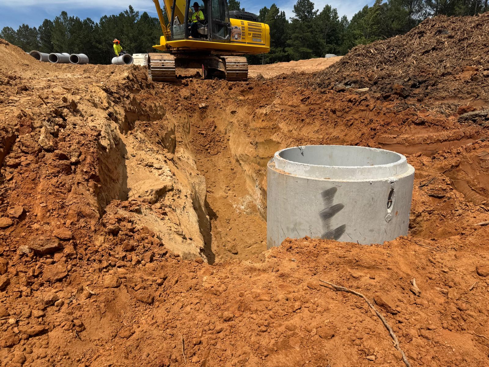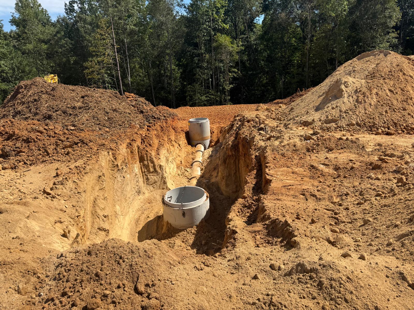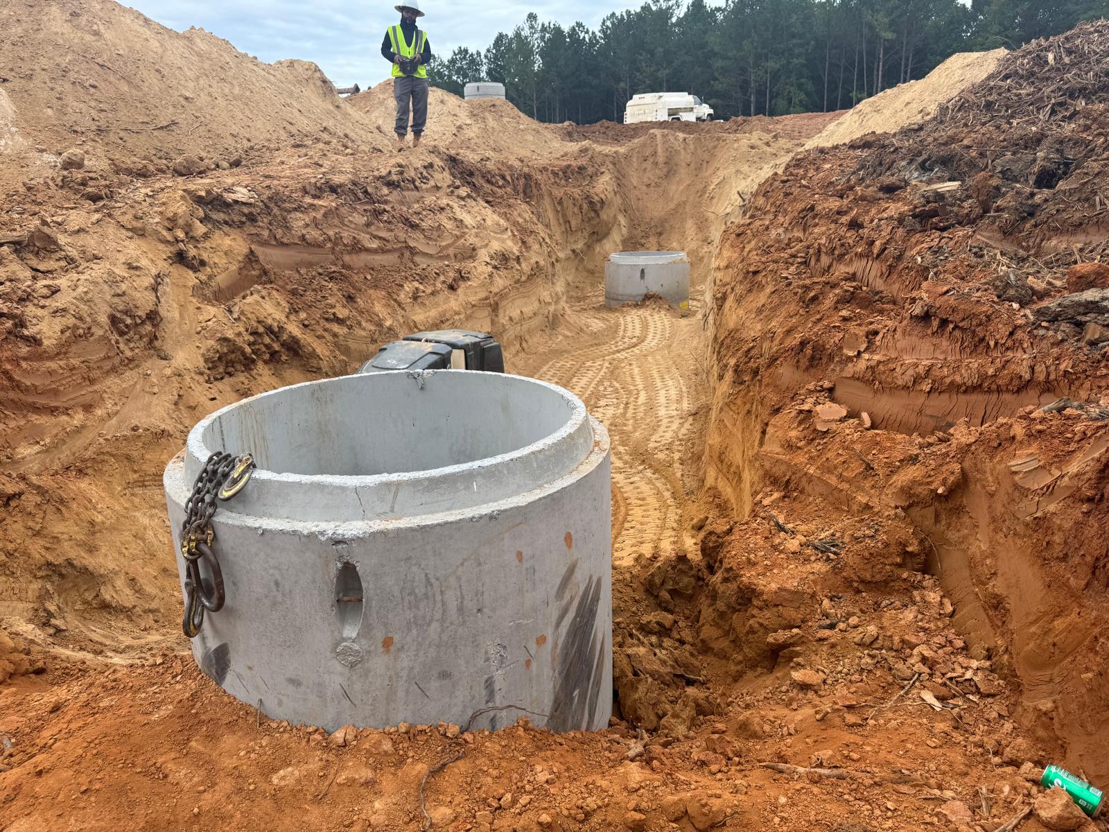 The placement and compaction of backfill for the sewer trenches between MH8, MH6, and MH6A and the storm water trench from Headwall C1 to MHC2 and MHC3 continued on this day. Upon arrival, the ASEC representative observed active work in progress, with fill being placed in 1-foot lifts. Compaction was carried out using a sheeps-foot roller (14-ton) along with a trench compactor for the sewer trench. Compaction testing was performed using a Troxler nuclear density gauge, supplemented by general probing with a 3/8″ diameter probe rod. The density test results indicated that most of the compacted materials met the project requirement of achieving at least 95% of the maximum dry density, in accordance with ASTM D698 (Standard Proctor).