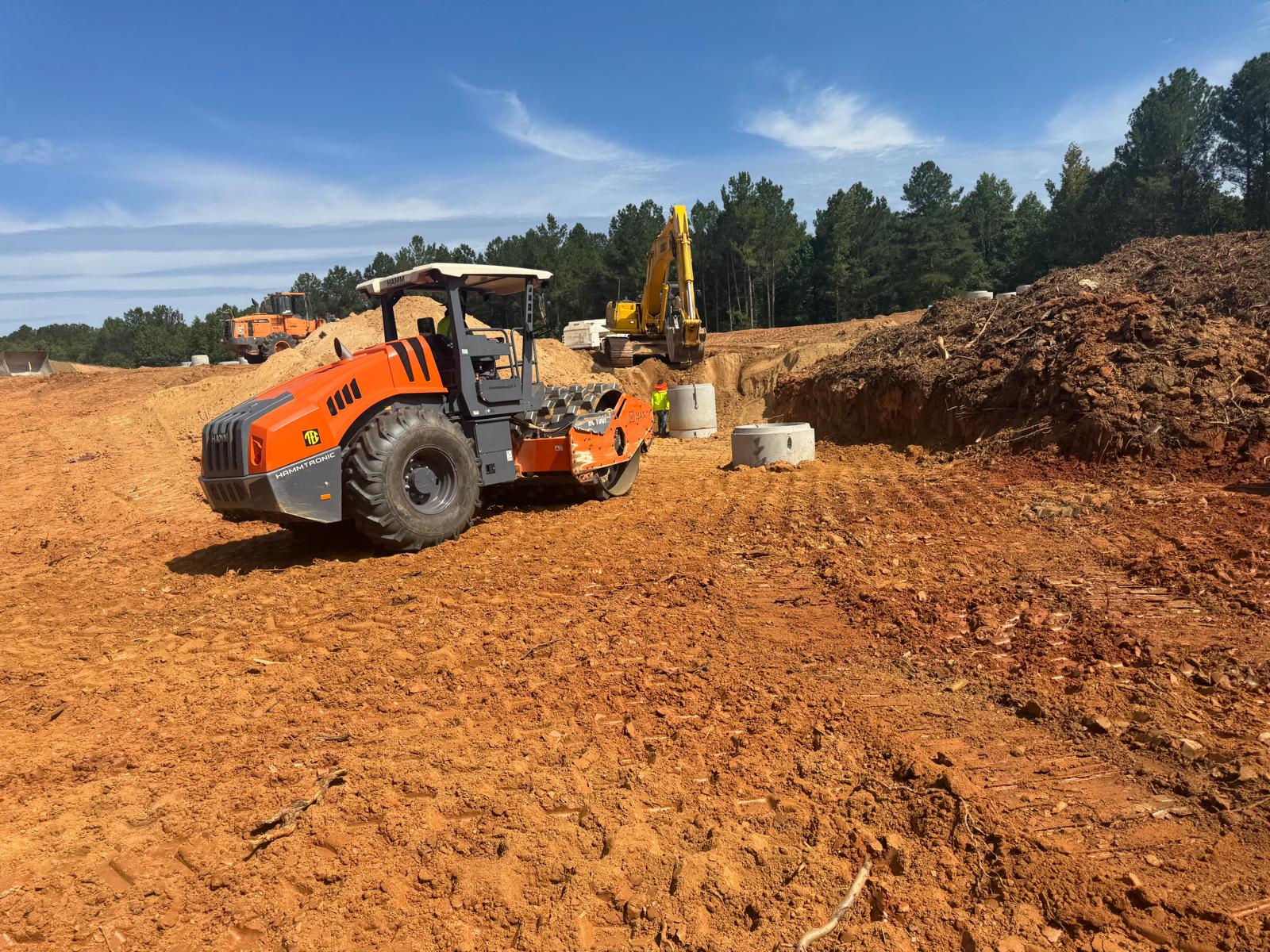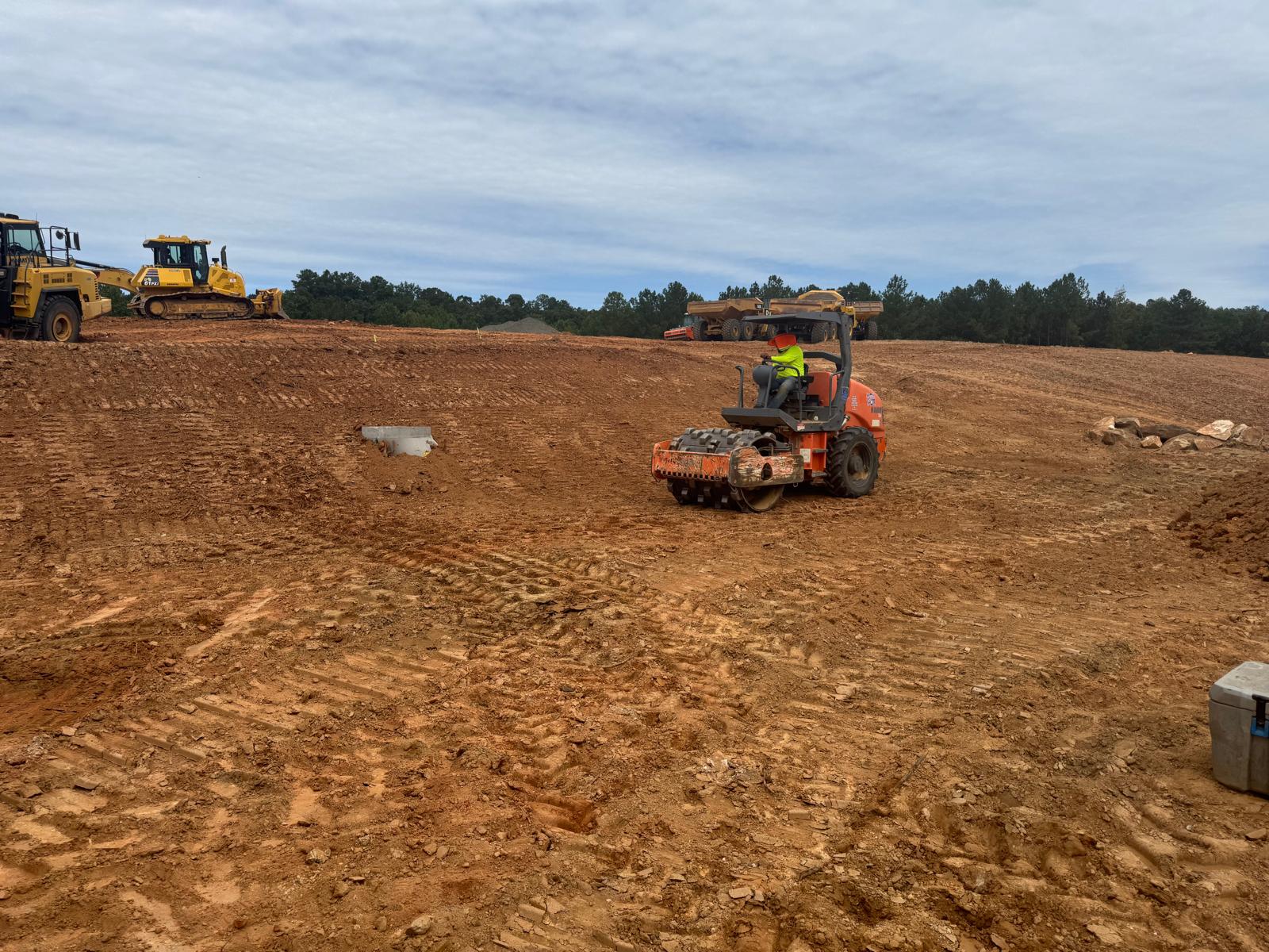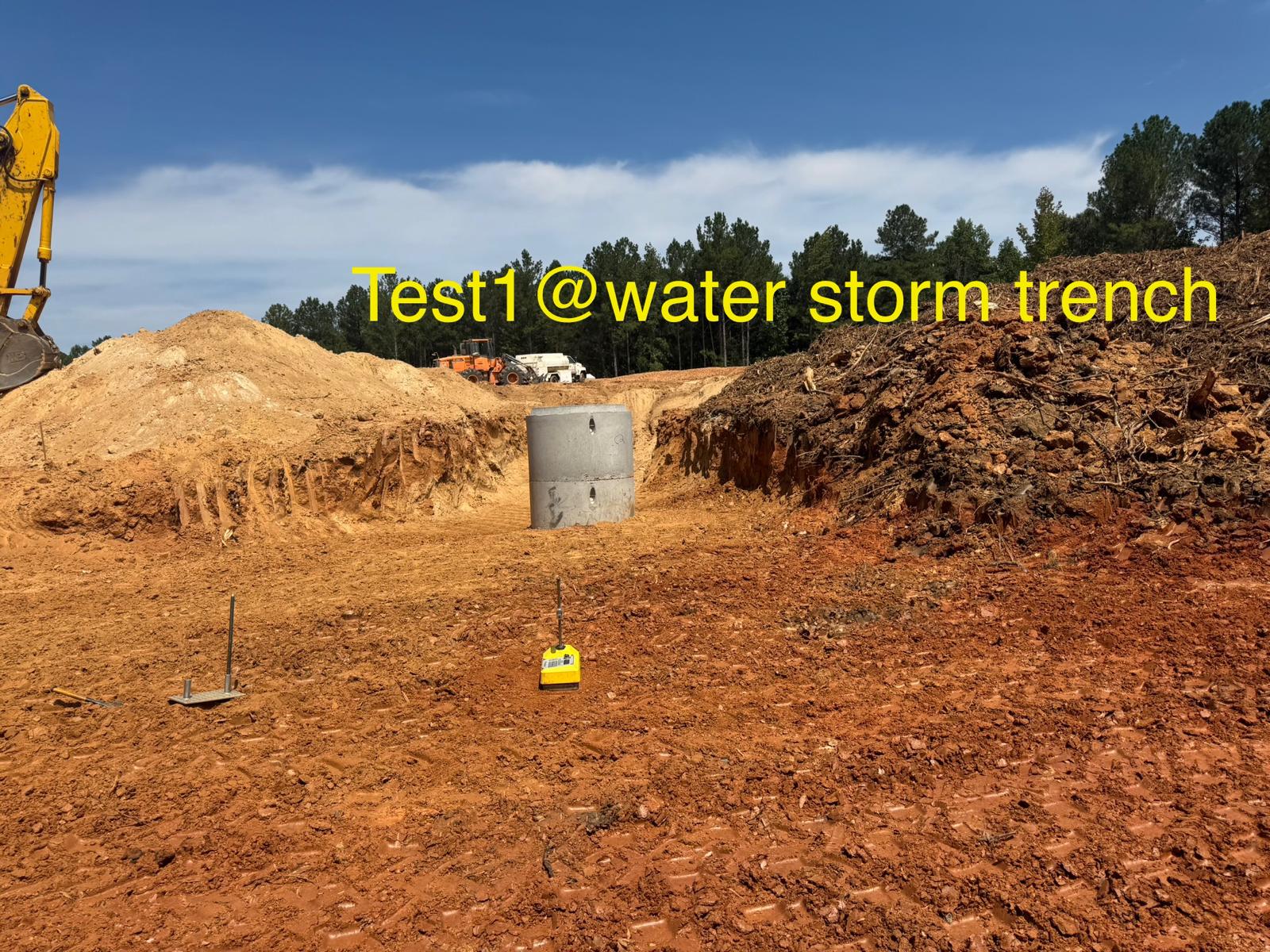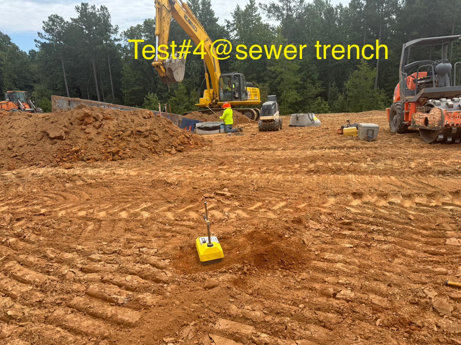 The placement and compaction of fill for the sewer trenches between MH6 and MH6A and Headwall C2 to MHC2 and MHC3 continued on this day. Upon arrival, the ASEC representative observed active work in progress, with fill being placed in 1-foot lifts. Compaction was carried out using a sheeps-foot roller (14-ton) along with a trench compactor for the sewer trench. Compaction testing was performed using a Troxler nuclear density gauge, supplemented by general probing with a 3/8″ diameter probe rod. The density test results indicated that most of the compacted materials met the project requirement of achieving at least 95% of the maximum dry density, in accordance with ASTM D698 (Standard Proctor).