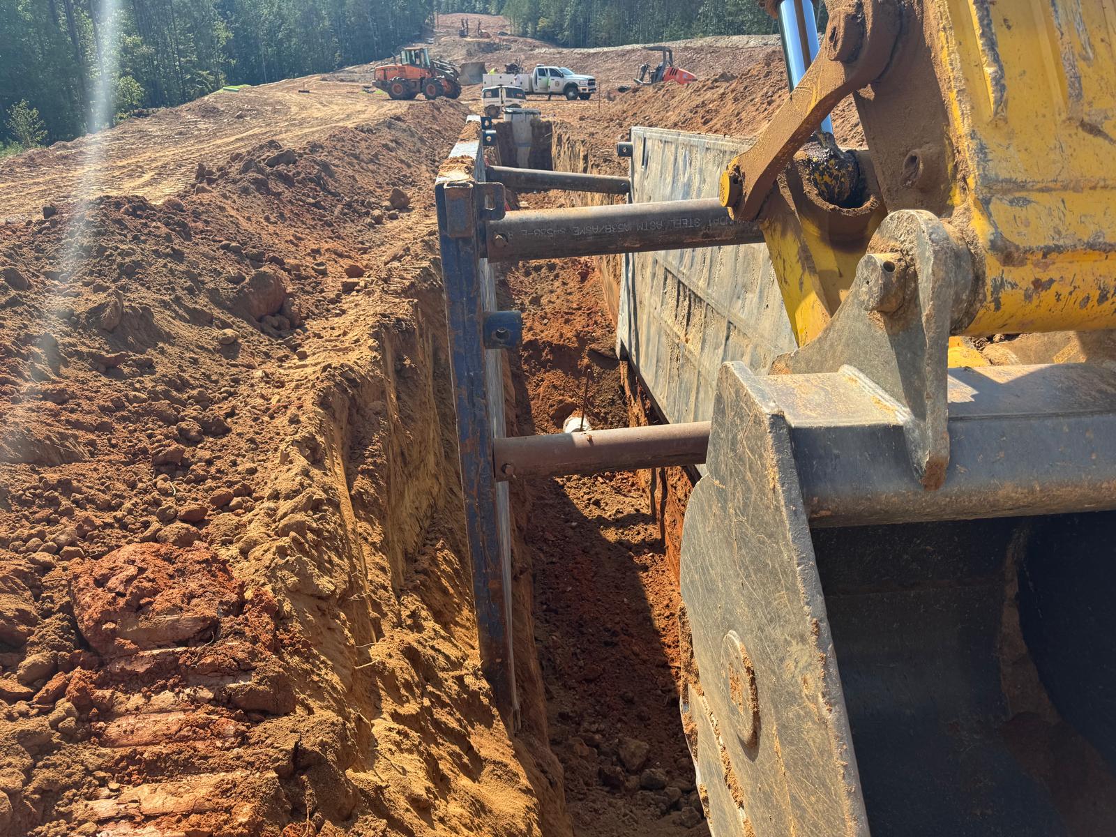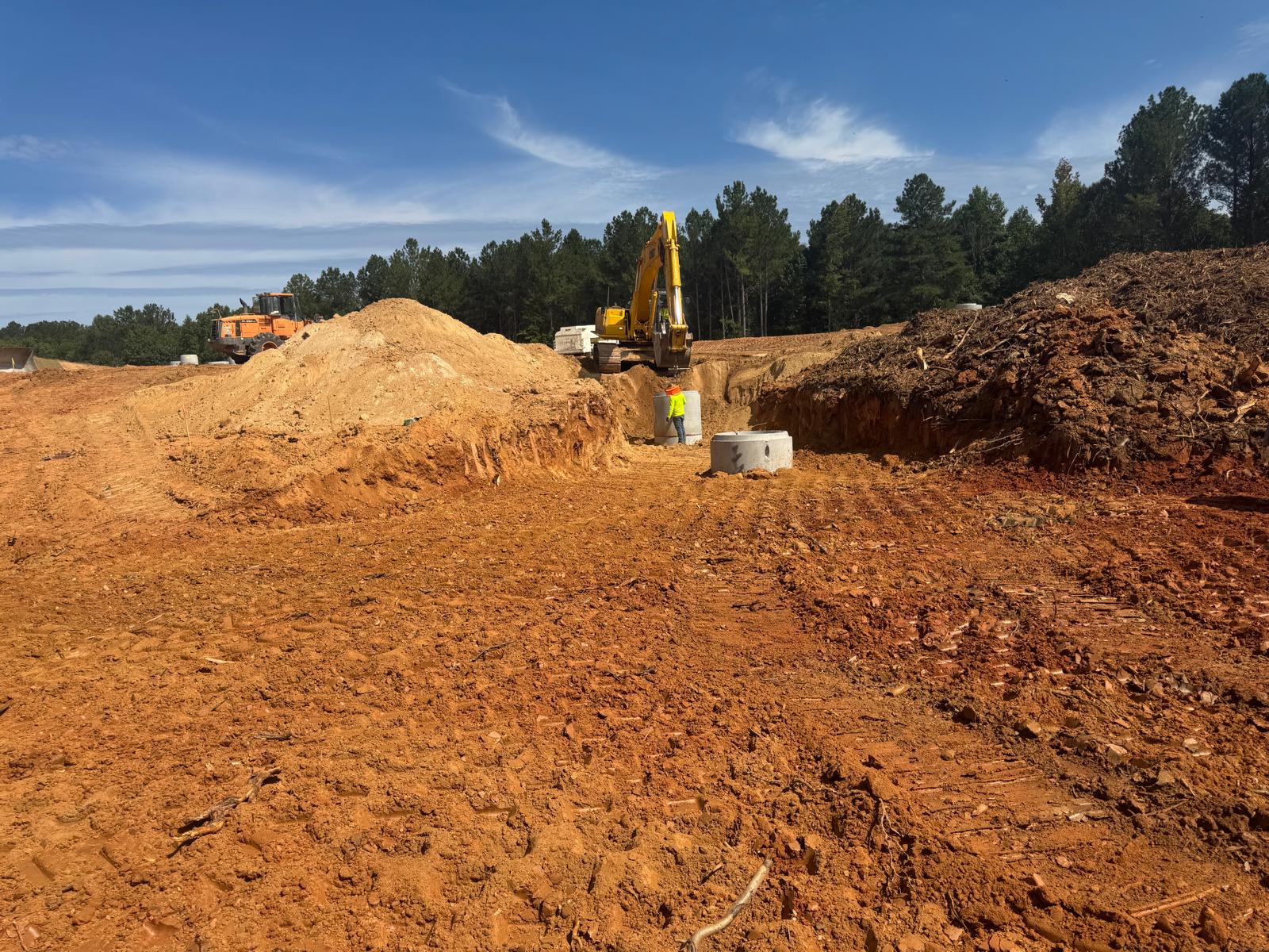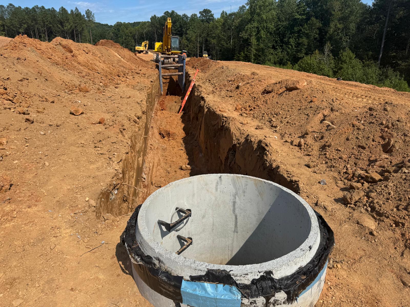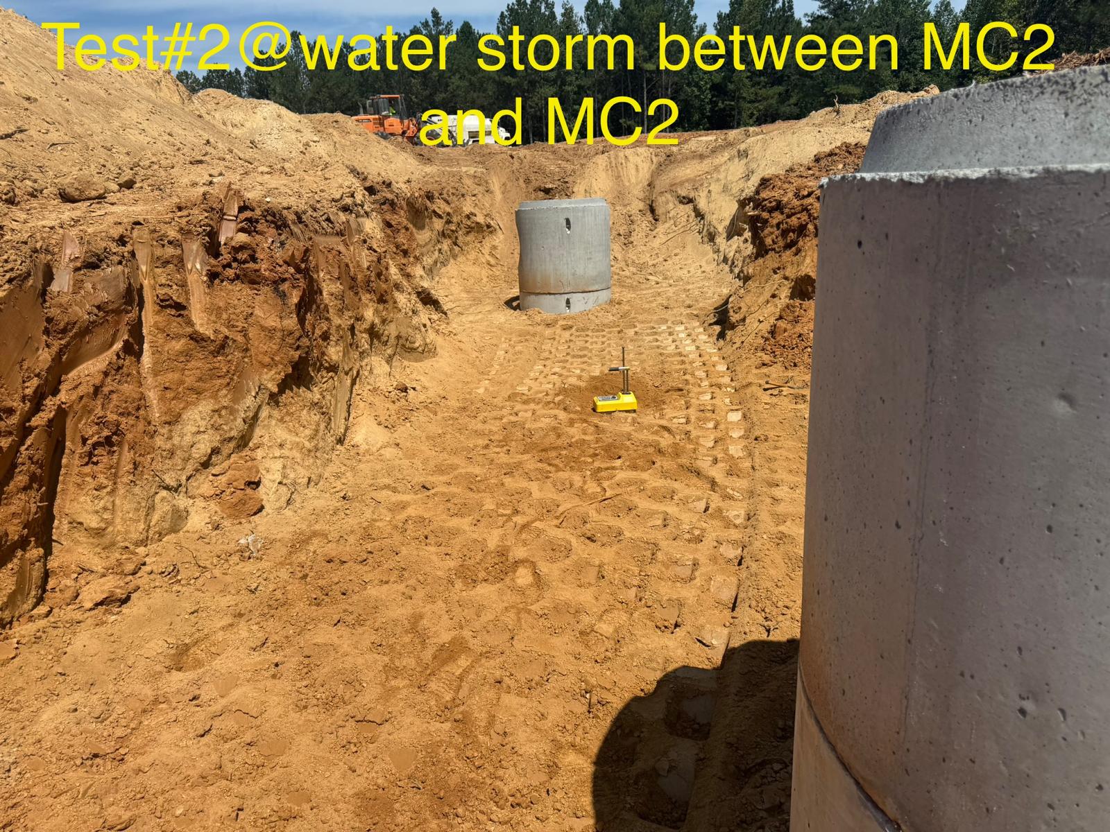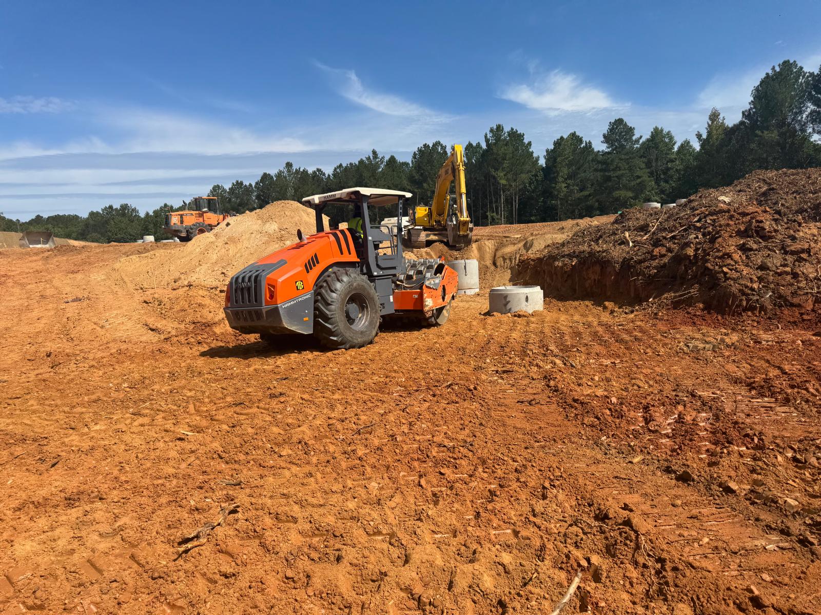 The placement and compaction of fill for the sewer trenches between MH6 and MH6A and Headwall C2 to MHC2 and MHC3 continued on this day. Upon arrival, the ASEC representative observed active work in progress, with fill being placed in 1-foot lifts. Compaction was carried out using a sheeps-foot roller (14-ton) along with a trench compactor for the sewer trench. Compaction testing was performed using a Troxler nuclear density gauge, supplemented by general probing with a 3/8″ diameter probe rod. The density test results indicated that most of the compacted materials met the project requirement of achieving at least 95% of the maximum dry density, in accordance with ASTM D698 (Standard Proctor).