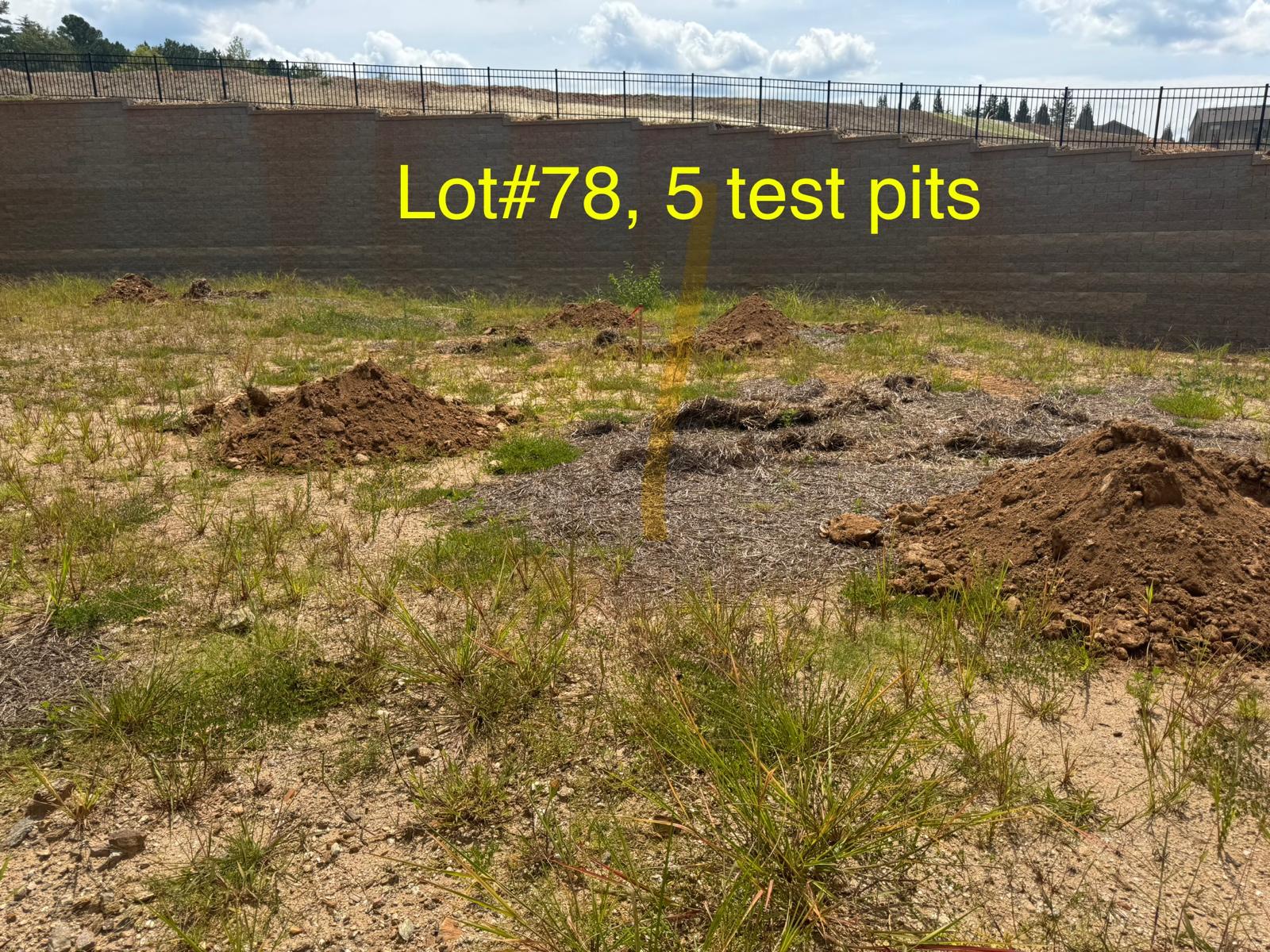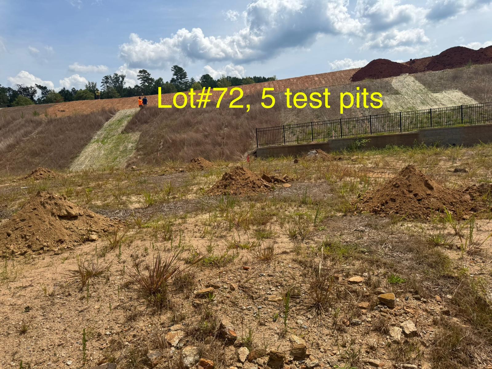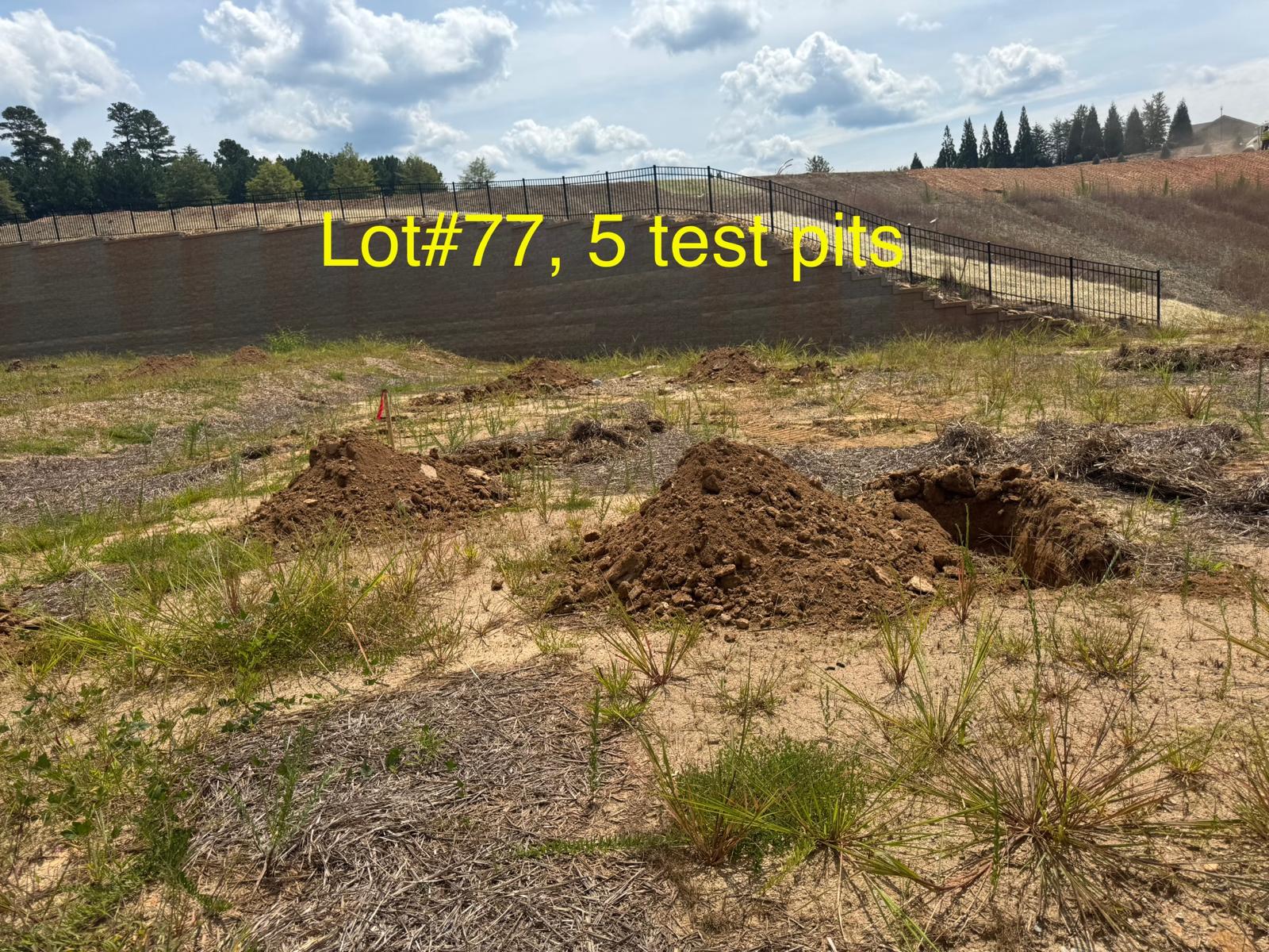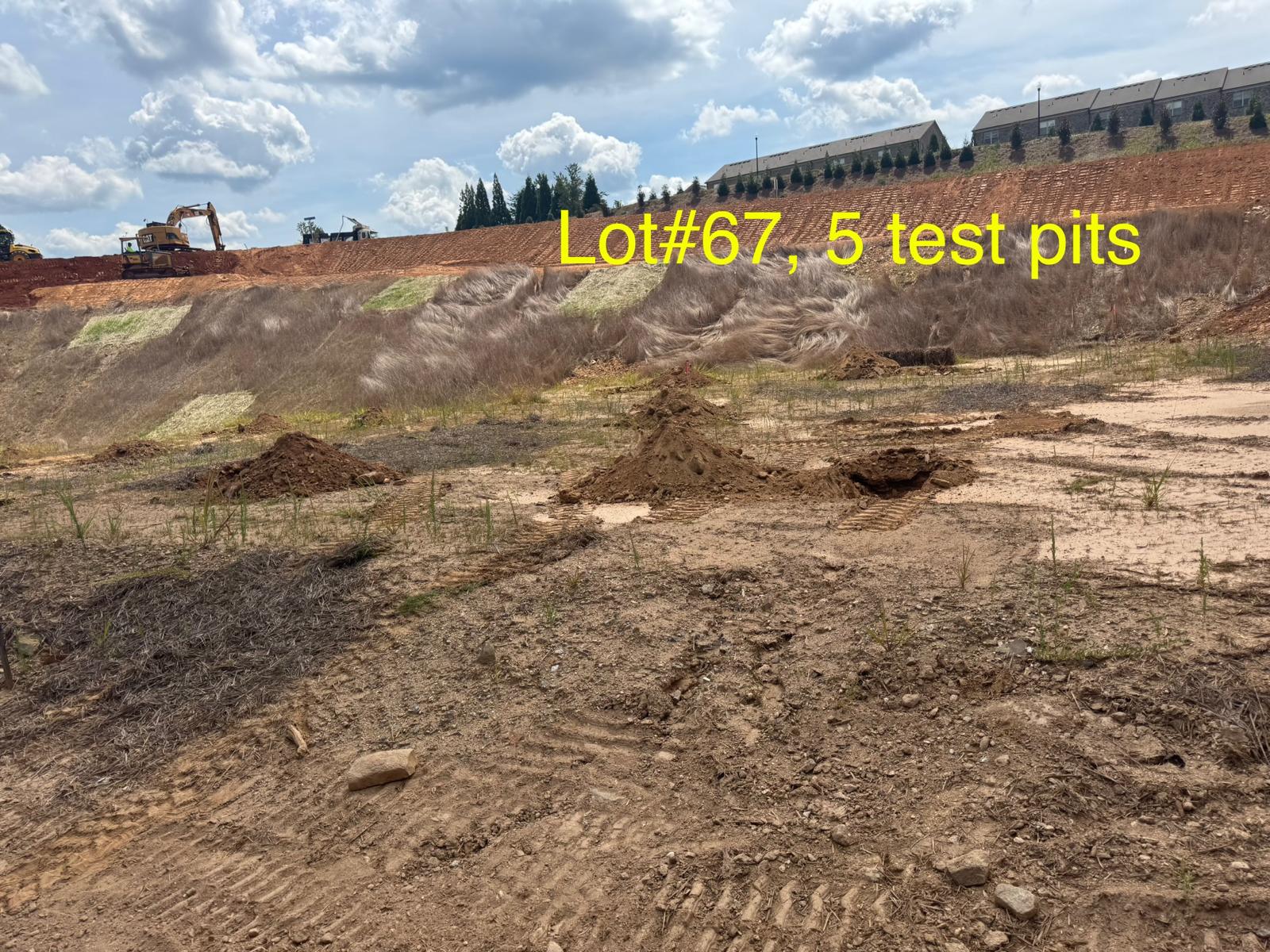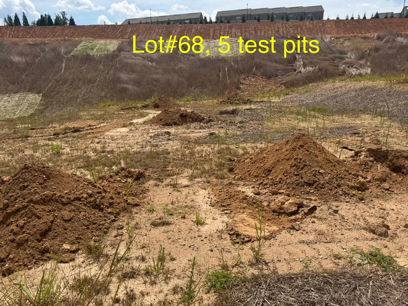 On this day, test pit investigations were conducted by the contractor on Lots #45 through #82. For each lot, a total of five test pits were excavated: one at each of the four corners and one in the center. Each pit was excavated to a depth of approximately 24 inches to assess subsurface conditions for potential rock presence and refusal concerns related to future plumbing and footing installations.