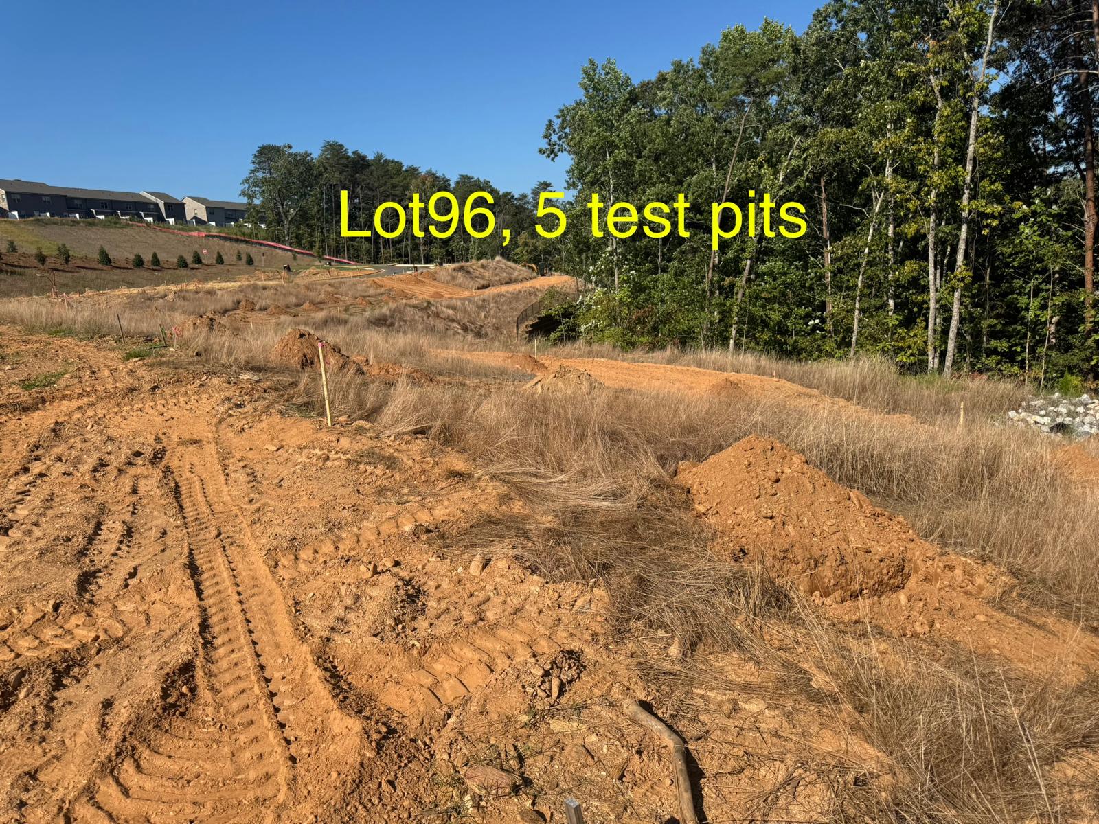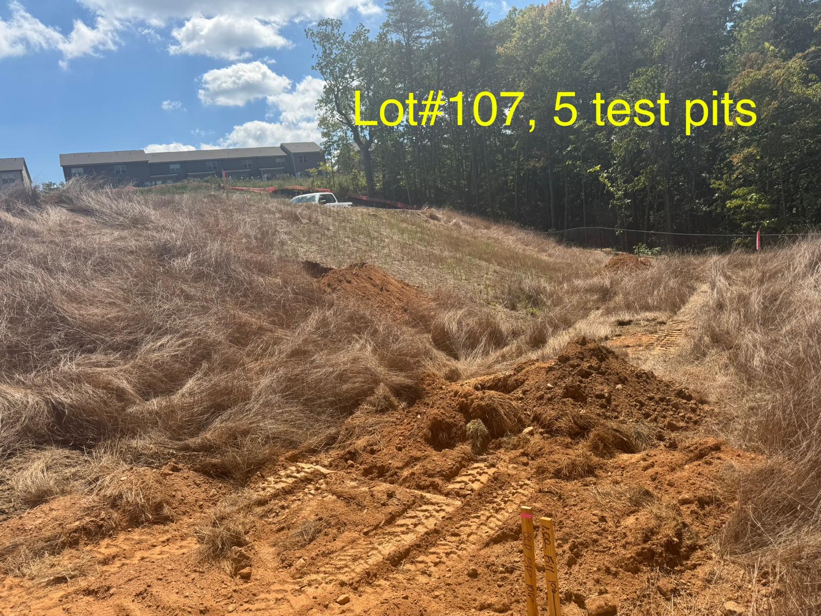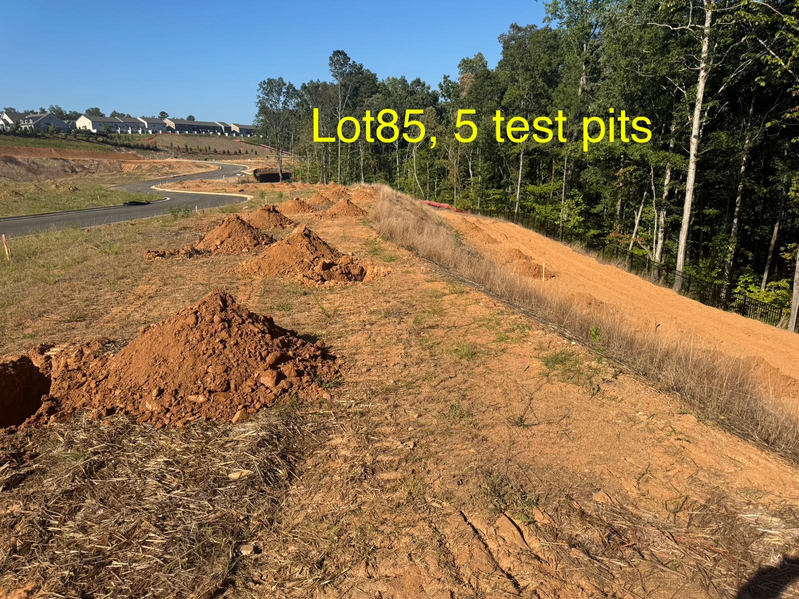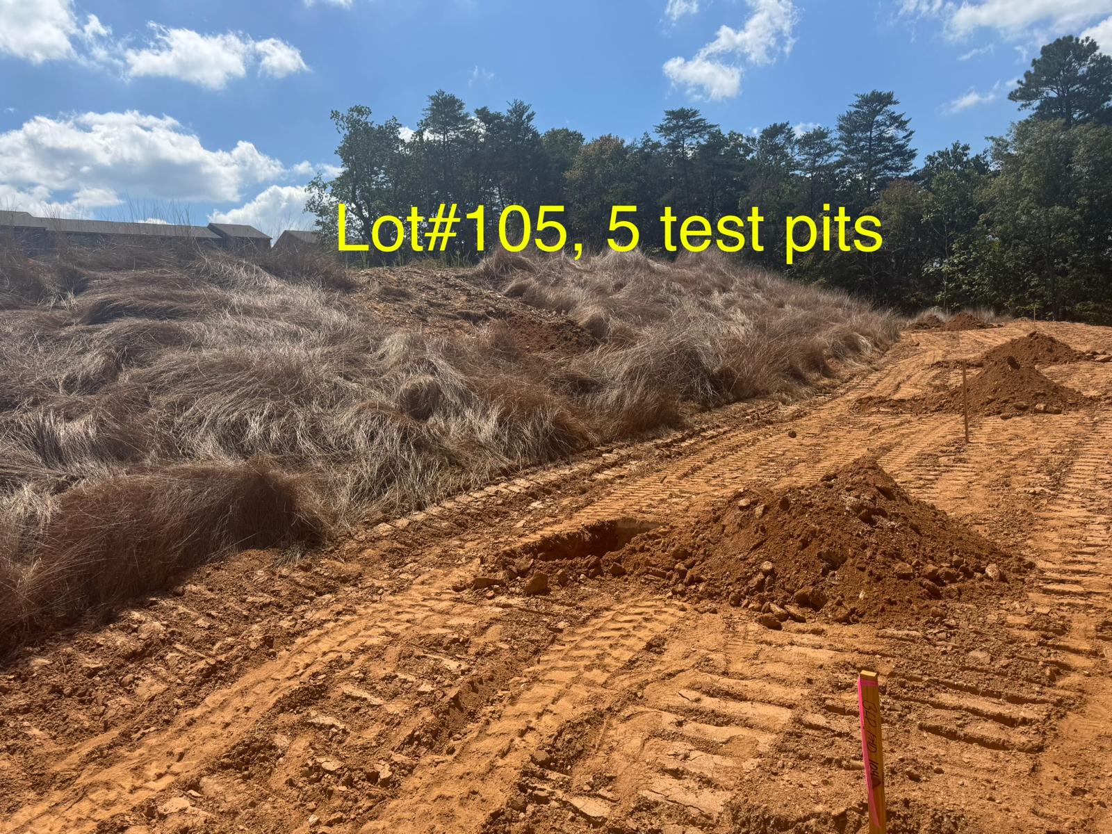 On this day, test pit investigations were conducted by the contractor on Lots #83 through #107. For each lot, a total of five test pits were excavated: one at each of the four corners and one in the center. Each pit was excavated to a depth of approximately 24 inches to assess subsurface conditions for potential rock presence and refusal concerns related to future plumbing and footing installations.