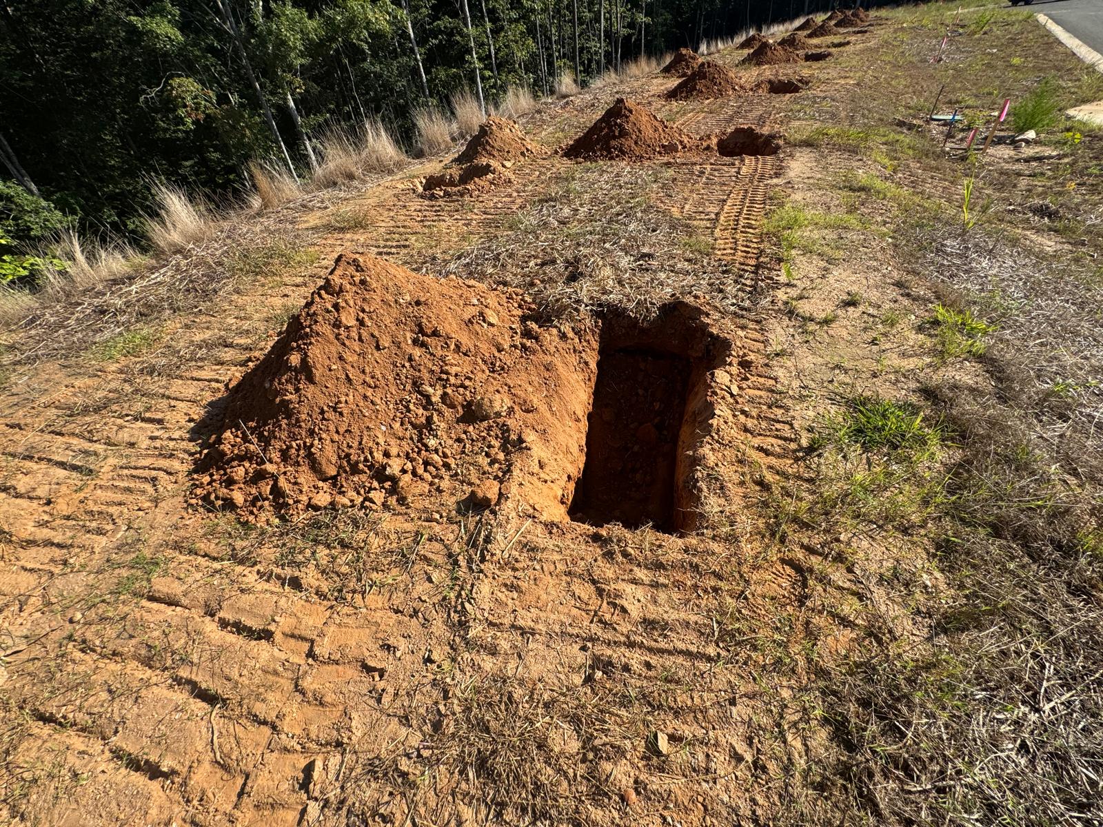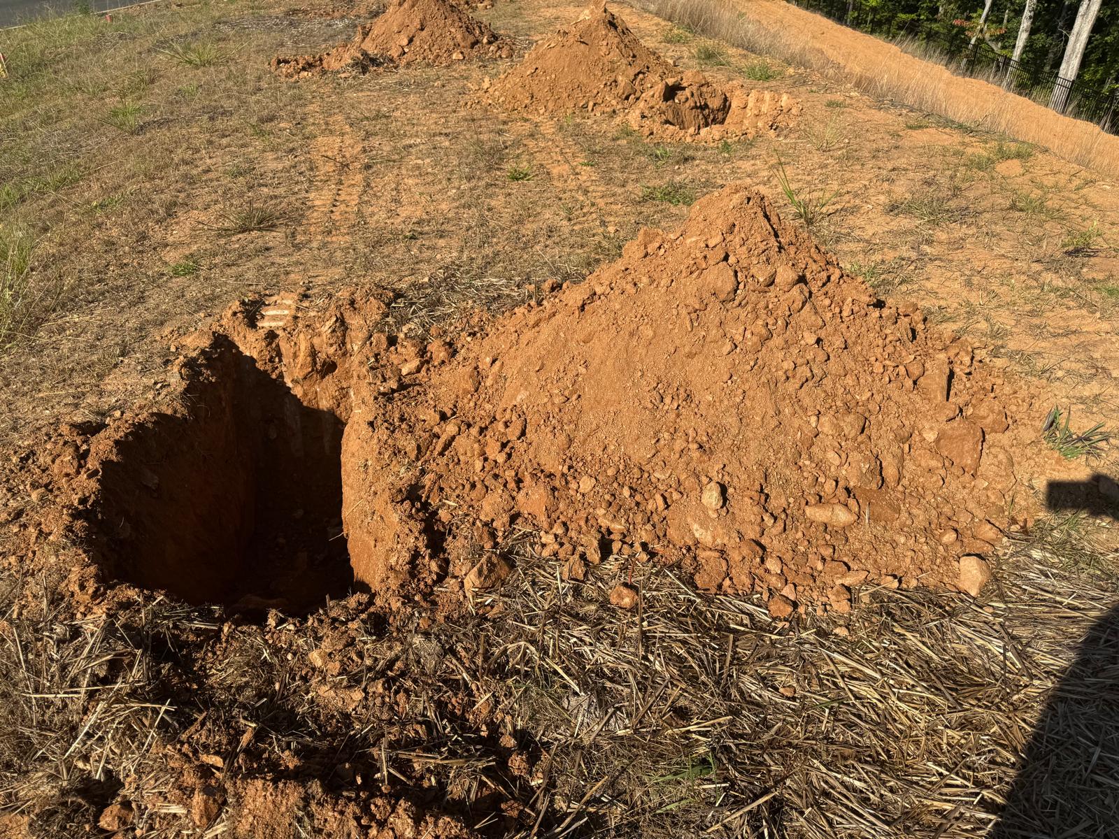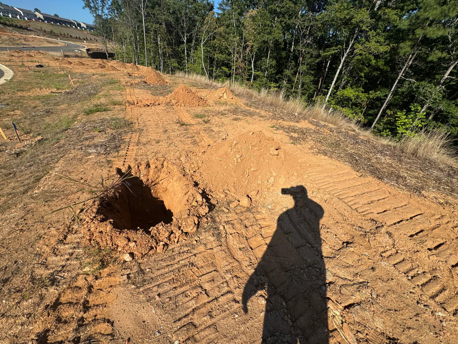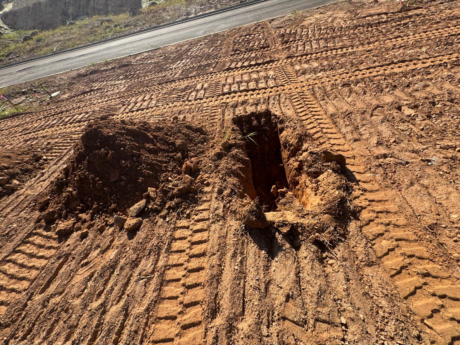 On this day, test pit investigations were conducted by the contractor on Lots #83 through #107. For each lot, a total of five test pits were excavated: one at each of the four corners and one in the center. Each pit was excavated to a depth of approximately 24 inches to assess subsurface conditions for potential rock presence and refusal concerns related to future plumbing and footing installations.