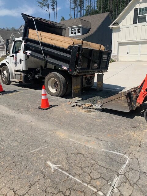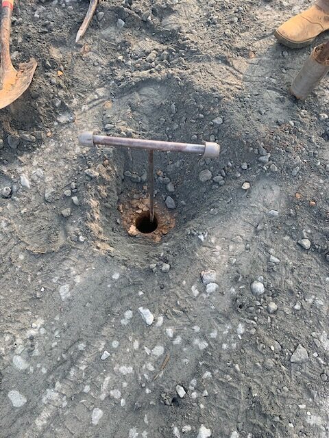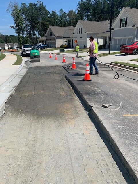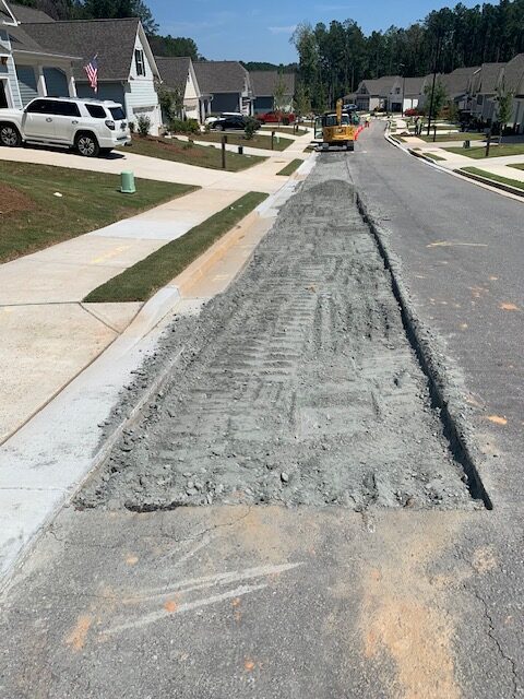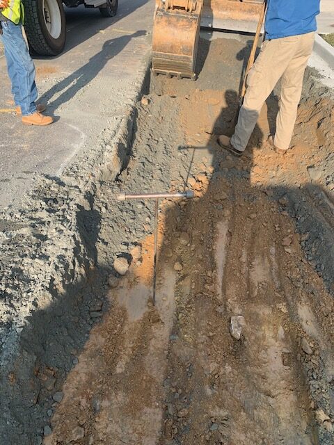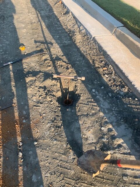 On the above date our representative was on site and observed the contractor continue subgrade repairs after removing an area that had failed asphalt at Azalea Crossing. The first repair area #1 was observed by removing in place base GAB averaging 4.5″and 5.0″at observed areas performing hand auger borings to depths of minus three feet. The in-place subgrade soils were probed using a rounded end steel rod indicating slightly above optimum moisture soils in place. It was recommended to clip these in-place subgrade soils -6″ and replace with additional GAB stone to increase base stone thicknesses to 10″ to 12″. The area observed was approximately 9’x 175′ between house addresses 295 and 331.The writer observed GAB stone replacement, but compaction efforts weren’t completed and will be re-observed on 9/10/25.  See attached photos below.
