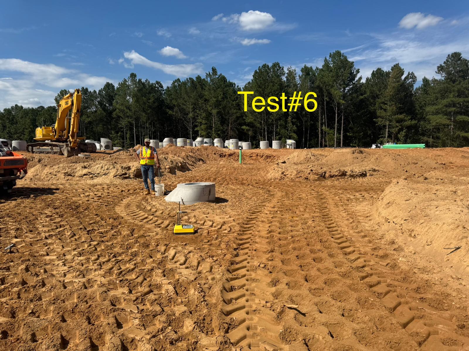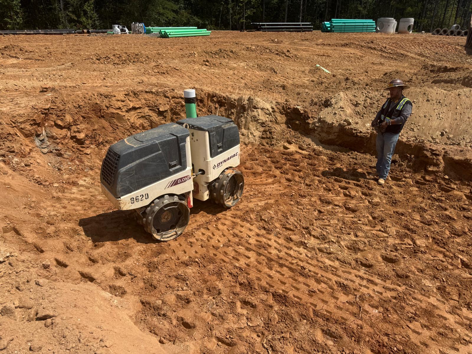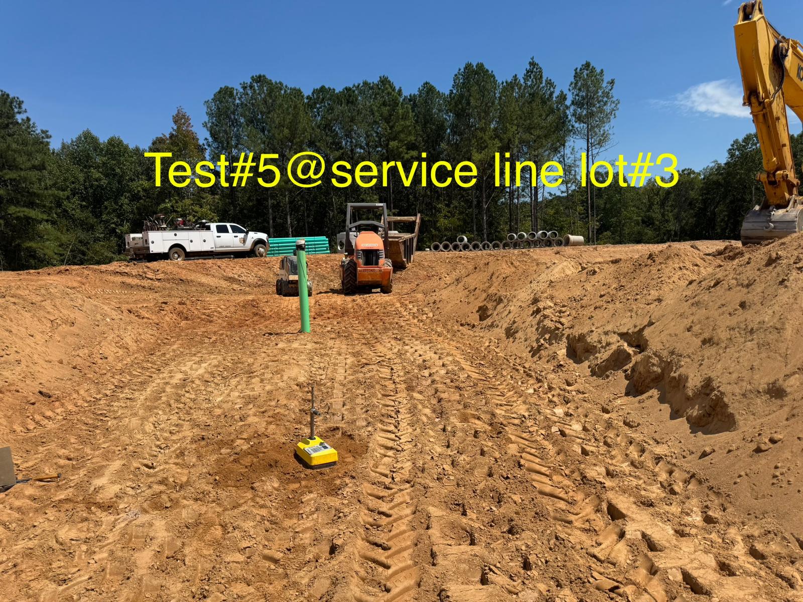 The placement and compaction of backfill for the sewer trenches between MH5 and MH5A and service lines for Lots #1,2,3,4, and 5 continued on this day. Upon arrival, the ASEC representative observed active work in progress, with fill being placed in 1-foot lifts. Compaction was carried out using a sheep-foot roller (14-ton) along with a trench compactor for the sewer trench. Compaction testing was performed using a Troxler nuclear density gauge, supplemented by general probing with a 3/8″ diameter probe rod. The density test results indicated that most of the compacted materials met the project requirement of achieving at least 95% of the maximum dry density, in accordance with ASTM D698 (Standard Proctor).