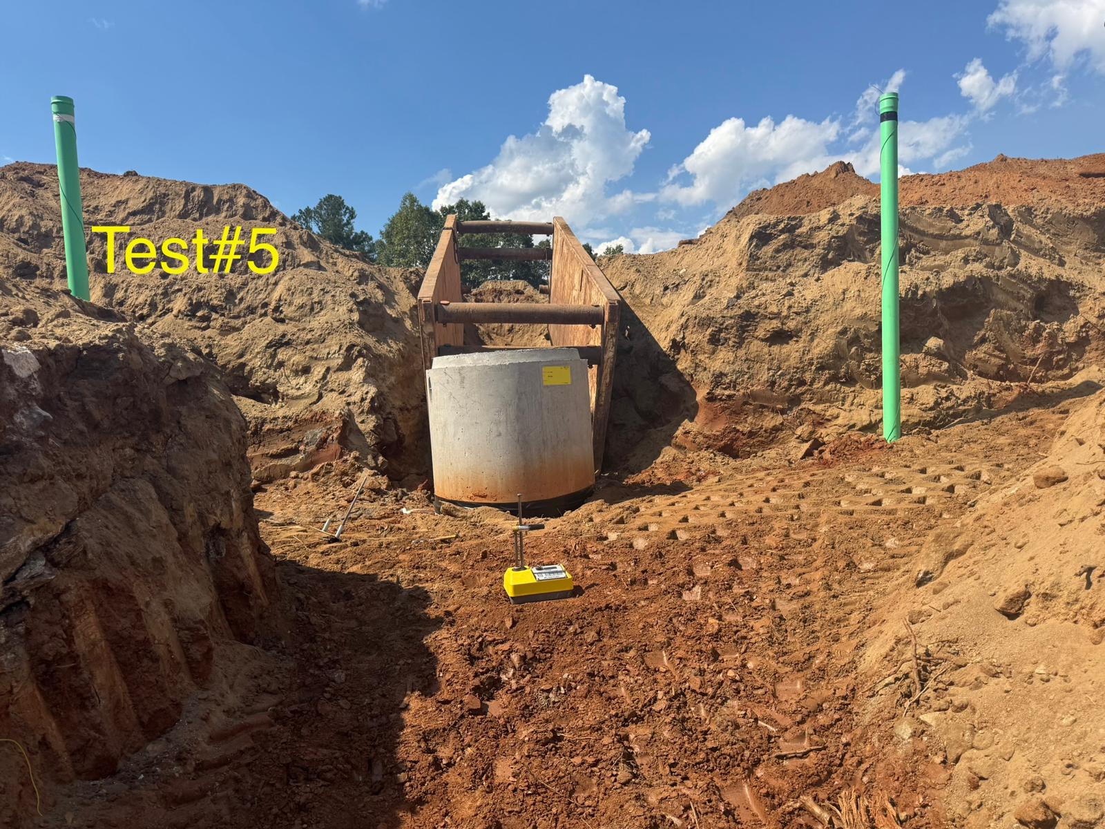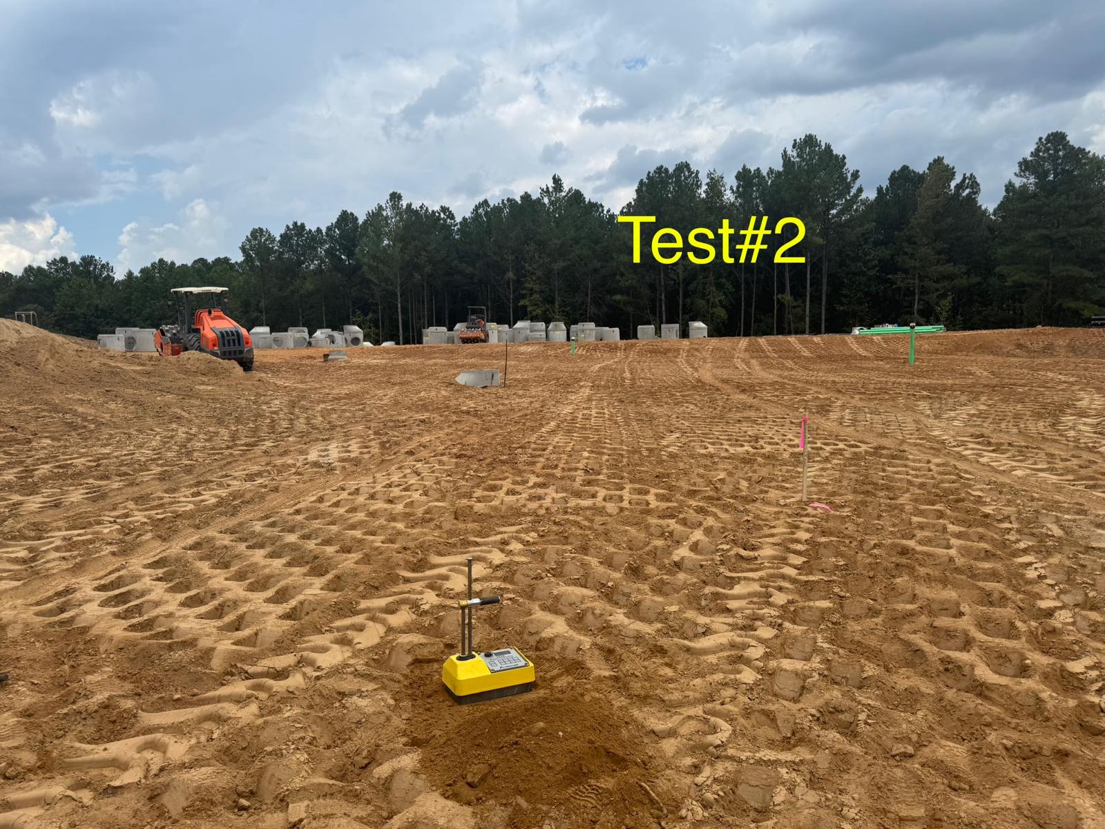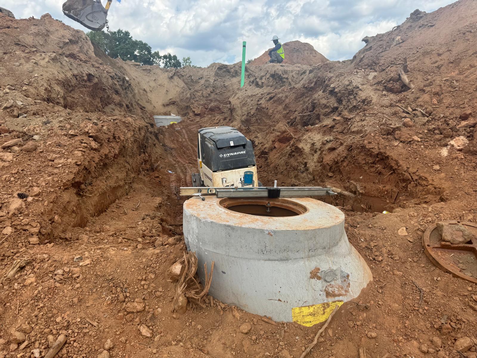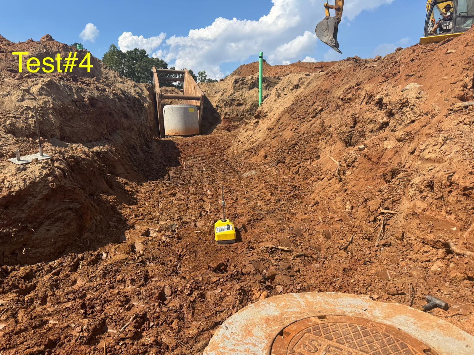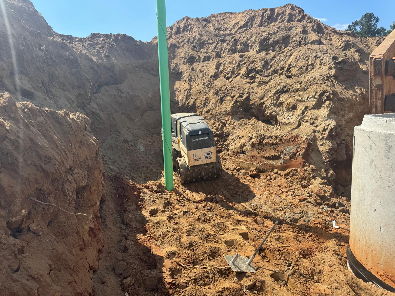 The placement and compaction of backfill for the sewer trenches between MH6A to MHA3 and MHA4 continued on this day. Upon arrival, the ASEC representative observed active work in progress, with fill being placed in 1-foot lifts. Compaction was carried out using a sheep-foot roller (14-ton) along with a trench compactor for the sewer trench. Compaction testing was performed using a Troxler nuclear density gauge, supplemented by general probing with a 3/8″ diameter probe rod. The density test results indicated that most of the compacted materials met the project requirement of achieving at least 95% of the maximum dry density, in accordance with ASTM D698 (Standard Proctor).
