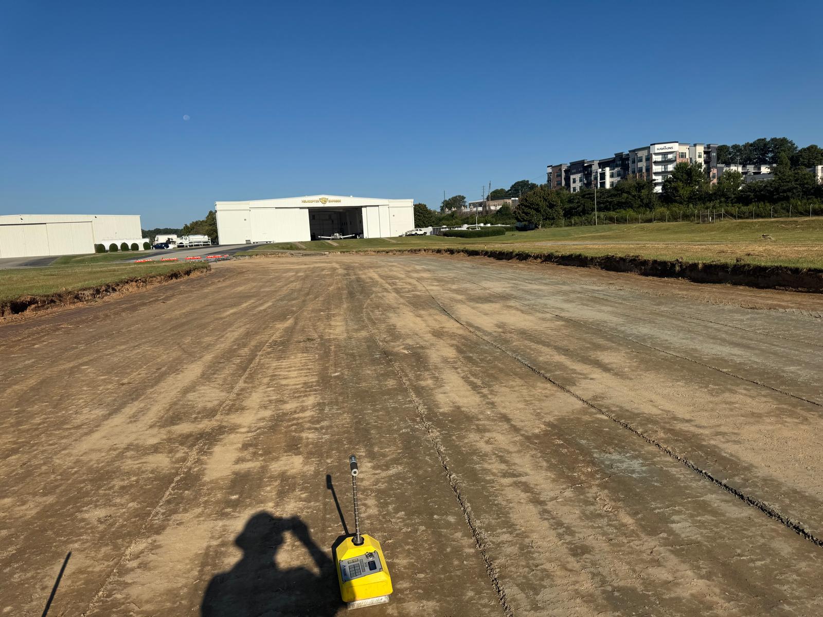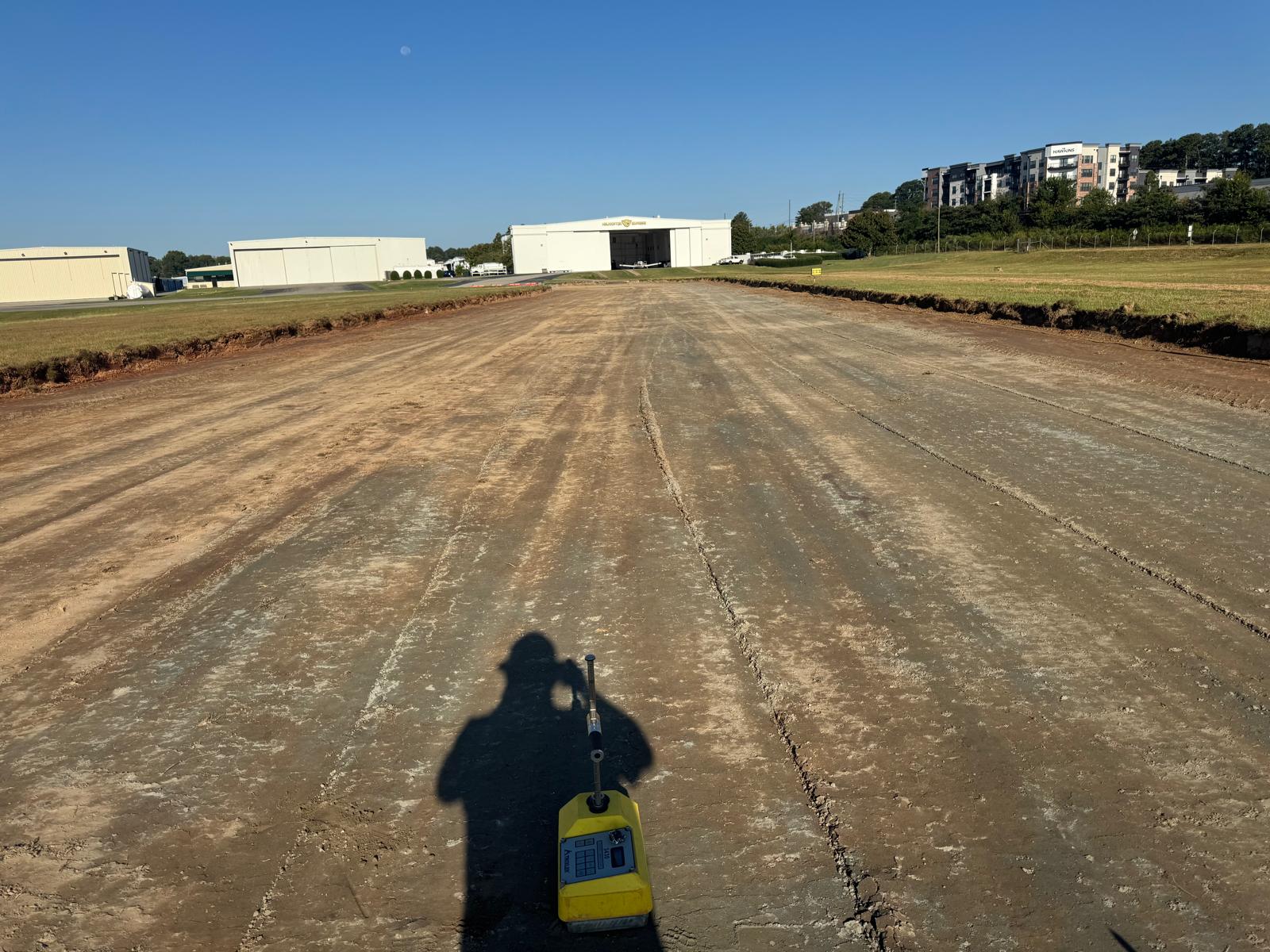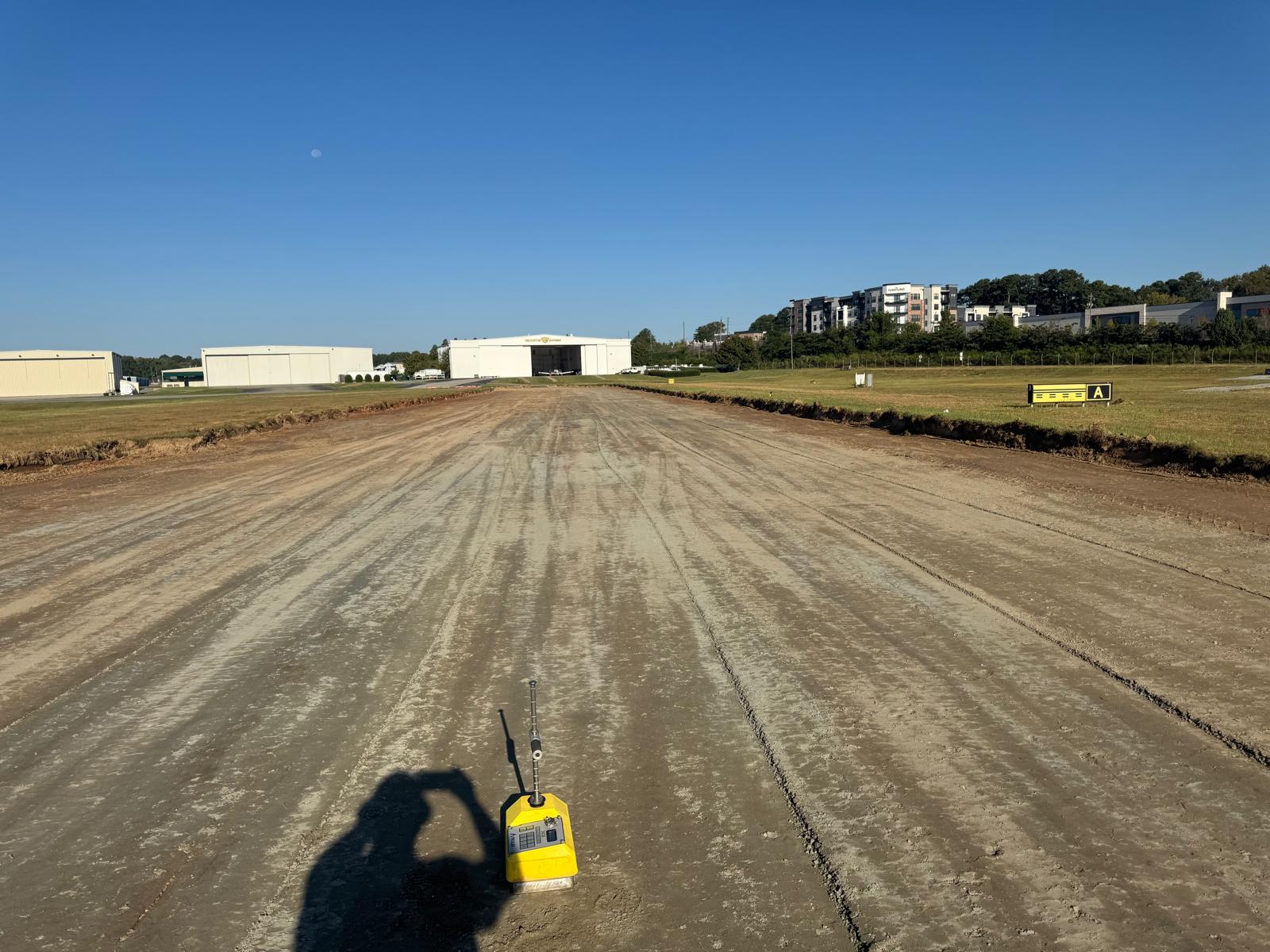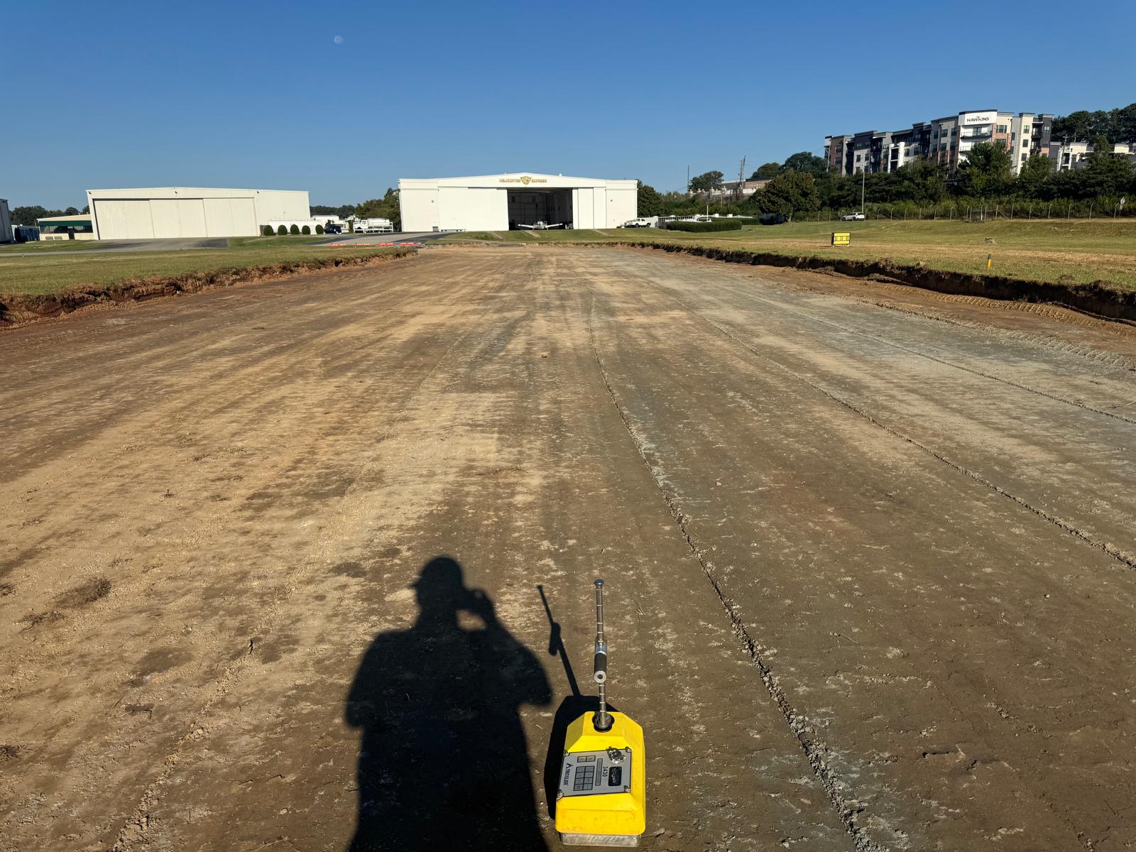 Compaction Testing: Compaction testing was performed on the Taxiway between STA 79+00 to 86+00 using a Troxler nuclear density gauge, supplemented by general probing with a 3/8″ diameter probe rod. The density test results indicated that most of the compacted materials did not meet the project requirement of achieving a minimum of 100% of the maximum dry density, in accordance with ASTM D1557 (Modified Proctor).
