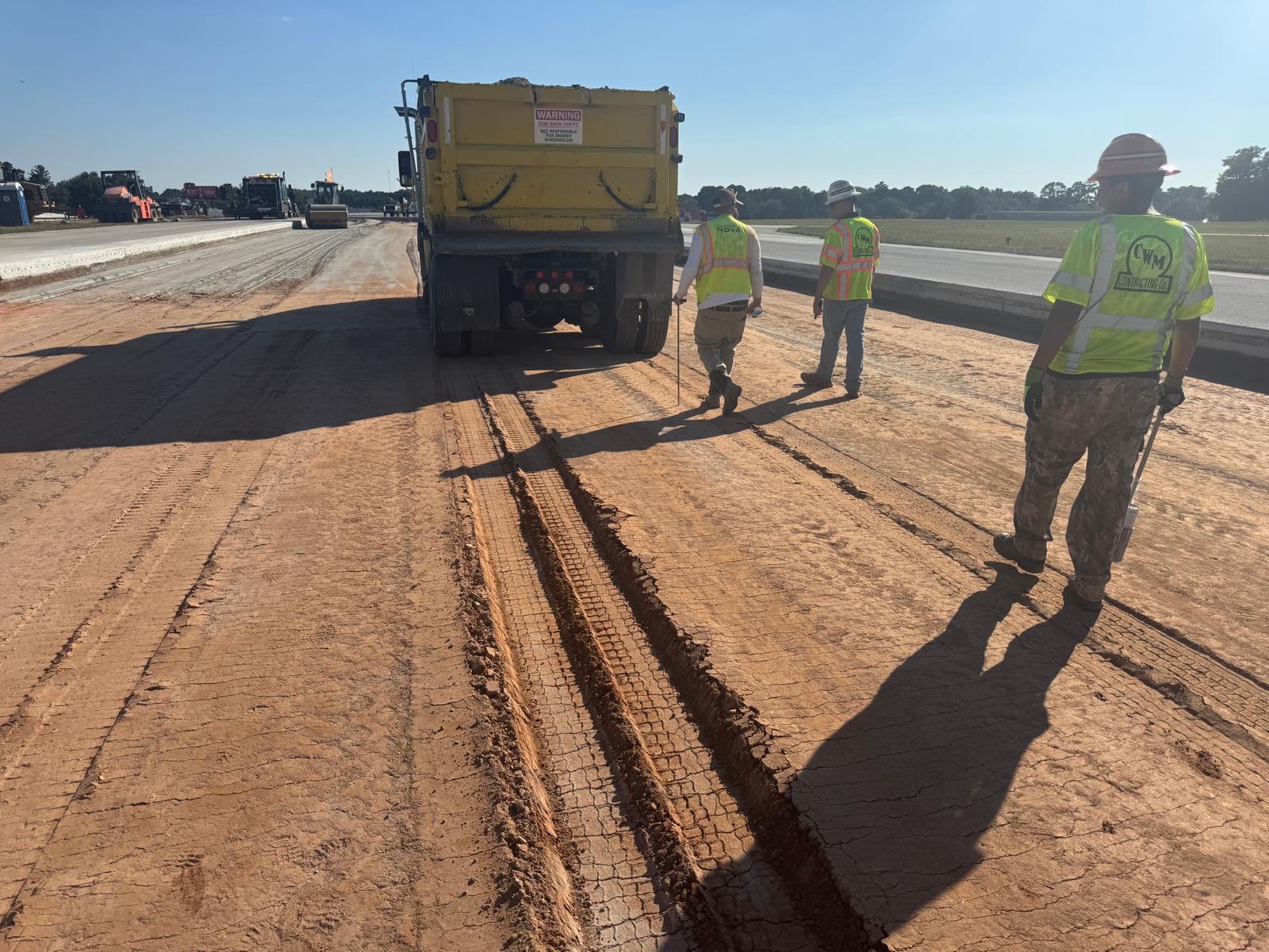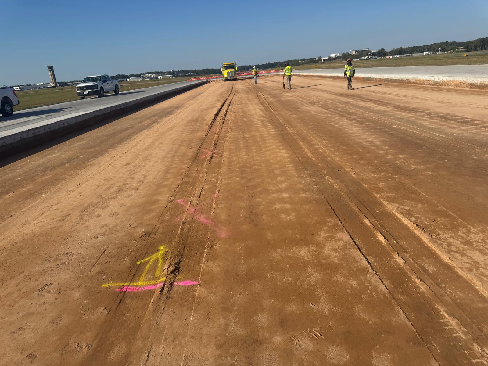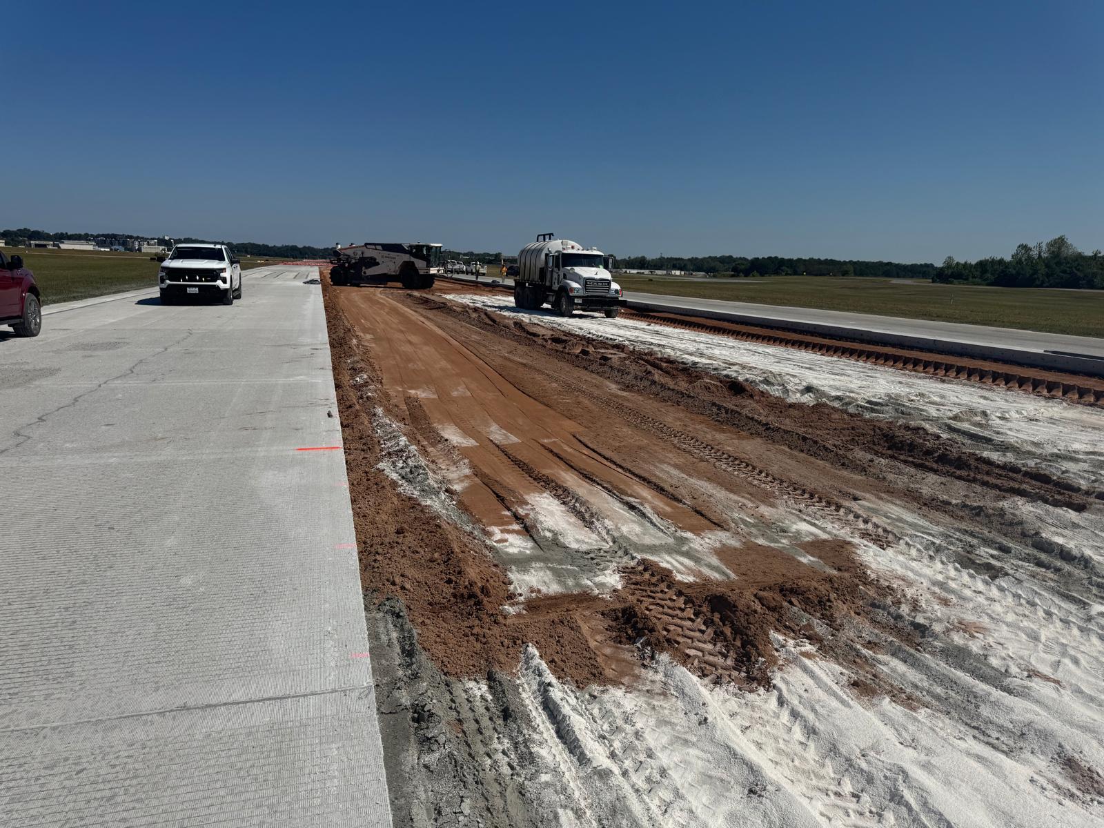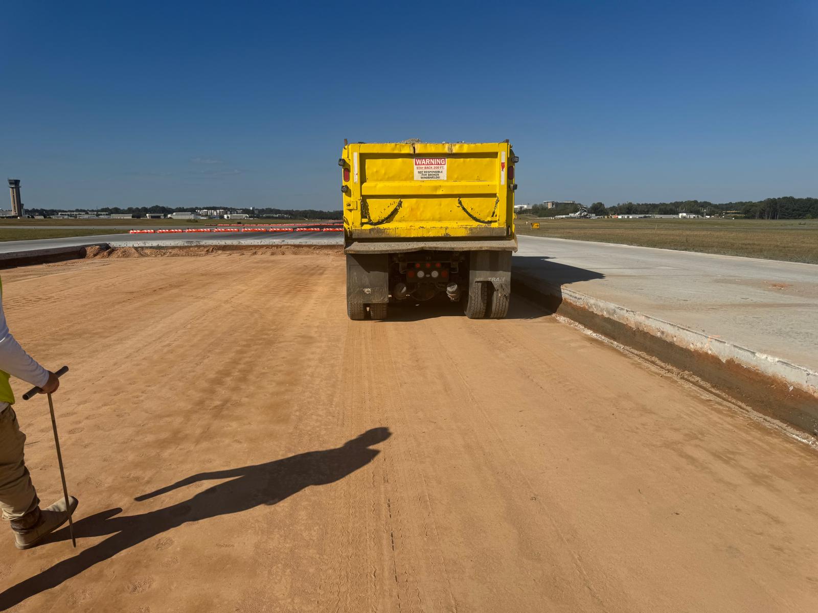 Proof Rolling Observation and Performance: A second proof-roll was performed on Section 1A between STA 1020+00 to 1028+00 on Runway 3R-21L using a fully loaded tandem axle truck. This section had previously been treated with lime, mixed into the soil to a depth of approximately 10 inches. Multiple passes were made across the subgrade. During the proof roll, some yielding and deflection were observed in approximately 18 feet of the center portion of Section 1A, where movement was noted, indicating that the subgrade soils in this area still showed poor stability.