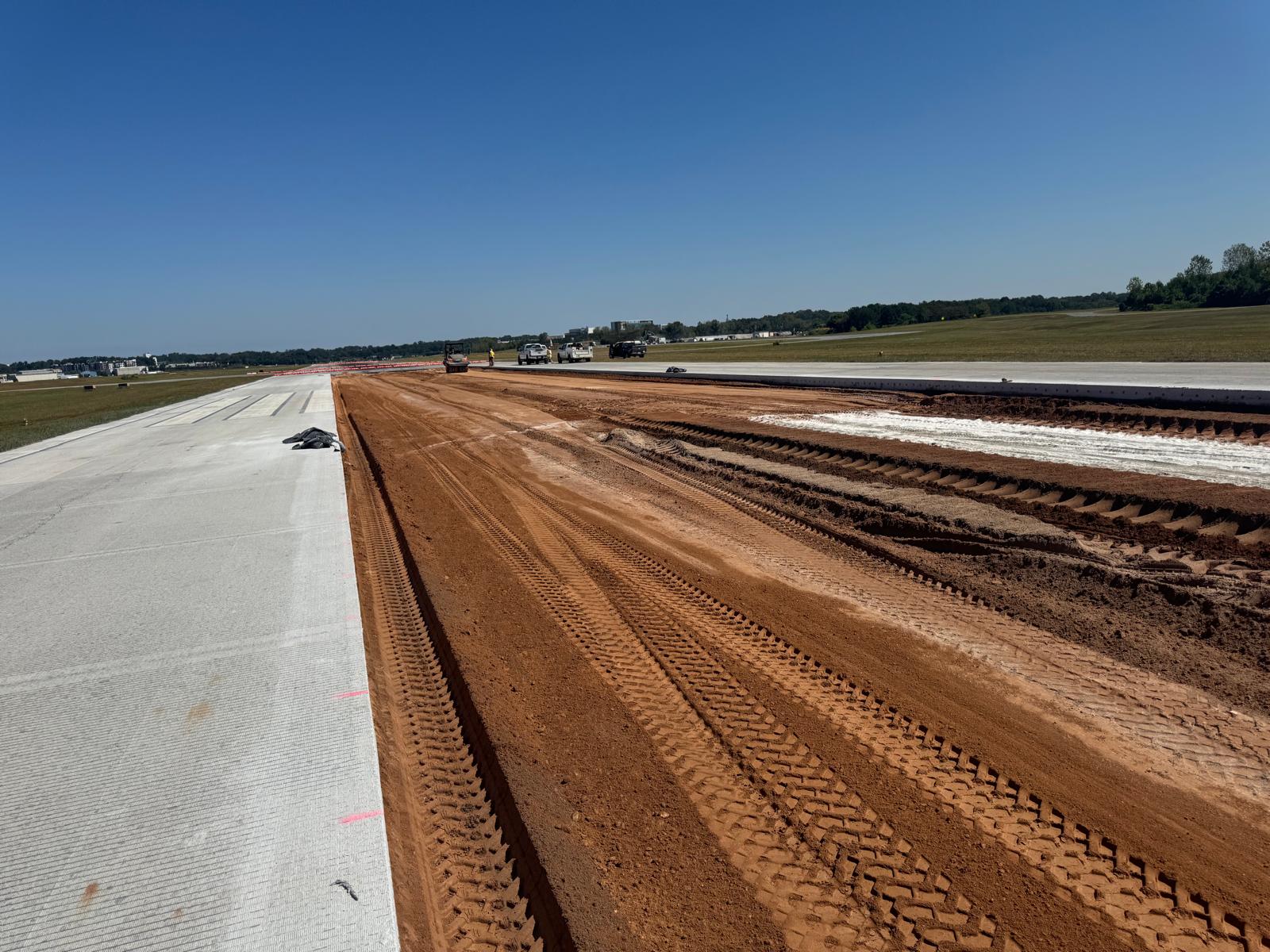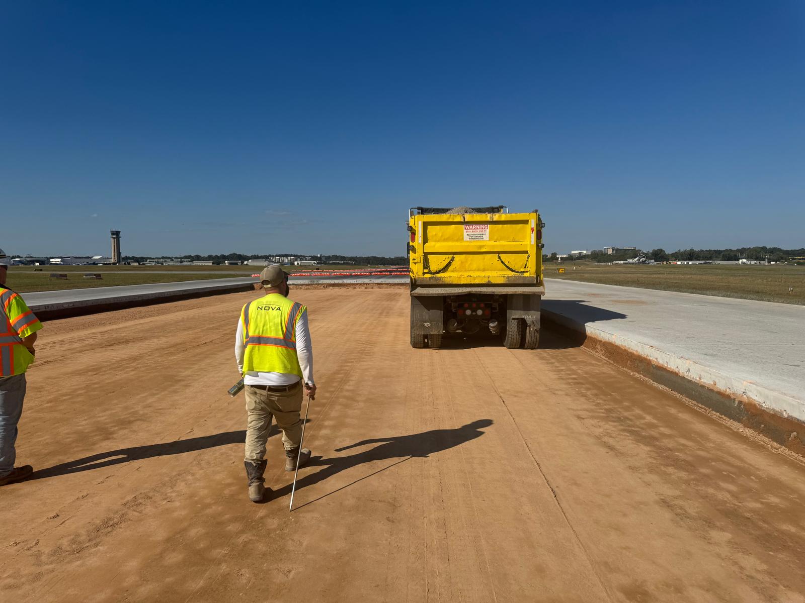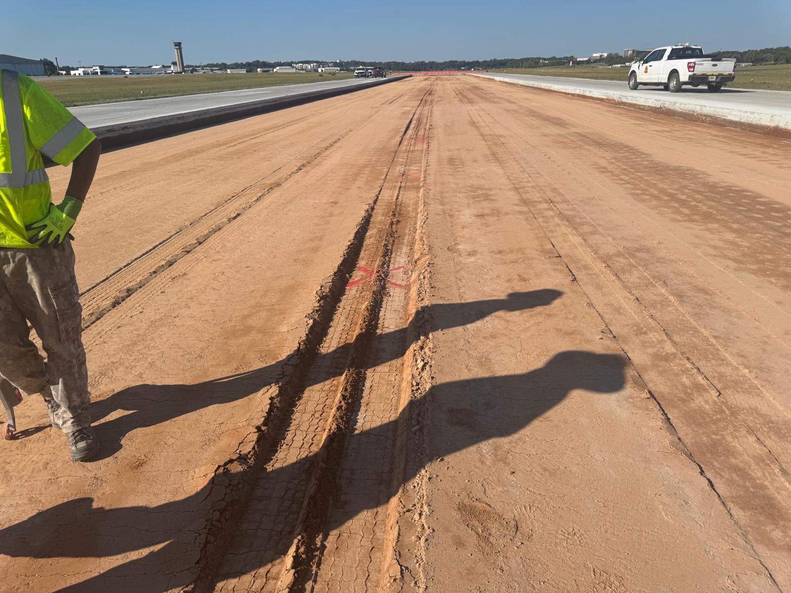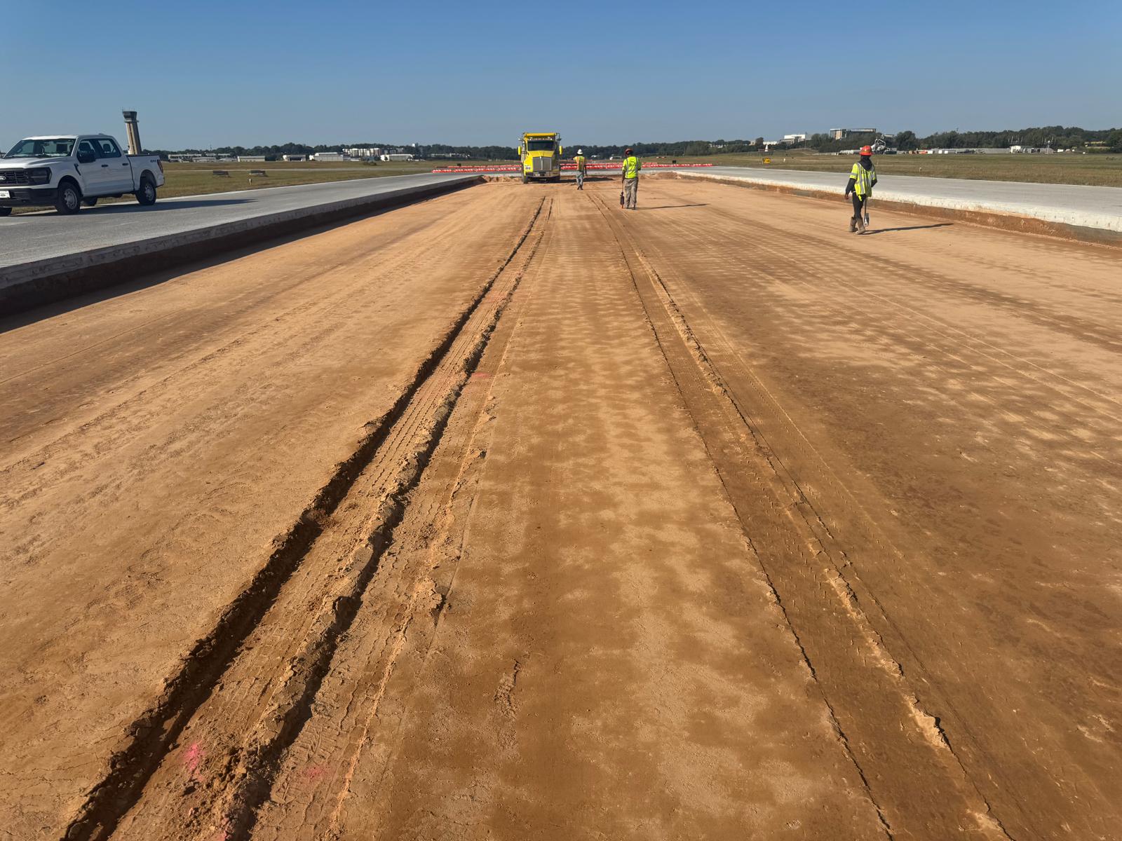 Proof Rolling Observation and Performance: A second proof-roll was performed on Section 1A between STA 1020+00 to 1028+00 on Runway 3R-21L using a fully loaded tandem axle truck. This section had previously been treated with lime, mixed into the soil to a depth of approximately 10 inches. Multiple passes were made across the subgrade. During the proof roll, some yielding and deflection were observed in approximately 18 feet of the center portion of Section 1A, where movement was noted, indicating that the subgrade soils in this area still showed poor stability.
