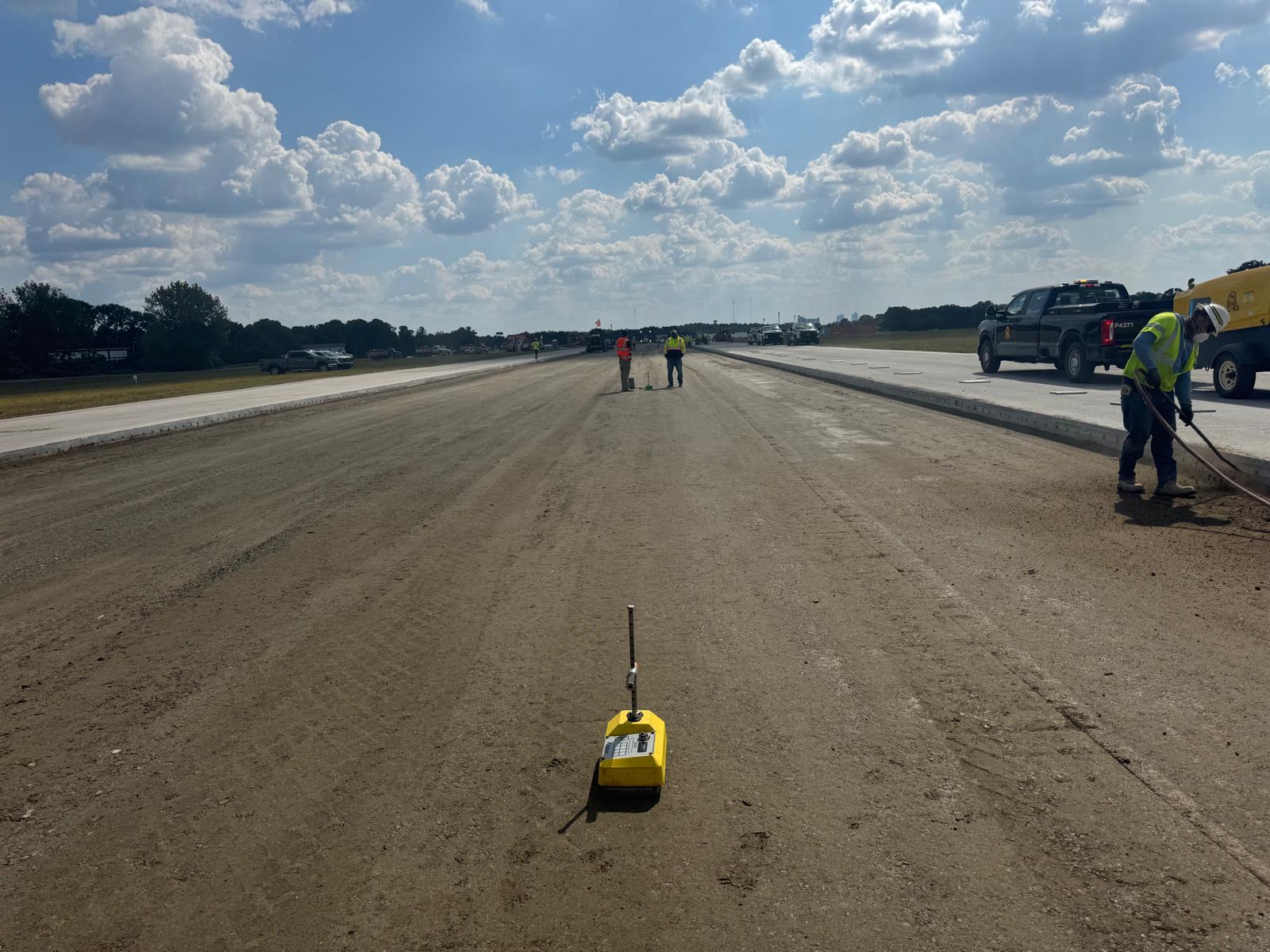 Proof-rolling was also performed on Section 1B between STA 1057+75 and 1059+50. During the initial passes, some yielding and deflection were observed in some locations. It was recommended that the affected areas be reprocessed with the addition of soil cement. After remixing and recompaction, a second round of proof-rolling was performed, and the area found stable.