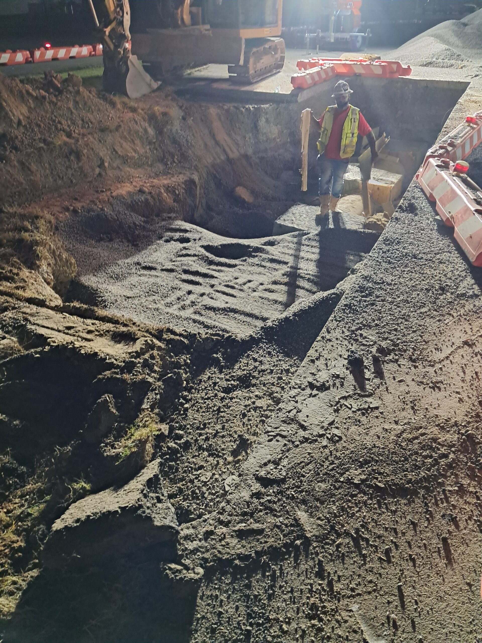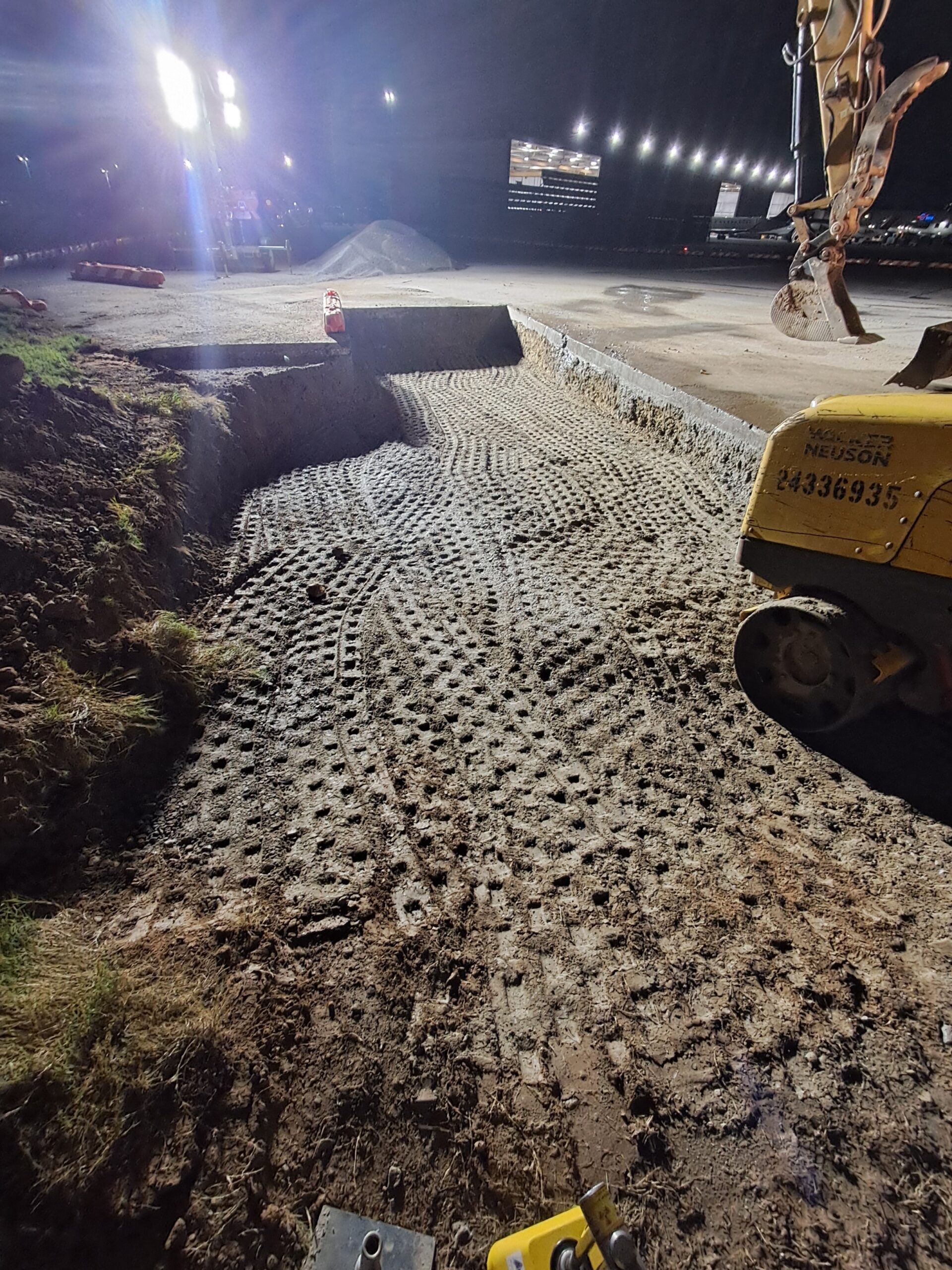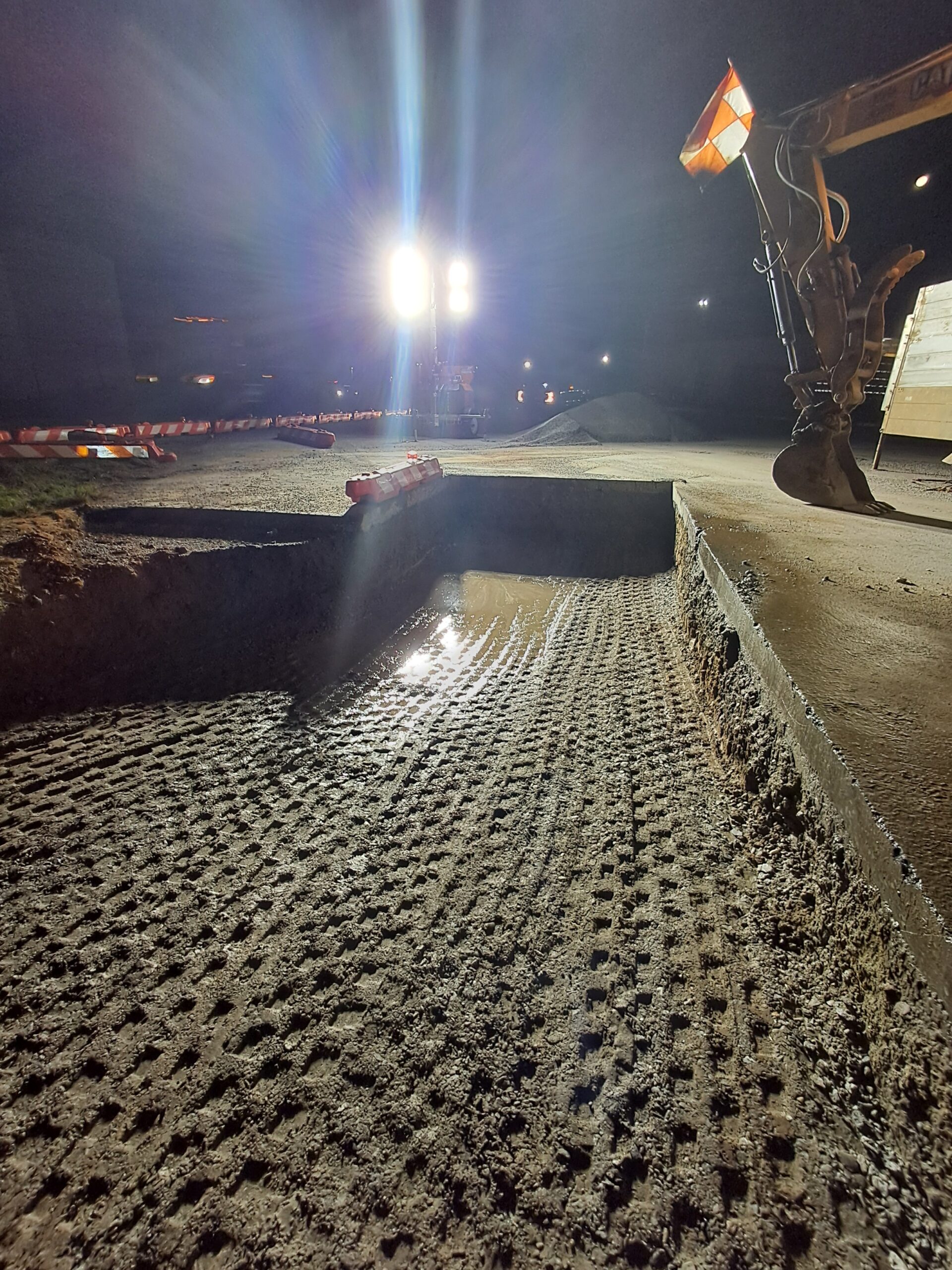 Our ASEC representative arrived on site and found that the placement of Graded-Aggregate-Base (GAB) was underway. The third layer placed was compaction tested using a nuclear density gauge with the QA technician present. Test results met job specifications for compaction.