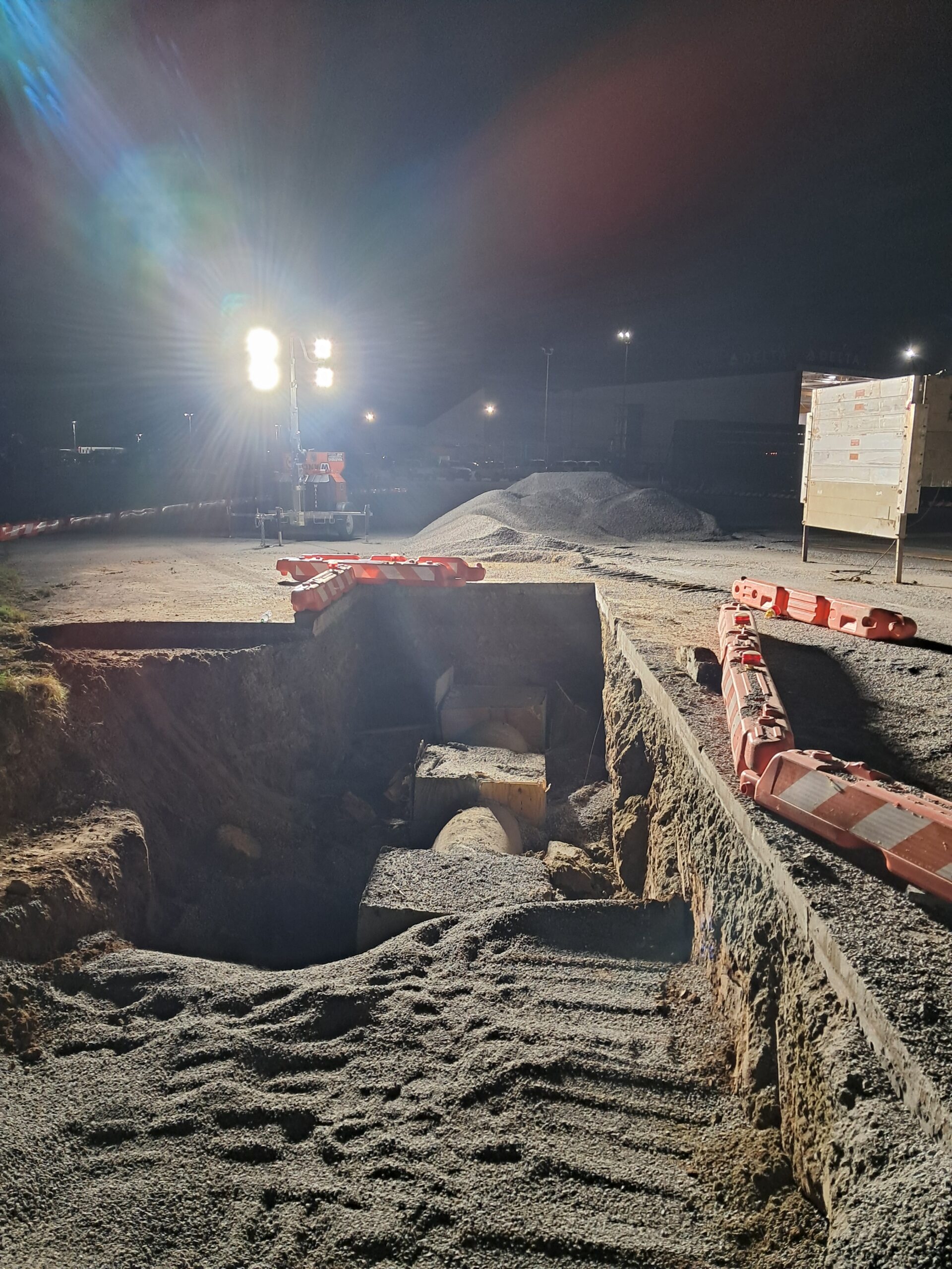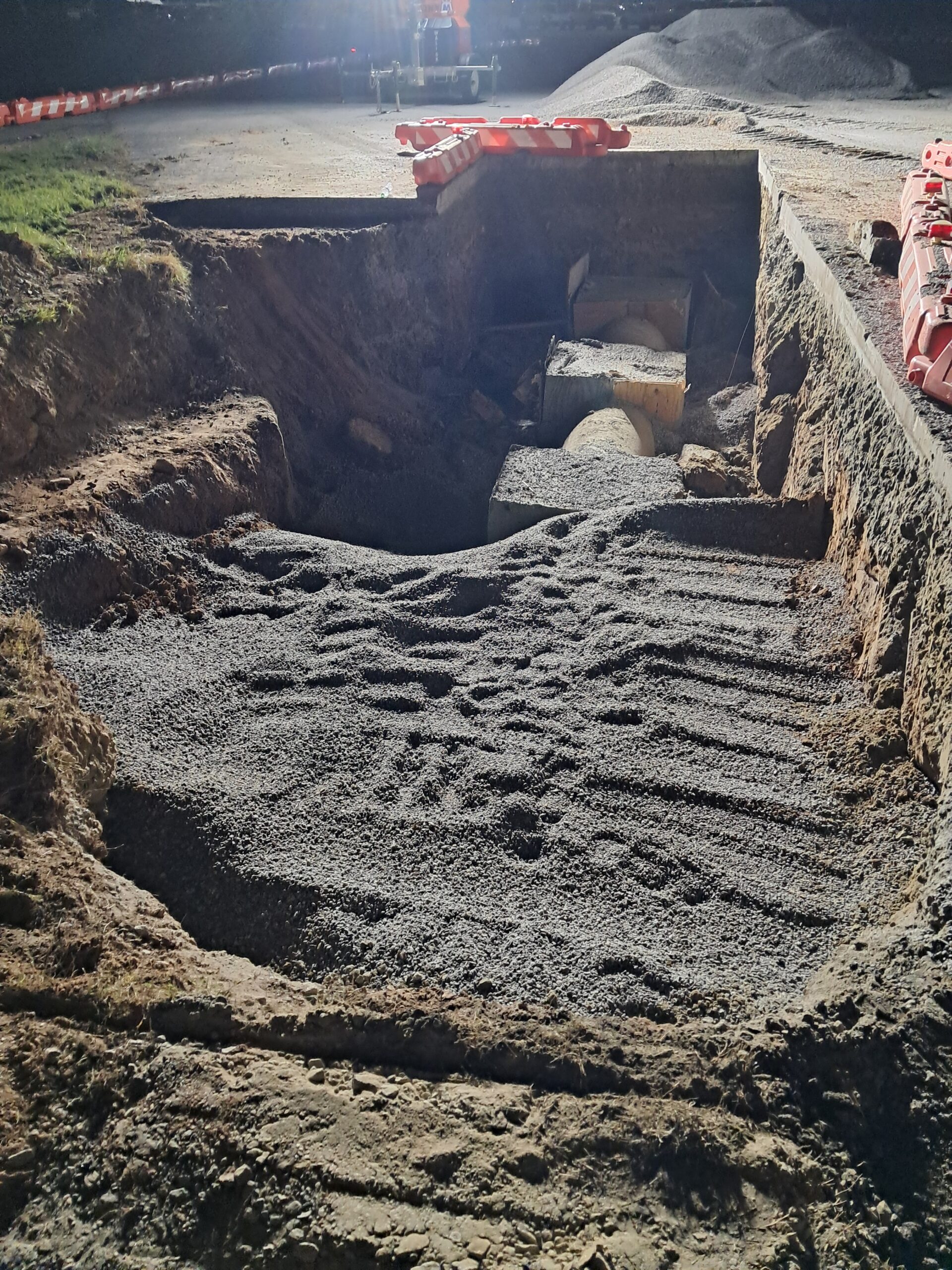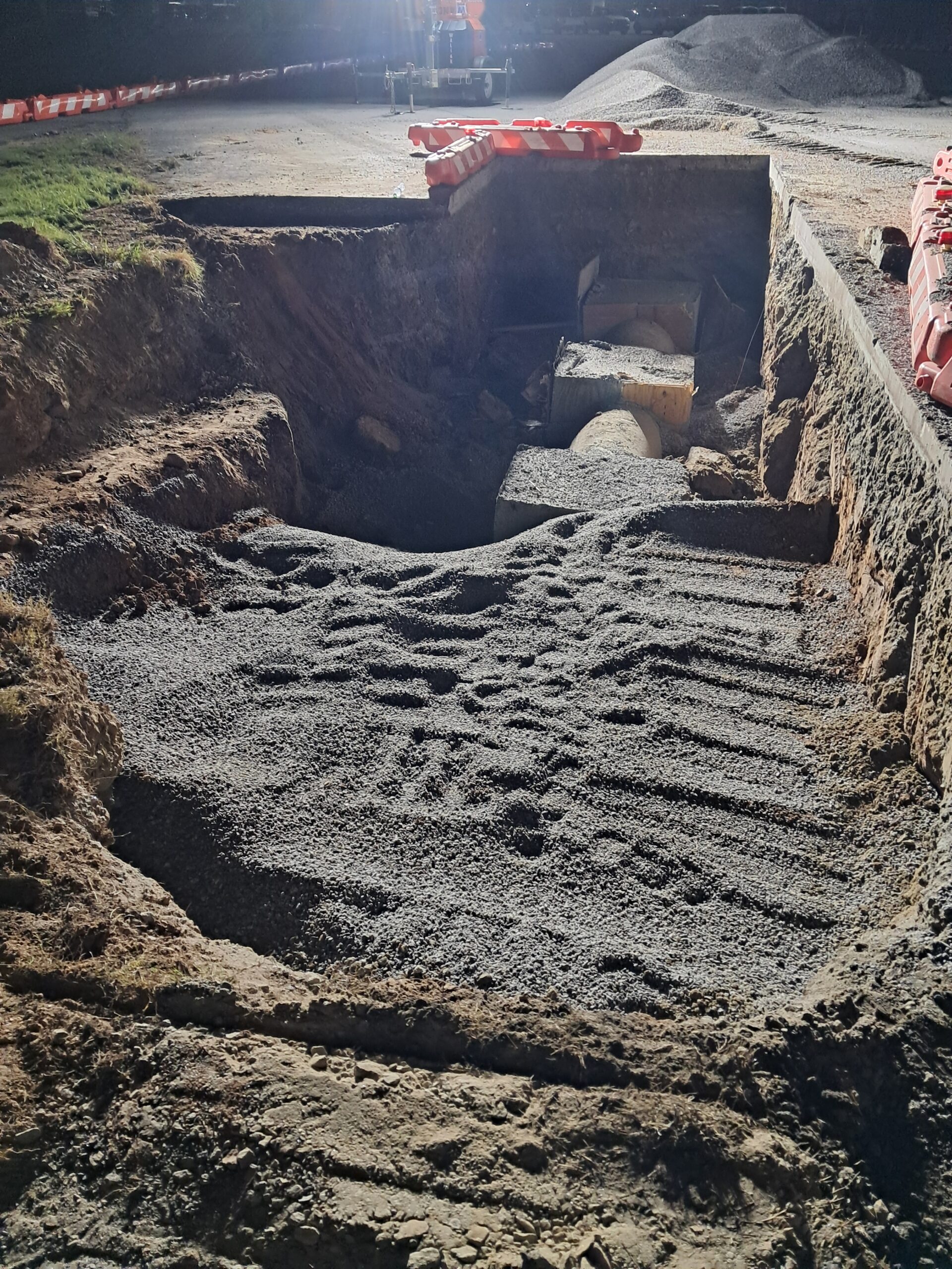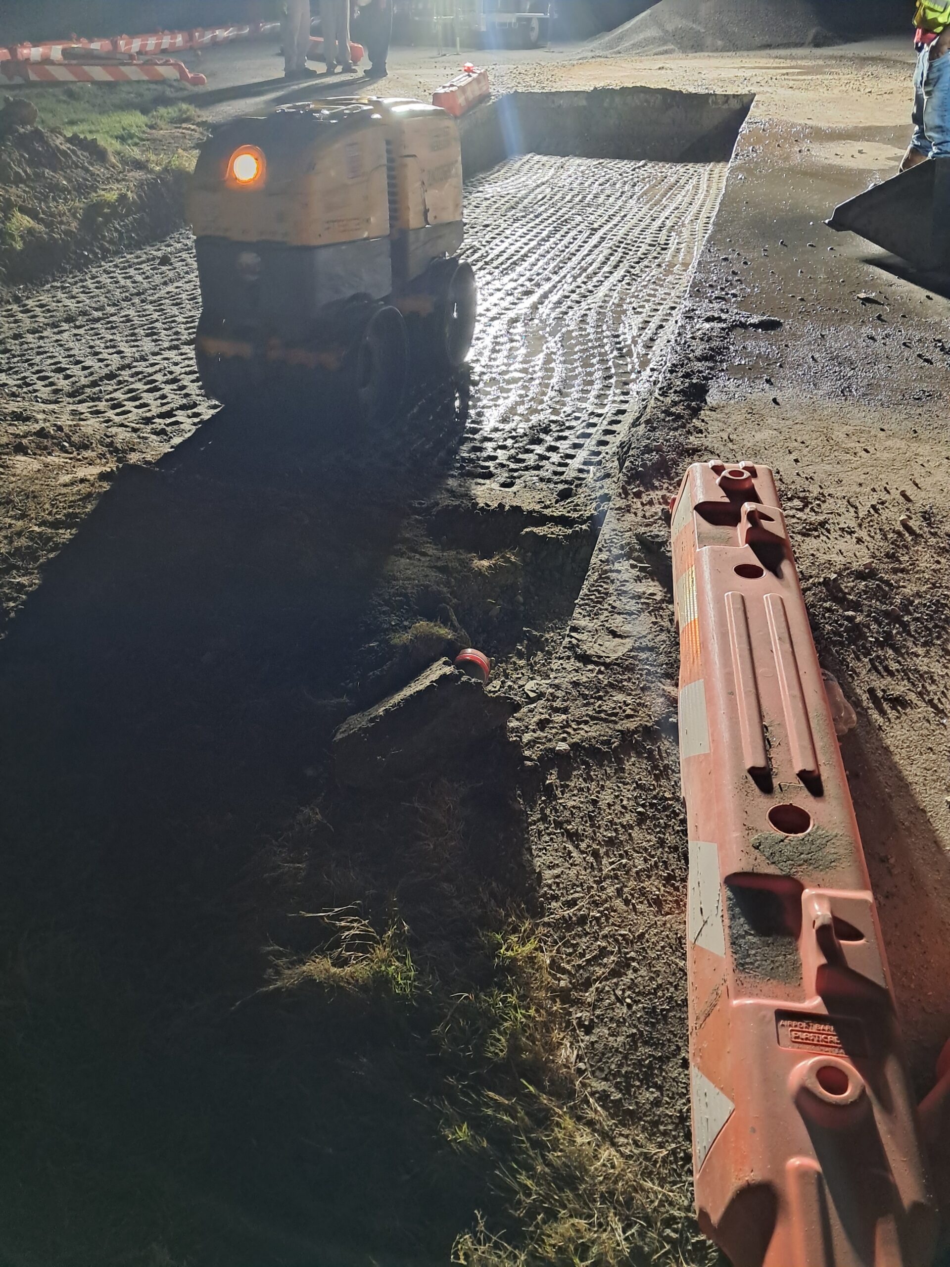 Our ASEC representative arrived on site and found that the placement of Graded-Aggregate-Base (GAB) was underway. The third layer placed was compaction tested using a nuclear density gauge with the QA technician present. Test results met job specifications for compaction.