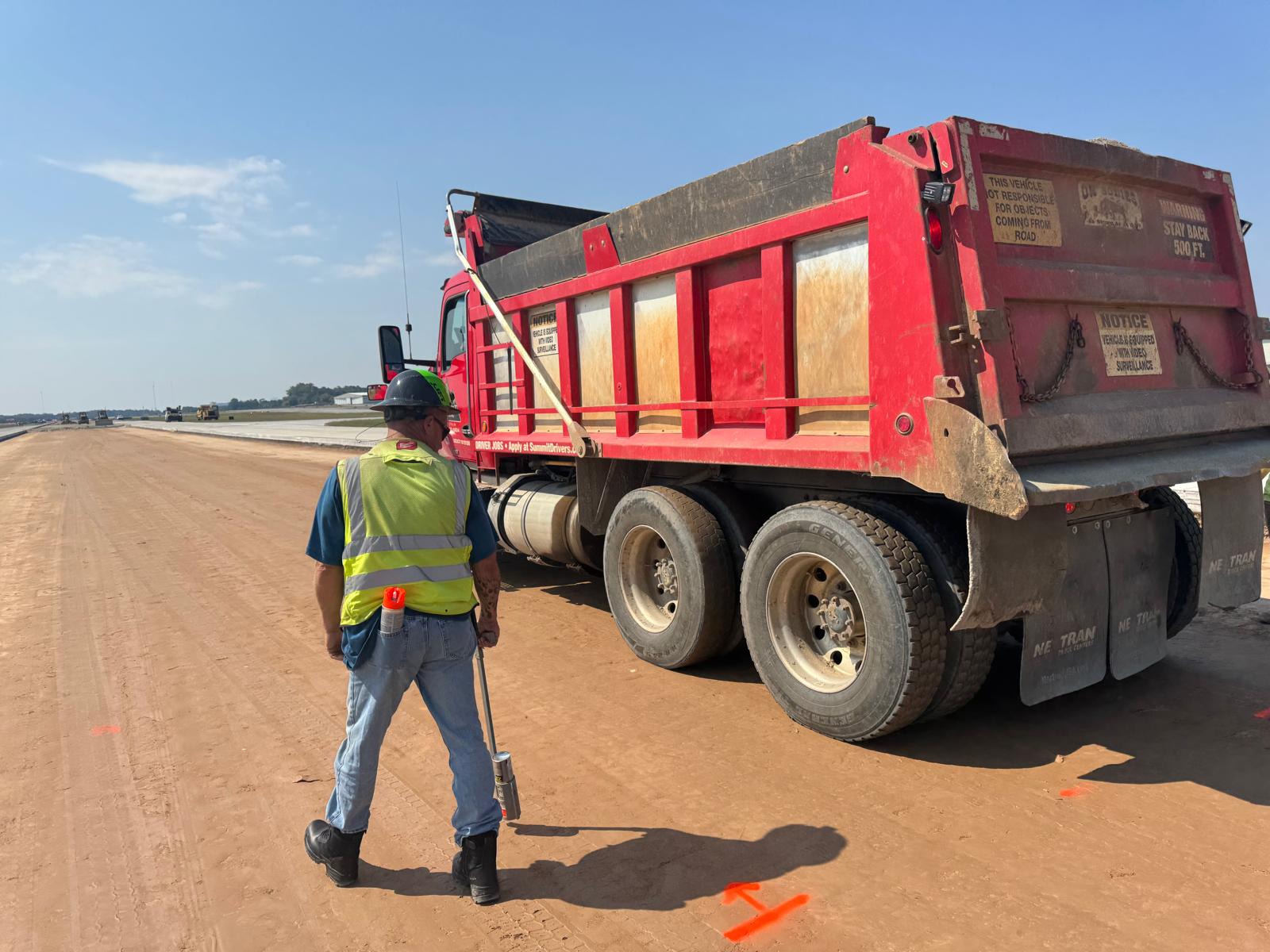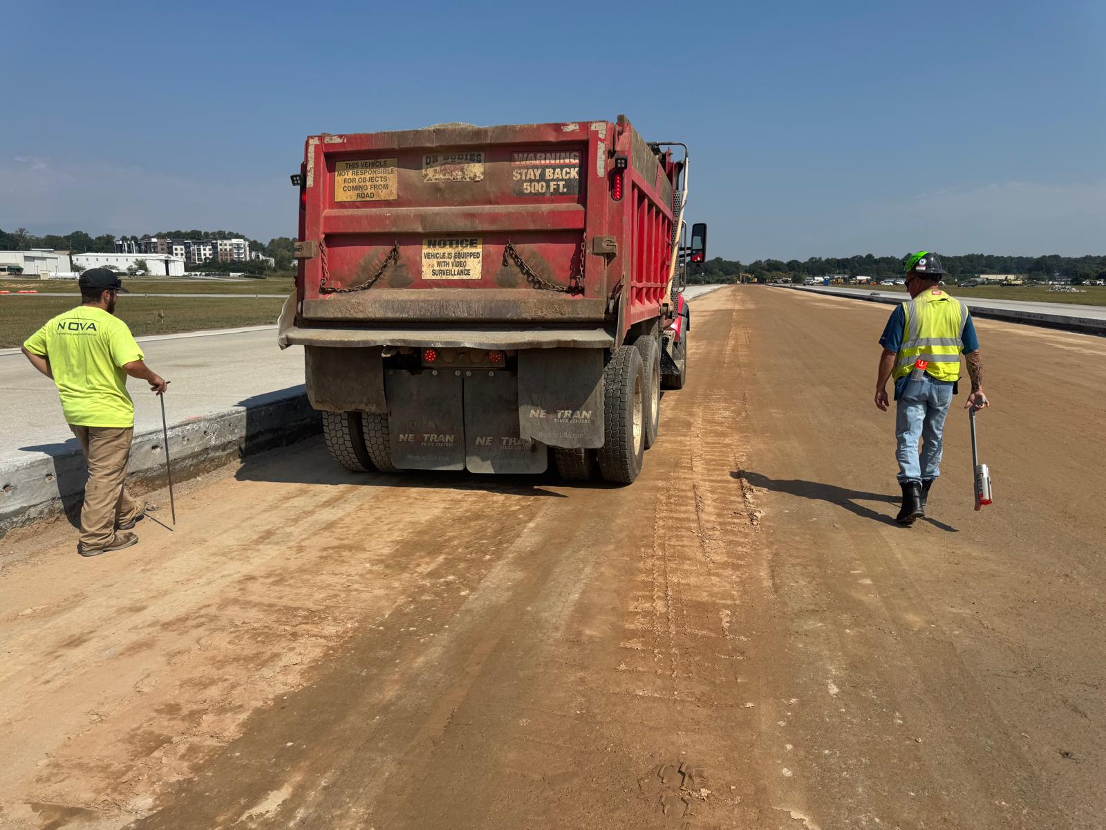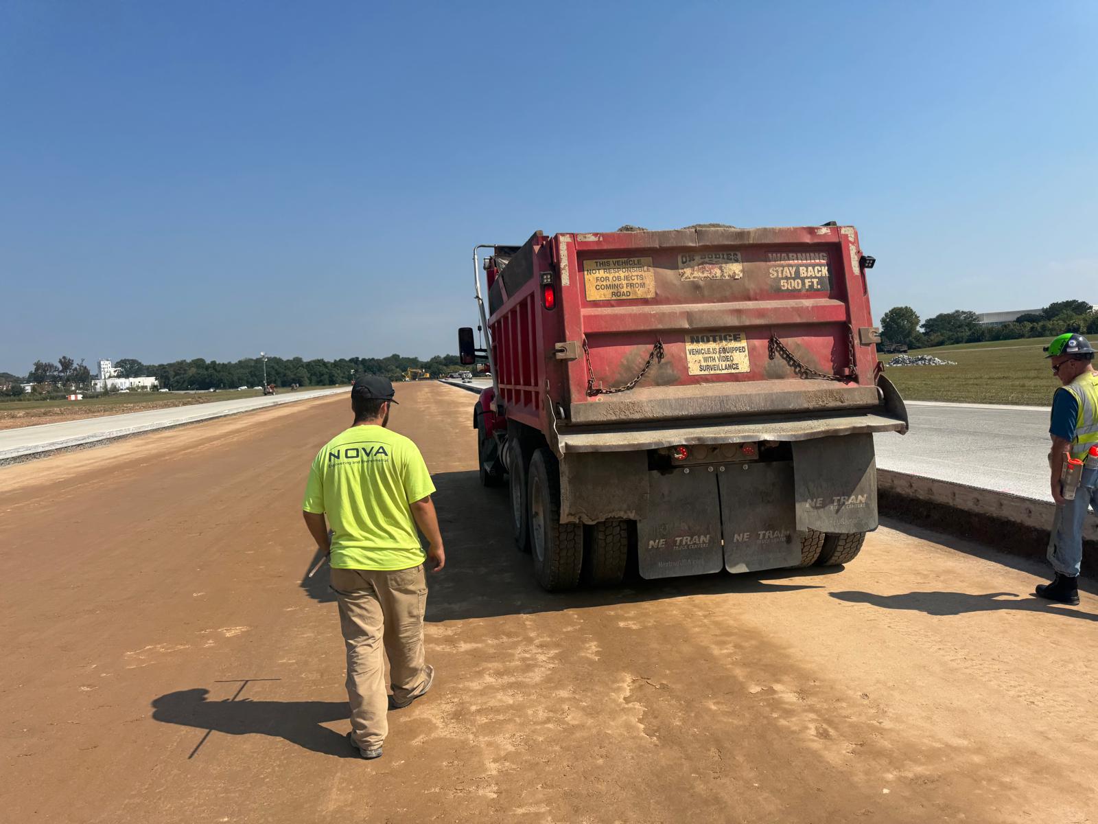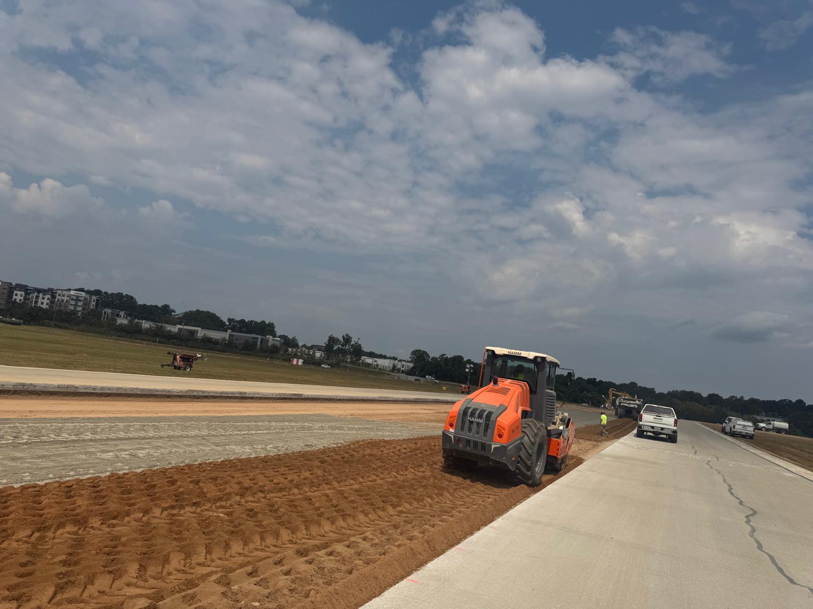 A proof-roll was performed on the subbase soil cement in Phases 1C and 1D, between STA 1068+00 and STA 1075+03, and on the finished grade of graded aggregate base (GAB) in Phase 1B, from STA 1047+63 to STA 1064+40. A fully loaded tandem axle truck was used for the proof-rolling. Multiple passes were made across the finished grade GAB, and no severe yielding or deflection was observed during this portion of the activity. However, in the soil cement, some yielding and deflection were noted in several areas, specifically measuring (32 ft. × 88 ft.), (20 ft. × 133 ft.), (42 ft. × 13 ft.), (117 ft. × 27 ft.), (17 ft. × 19 ft.), and (43 ft. × 47 ft.). It was recommended that these areas be remixed with an additional 20–25 pounds of cement per square yard to meet specification requirements.