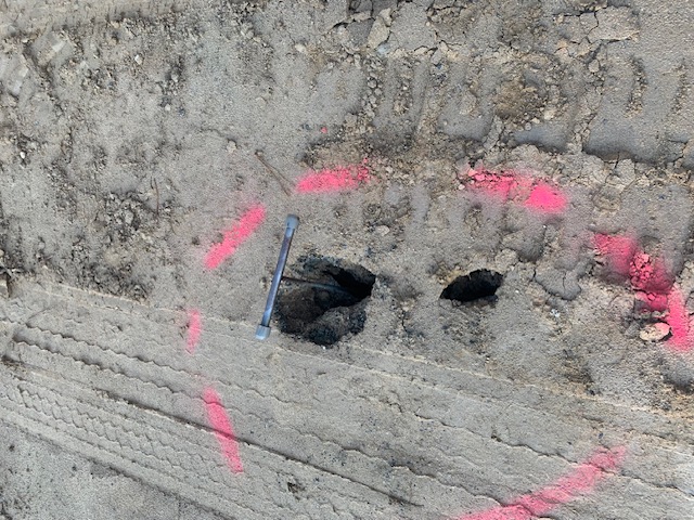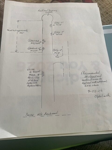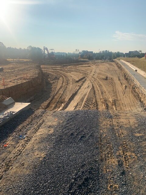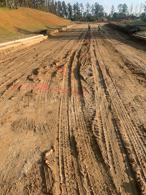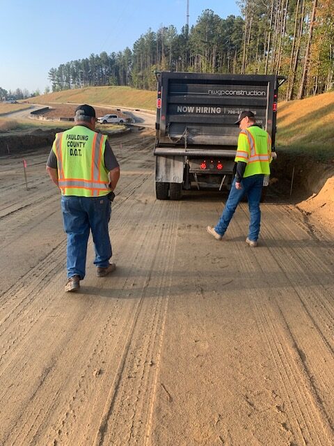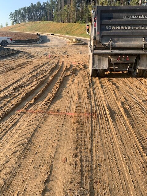 On the above date our representative of AS Engineering & Consulting was on site to observe proof-rolling of the entrance and exit drives’ subgrades after a rain event on 9/21/25. The subgrade soils were observed using a loaded tandem dump truck making two passes over all areas and probing deficient areas with a rounded end steel rod with the members from NWGP(paving) and the Paulding County inspector present. Starting at the north end temporary culdesac and area of approximately 230′ in length by 50′ in width was identified. Several isolated deficient areas were designated for remediation by clipping -3″ to -6″ to be replaced by additional GAB stone. One isolated area had three small rock drill voids which was recommended to be filled with #89 stone. See attached pictures and sketch for approximate deficient areas.
