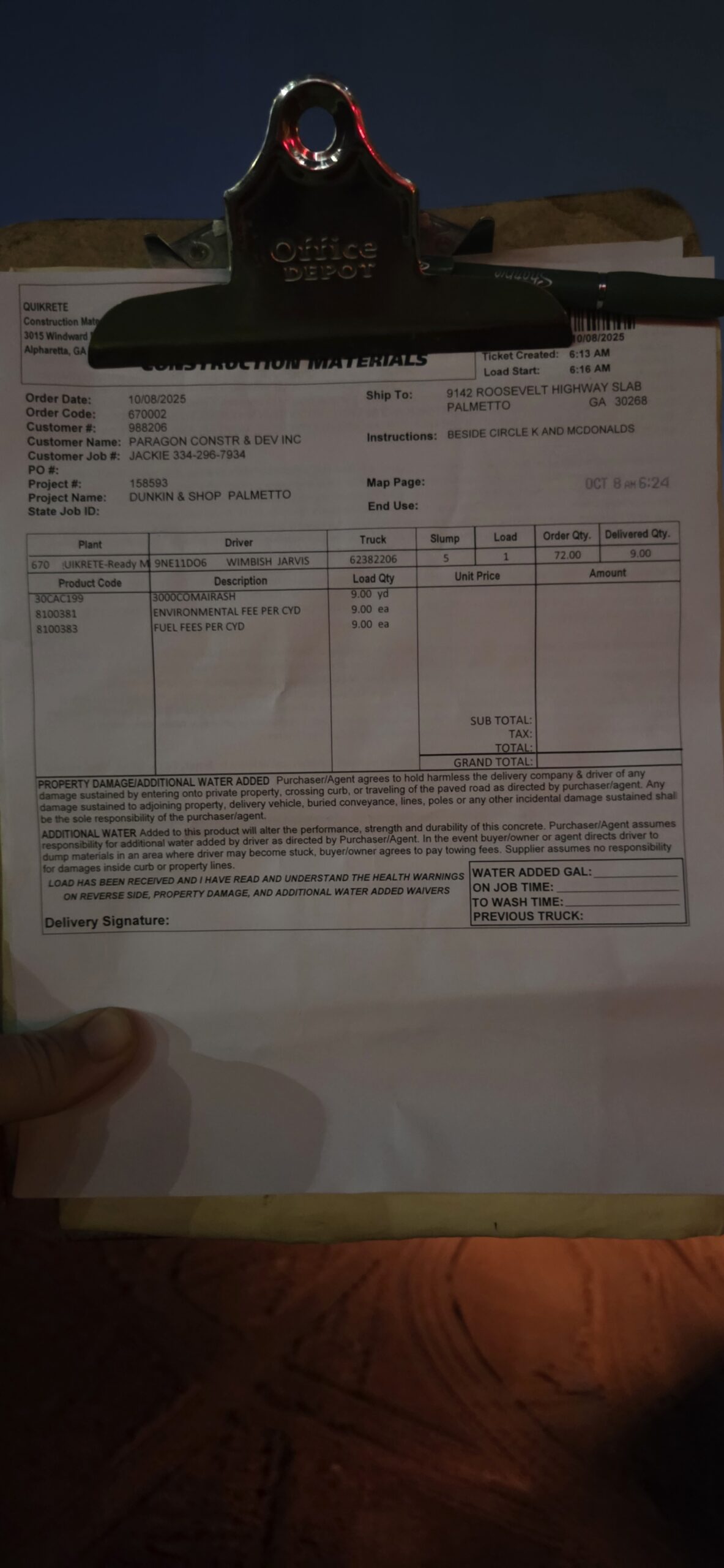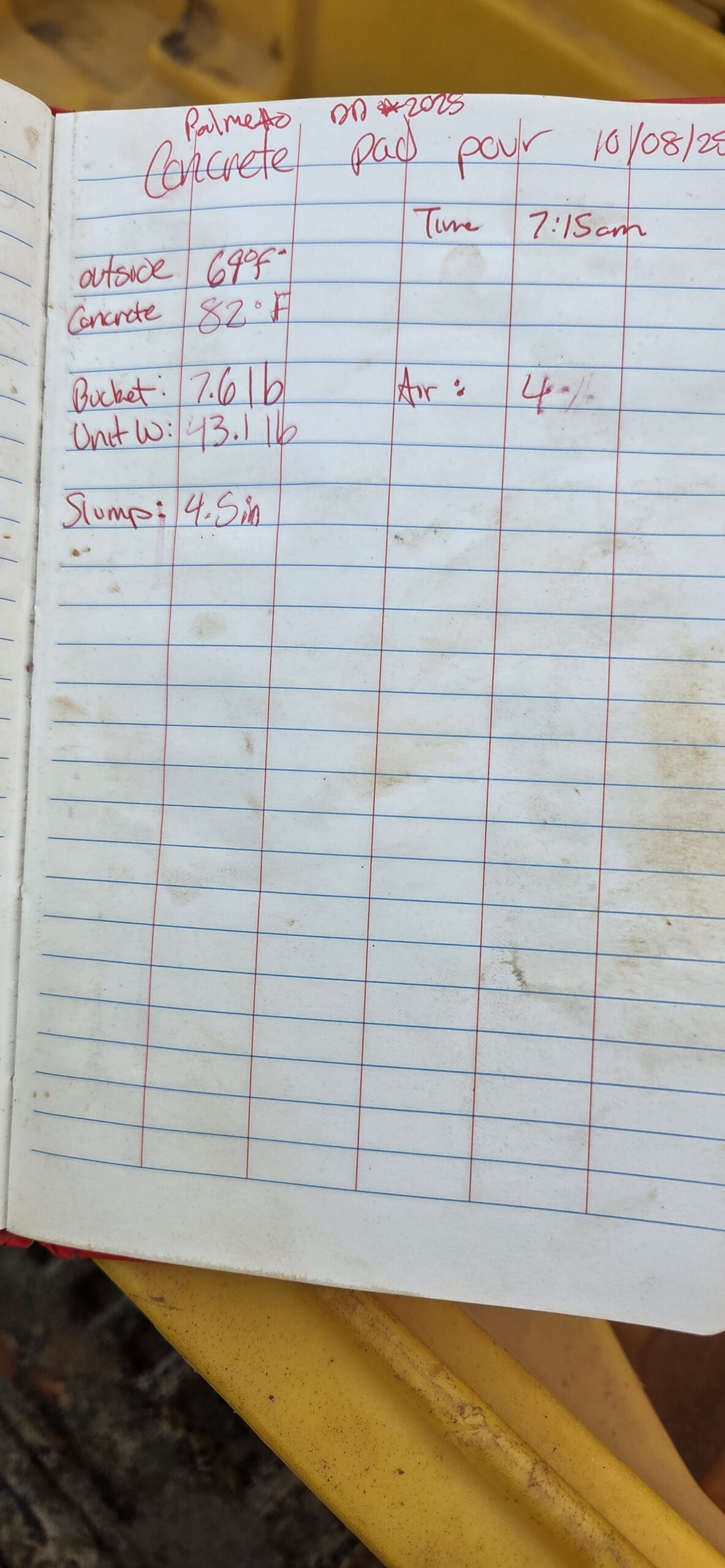 Our ASEC representative performed concrete testing for the monolithic slab on grade and cast one (1) set of concrete test cylinders. These cylinders were stored onsite in a cooler for curing overnight. These cylinders will be delivered to the lab on the next workday for additional curing/testing.