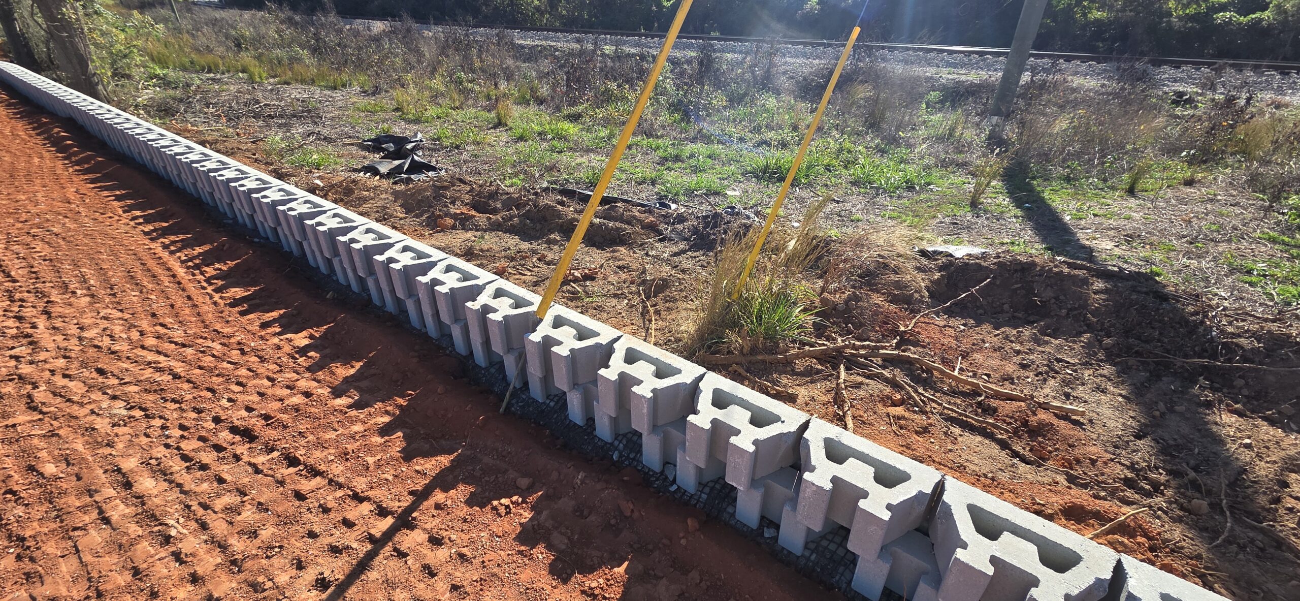 The wall contractors (Orion) continued placing backfill along the retaining wall in approx. 6in to 8in lifts. Density testing was conducted as requested, and all test results were provided to the contractor. Some areas along the wall stairstep up and testing locations display different elevations to adjust for wall size (as stated in the density test reports). As shown in the below pictures, the retaining wall runs in-between the telephone support lines. It was the contractor’s decision to continue with the installation of the wall, and to cut their blocks around the support lines.