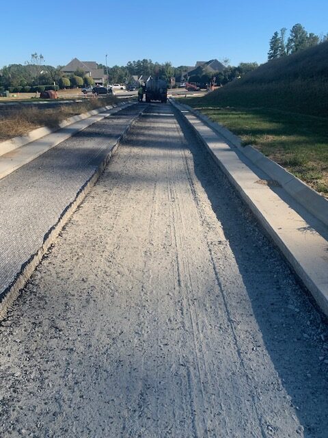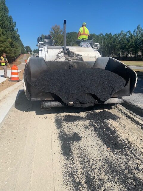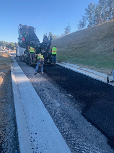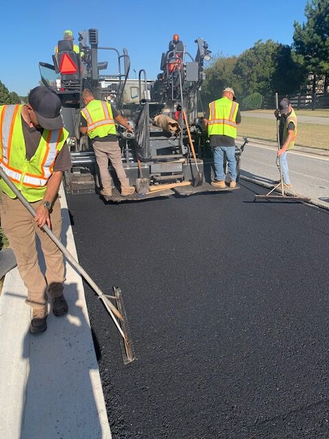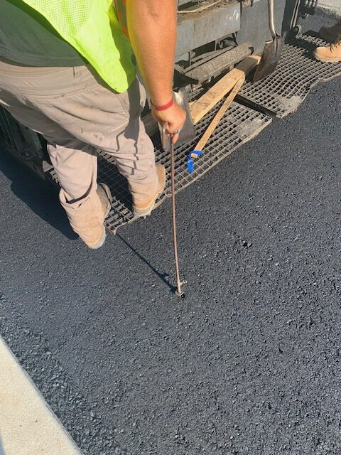 On the above date our representative was on site to observe asphalt paving located at the east and west sides of the deceleration lanes on Seven Hills Boulevard. Placing also began at the milled area of recommended repair for the exit drive lane. The paving contractor NWGP placed 170.83 tons of 25 mm base asphalt mix. The writer observed asphalt depths along the curb lines/saw cut edge along Seven Hills blvd. The thicknesses varied from 7.0″ to 7.75″. The pavement depths were also observed to be measured by tape measure and contractor paving metal rod stick. It was observed having at least 4″ of 25 mm base mix in place. The contractor also placed 203.29 tons, 11 loads of 19mm binder mix at the drive entrance and exit drive. The writer also observed edges being tacked with liquid asphalt. Concrete curb repairs were also observed at the drive exit lane.