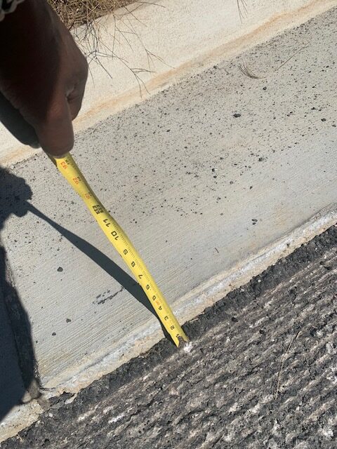 Milled repaired area at exit lane showing depths of 7.25 to 7.50" outside edge and 4" inside