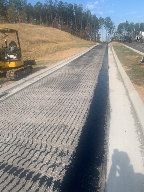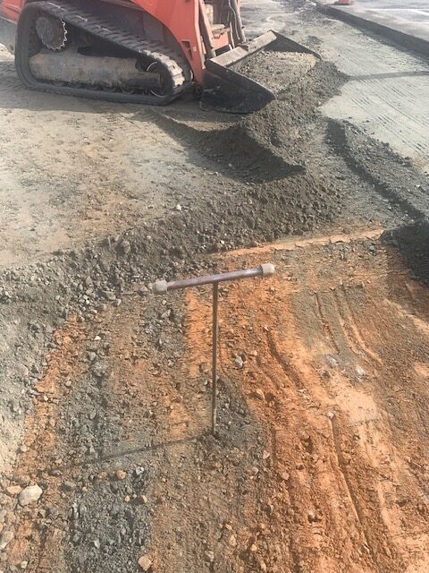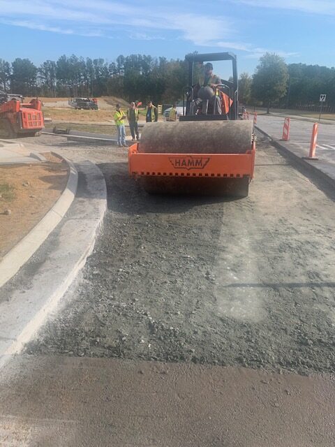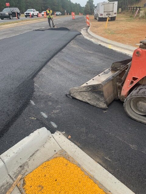 On the above date our representative was on site to observe the continuing of asphalt paving and repairs according to project plans and specifications. The writer observed the paving contractor continue placing 25mm base mix for the east side deceleration lane and exit after and additional recommended area of in-place asphalt was saw cut and removed. Also, two recommended subgrade areas located at the exit lane were repaired as requested by clipping -4″ and re placing with additional 25mm base asphalt. The -4″ replacement which was under the old exiting pavement was lessened because of unknown utilities in the area (an area of approximately 10’x 7’x 4″ and 9’x 5’x 4″). The contractor also placed 19mm binder mix for the east and west sides of the deceleration lanes and also at the exit lane which was repaired by milling and curb replacement. The contractor also poured 1 cubic yard of class B concrete at the west side deceleration island. Binder was also topped off at the deceleration lanes with 12.5mm asphalt mix. In addition, the writer observed preparation procedures for cleaning areas prior to placing tack coat and to perform temperature checks of fresh asphalt (295, 305 and 310 degrees, Fahrenheit). Approximately 10 tons of 12.5mm asphalt mix was needed to complete topping for the exit lane. Total asphalt tonnage placed today: 25mm base= 57.79 tons, 19mm binder = 170.67 tons and 12.5mm topping = 112.62 tons.
