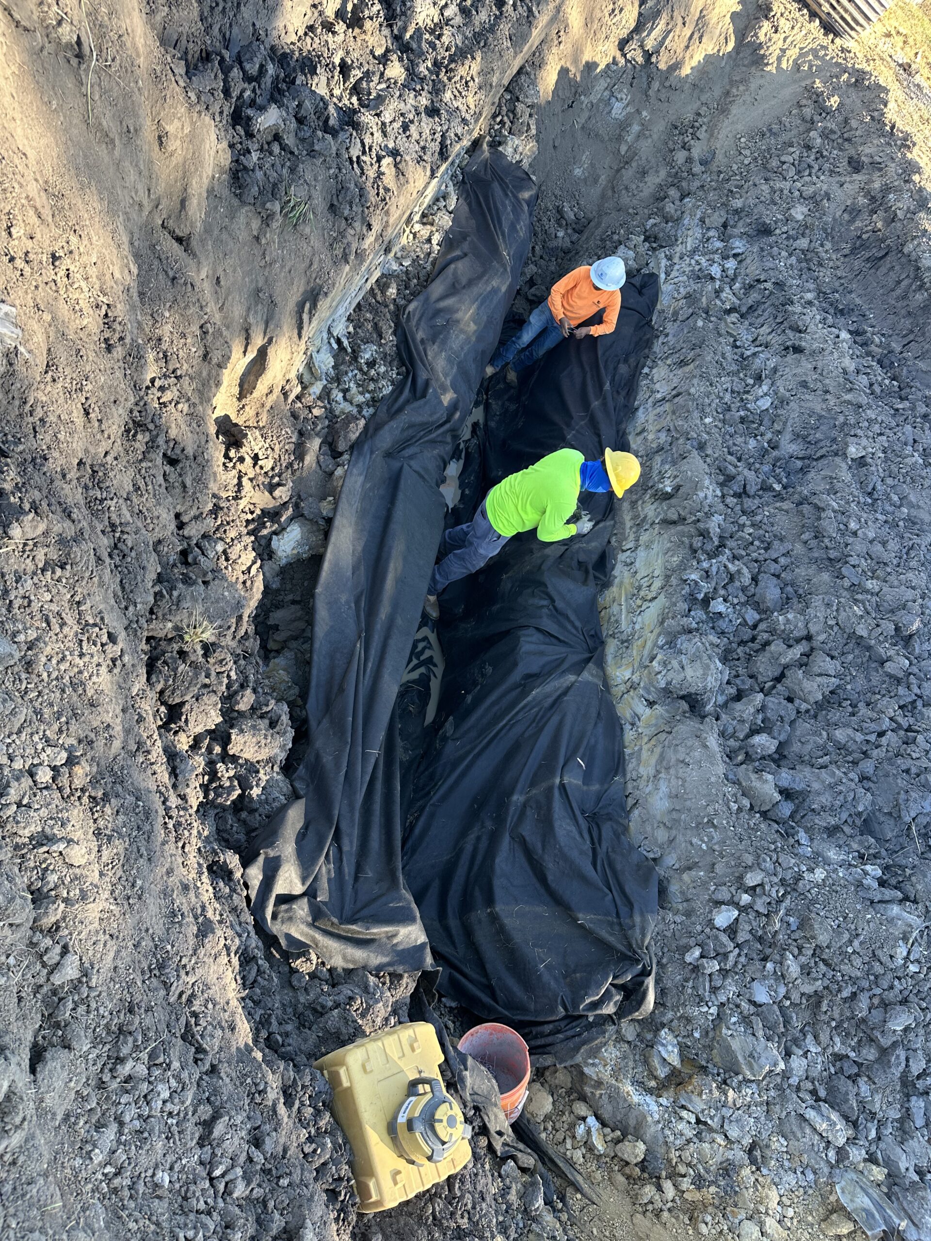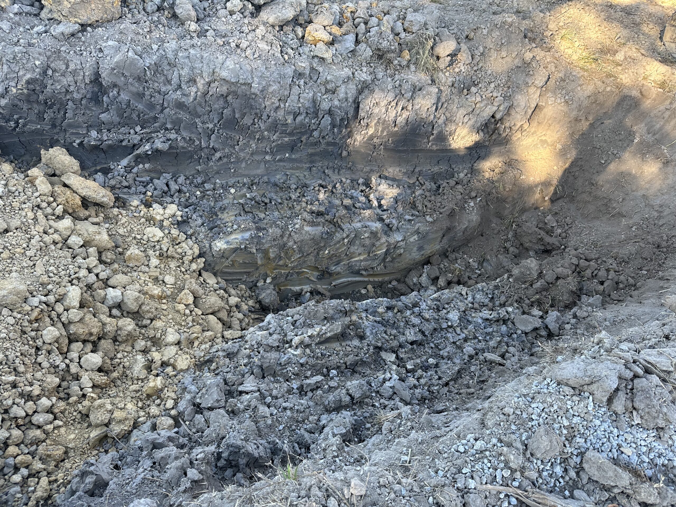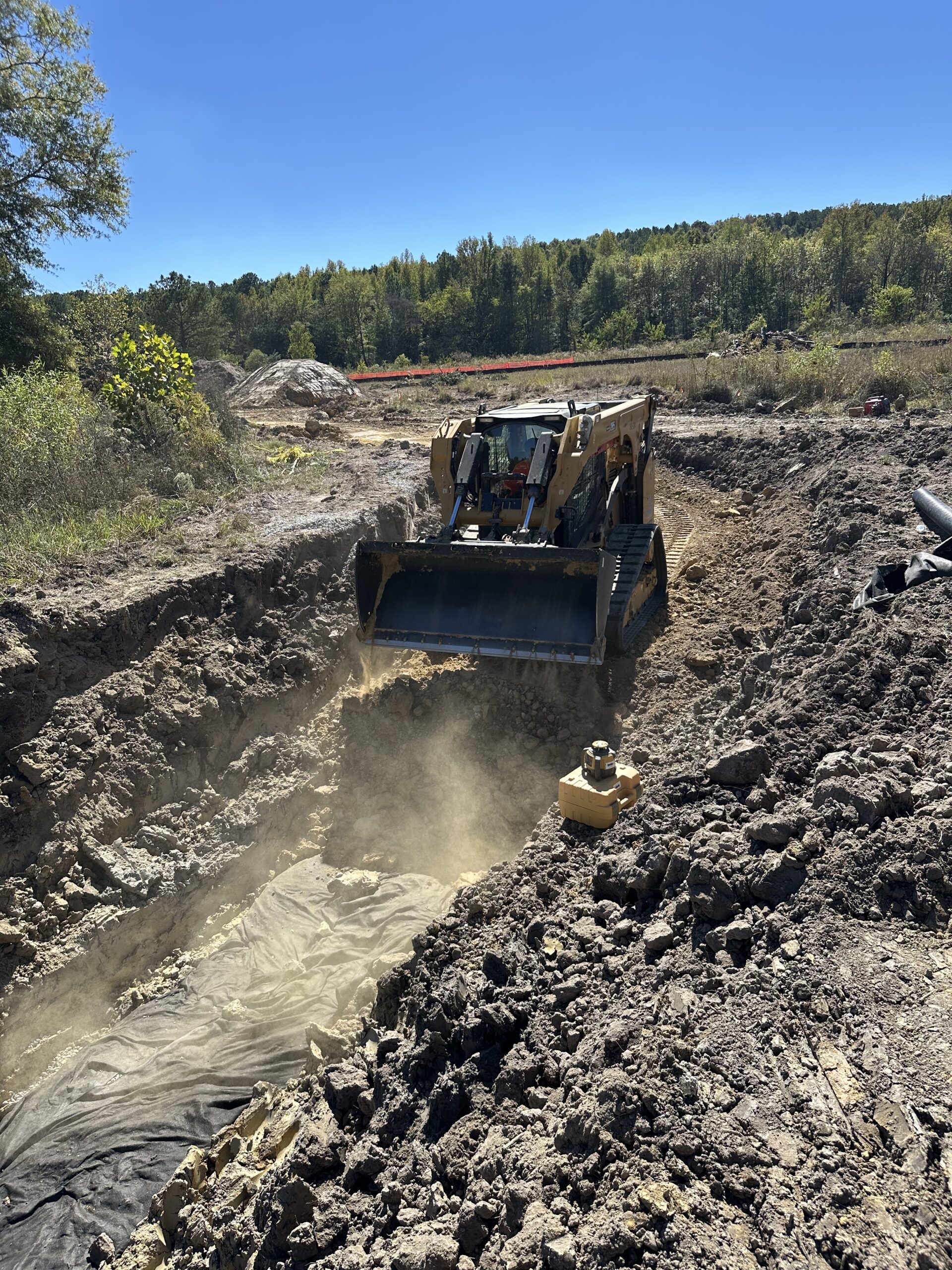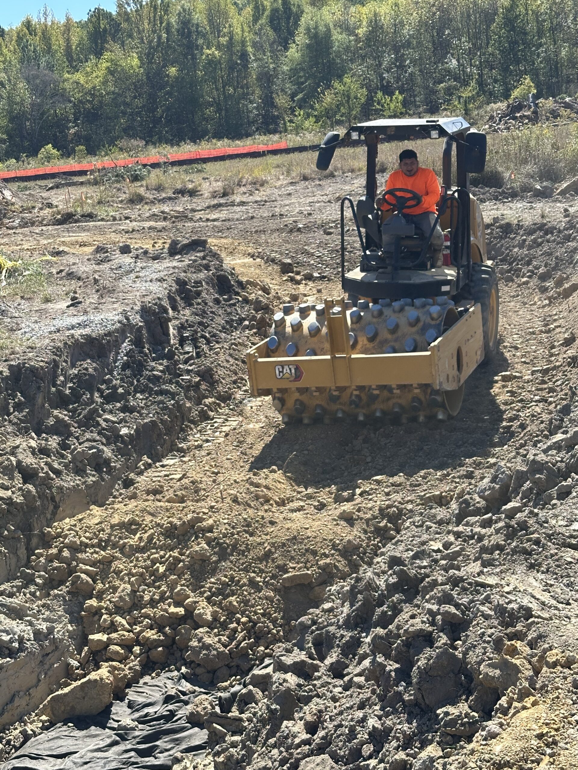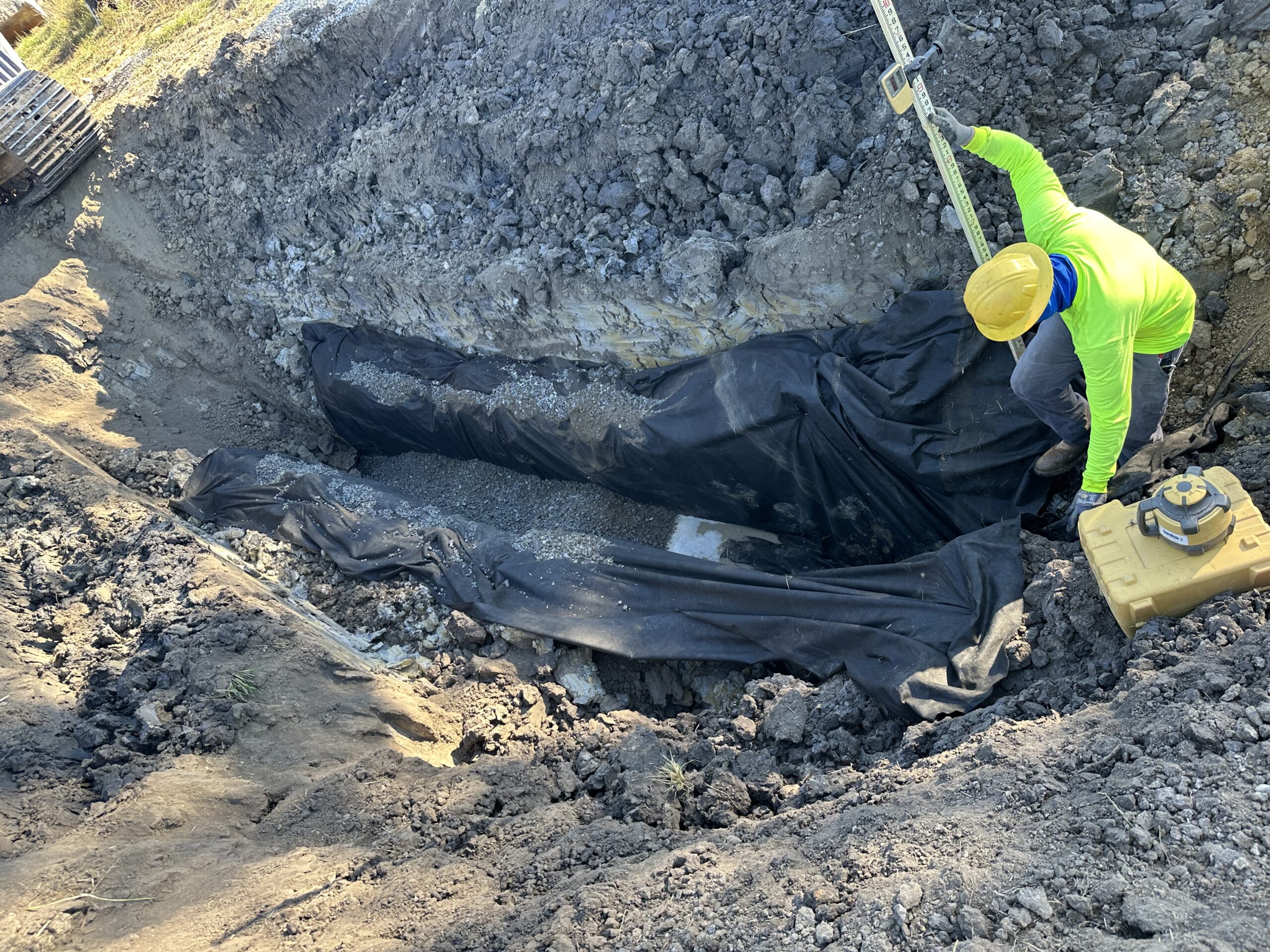 Excavation and installation continued today at the Cassville Road tract for the French drain (“burrito wrap”) project. Work began near point C3 and progressed up to the area between C4 and C5 as shown on the site plan. The excavation reached a depth of roughly 10 to 12 feet; 3 feet of gravel placed 6 inches from the excavation bottom. The drain was 20 feet in length and 6 inches in diameter, sheet of a length of 22-24 feet. Excavators were used to remove soil to the required depth and stockpiled safely away from the trench edges. The soil was identified as mainly clay with some gravel. No groundwater or slope instability was observed at the time of excavation.