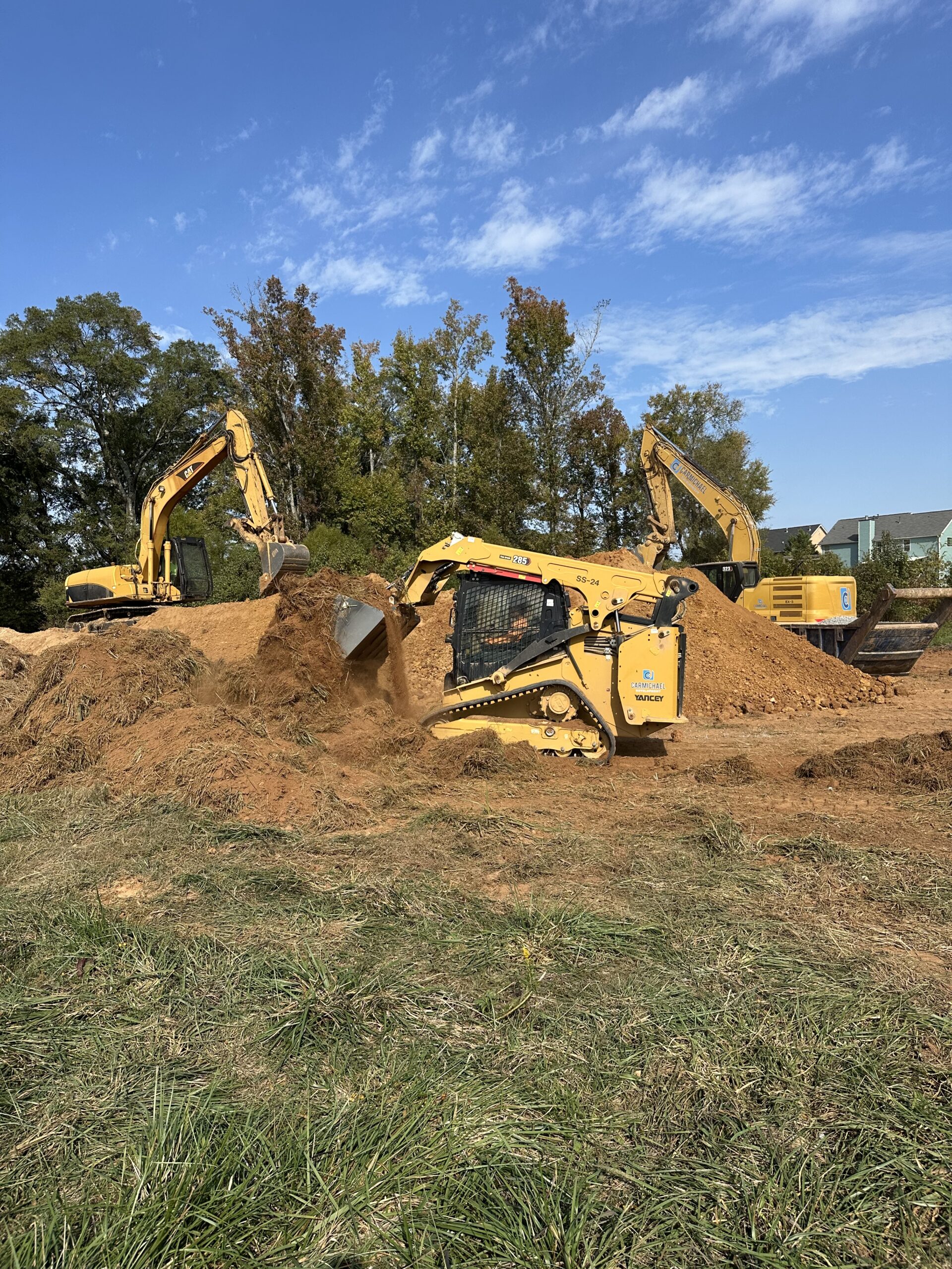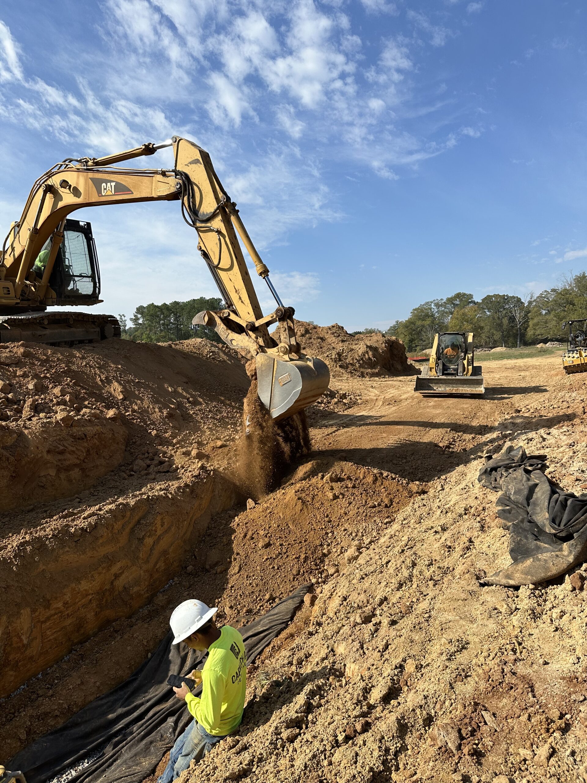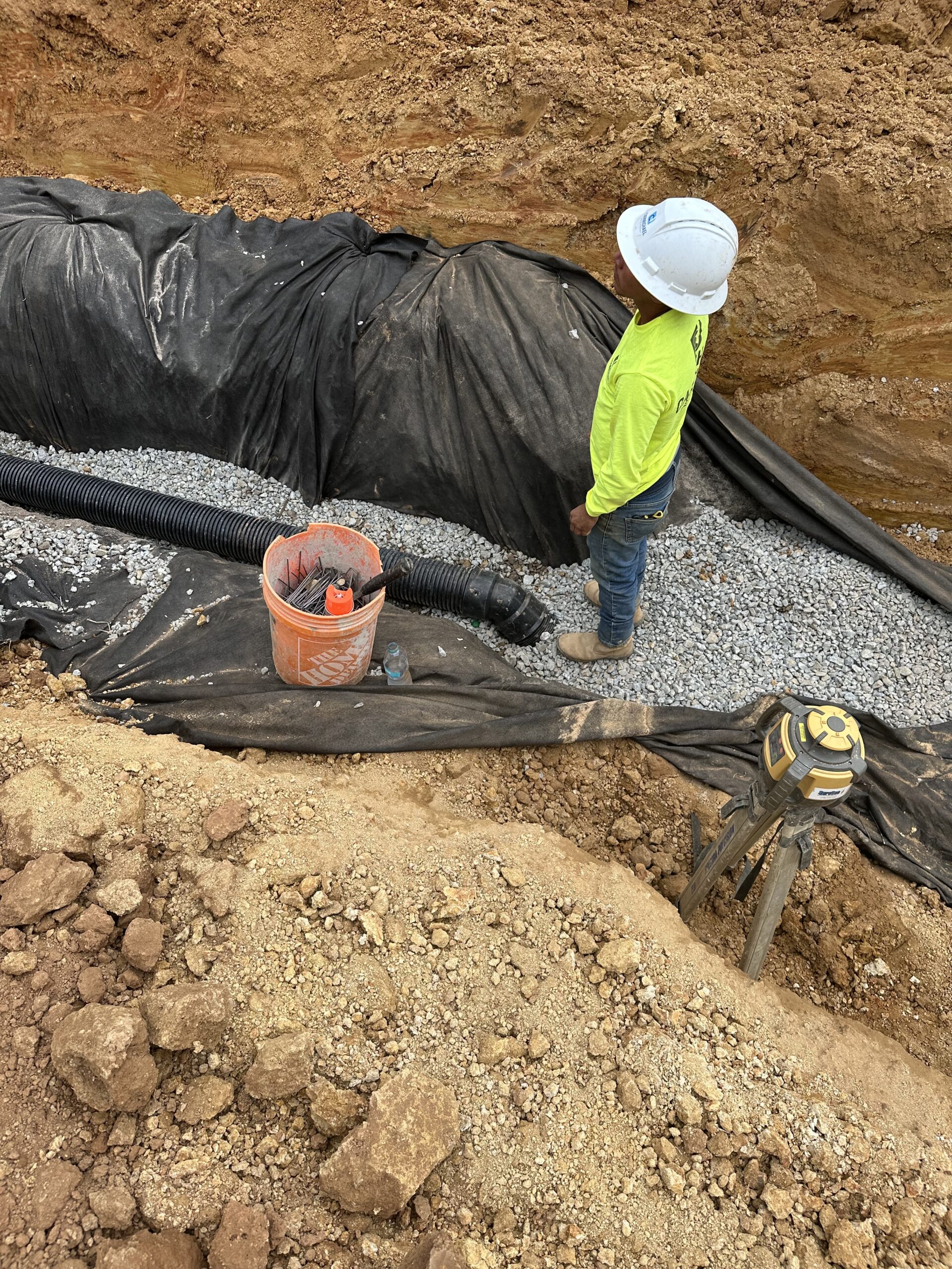 Excavation and installation continued today at the Cassville Road tract for the French drain (“burrito wrap”) project. The crew continued construction along the line between B7.1 and B7.2. Work involved excavating the trench, installing the drainage pipe, and backfilling upon completion. Alignment and slope were checked for consistency with the previously completed section. The trench was prepared with densified gravel bedding to support the pipe, and excavated soil was stockpiled in a designated area. All operations were carried out as per project specifications.