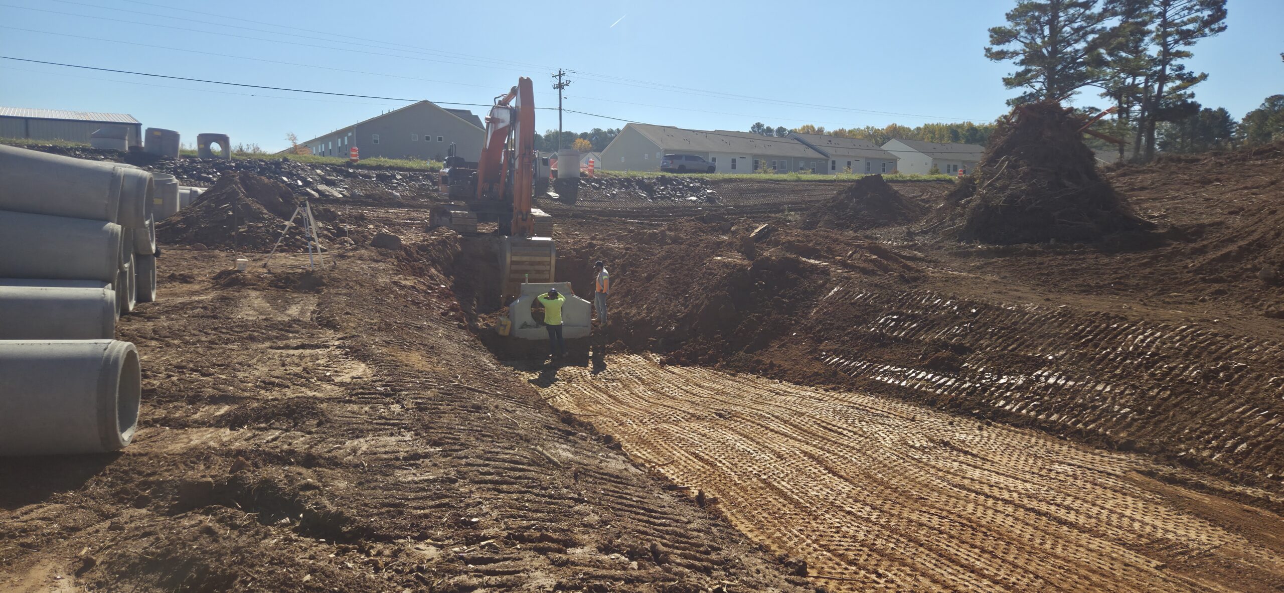 The pipe crew began installing storm lines by the deceleration lane at the entrance. The contractor placed their head wall BC1 to structure BC2. They plan to begin backfilling this structure on the following workday. ASEC will perform density testing as needed/requested.